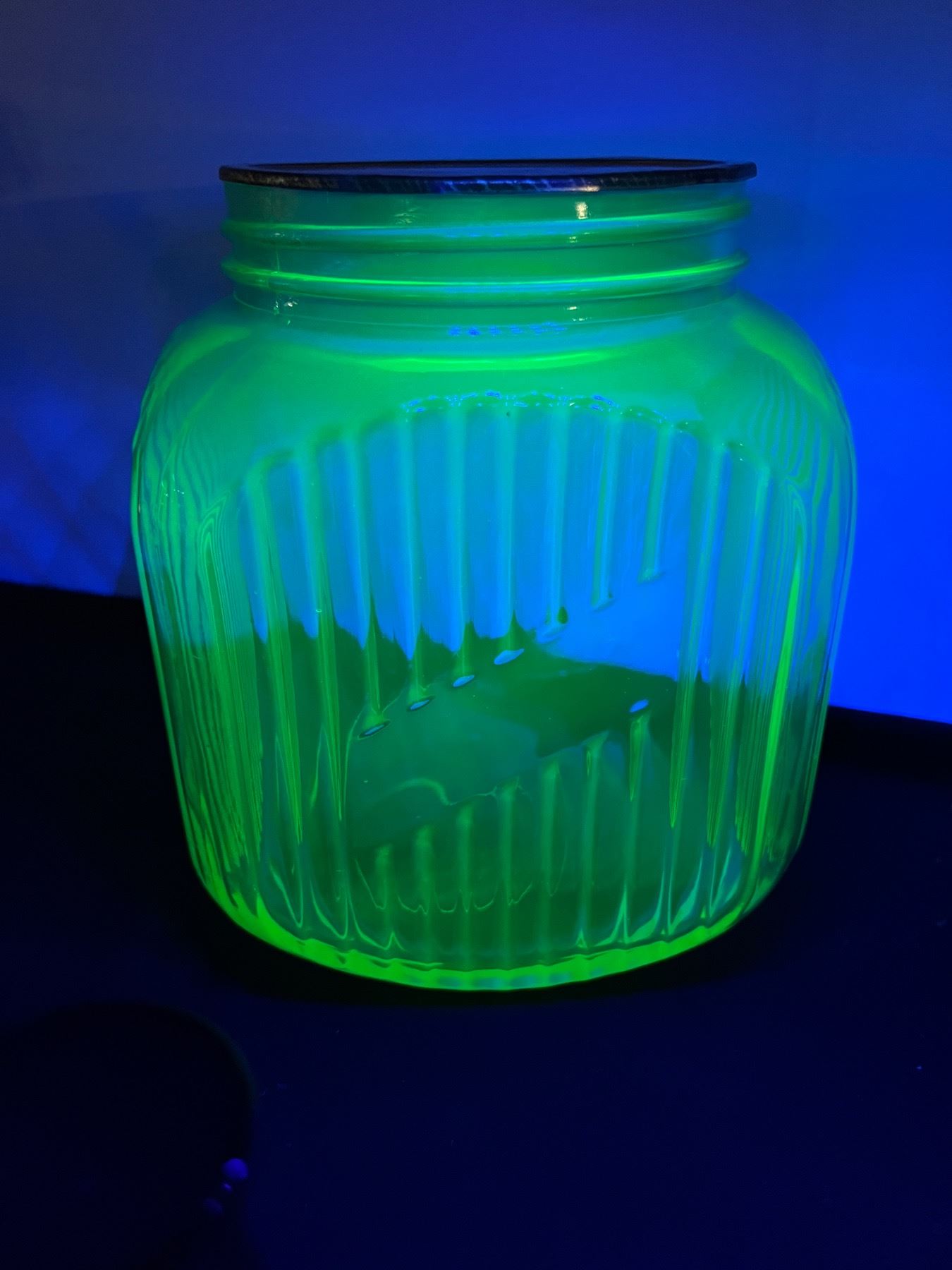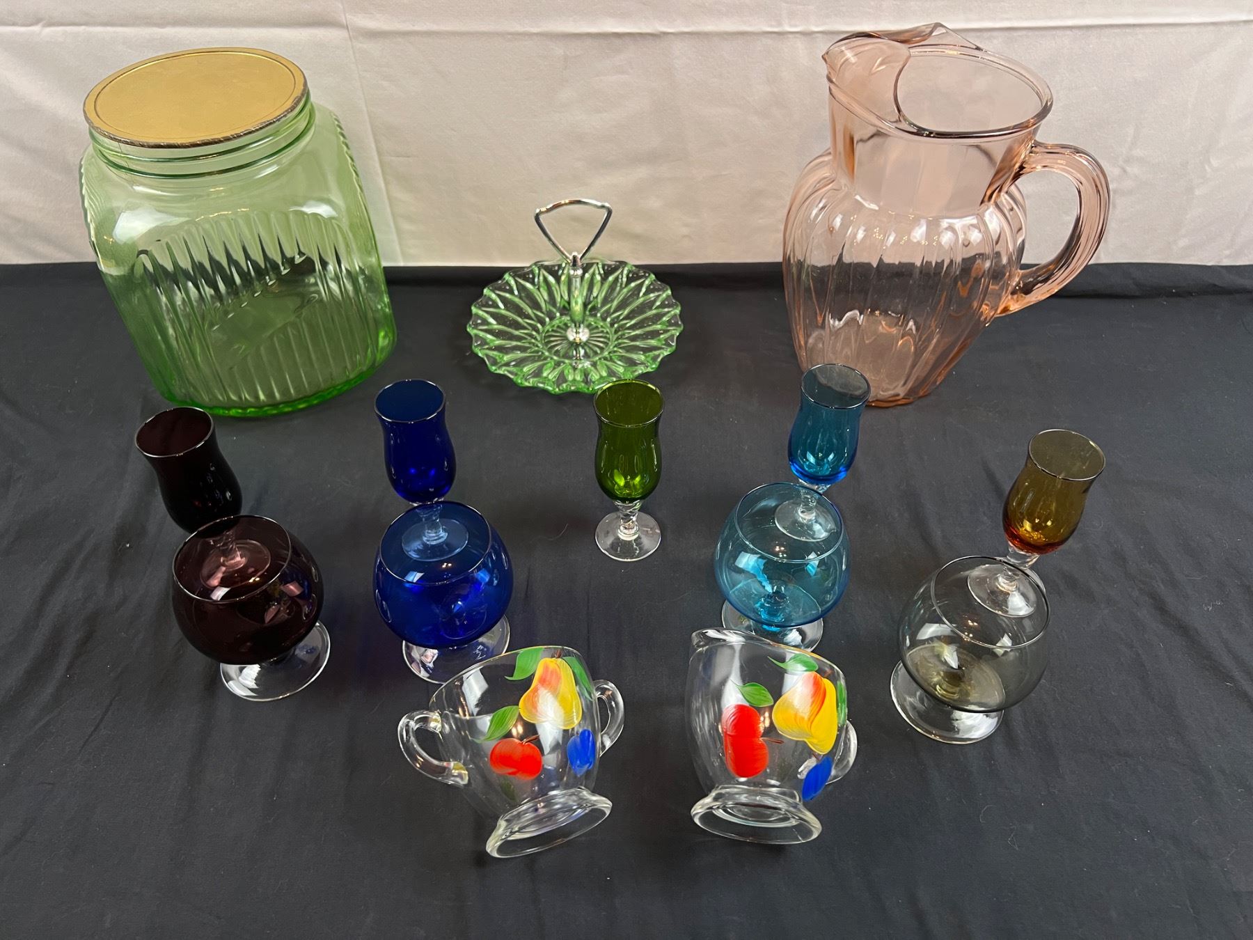 Includes a uranium glass jar (no ring for the lid) 8.5"H, Pink depression glass pitcher, etched dishes, and more
