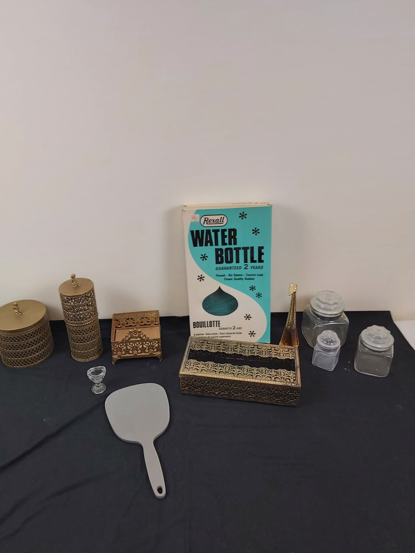 Includes, Glass eye bath, Brass like organizers (tallest is 9.5"H), Rexall water bottle, etc.