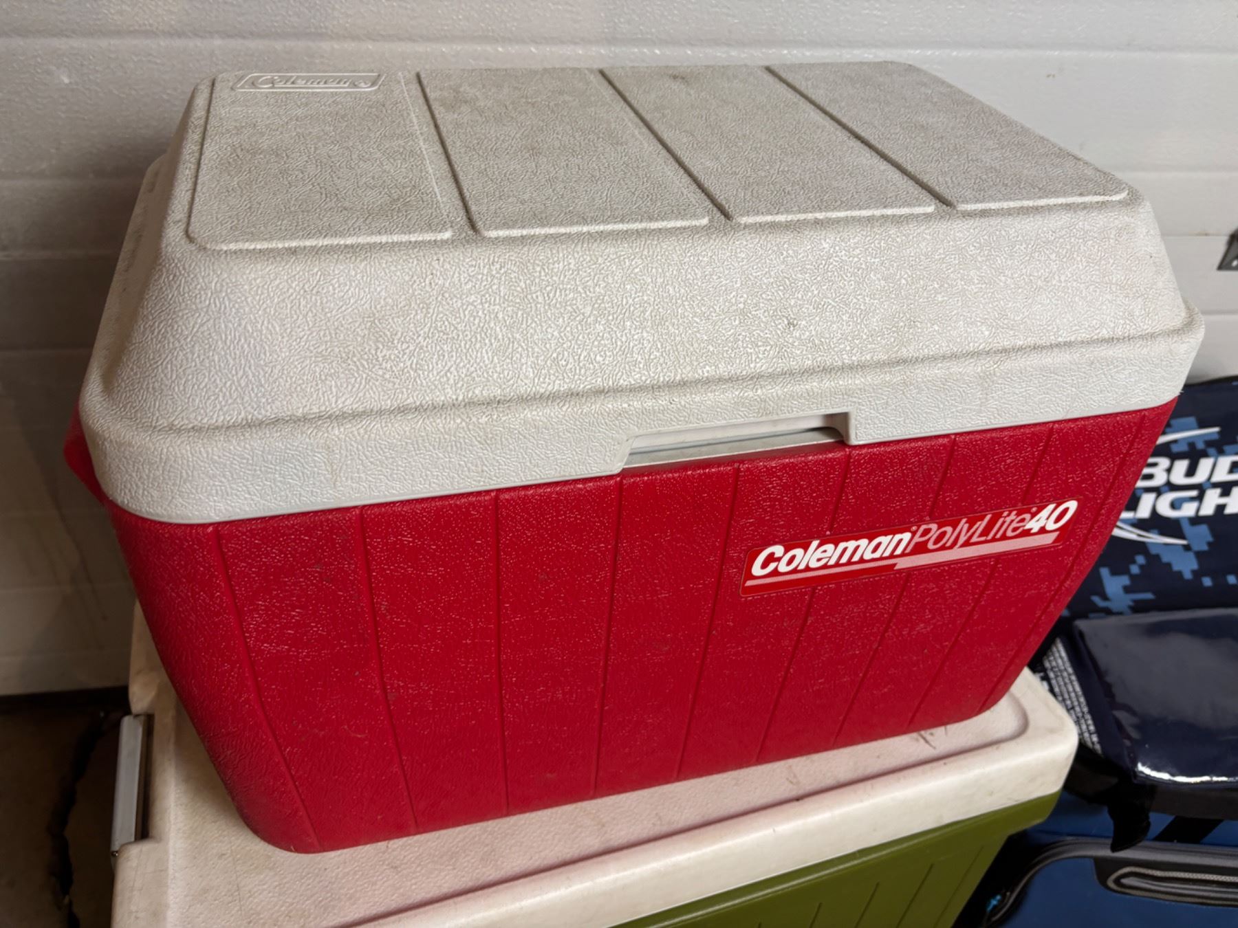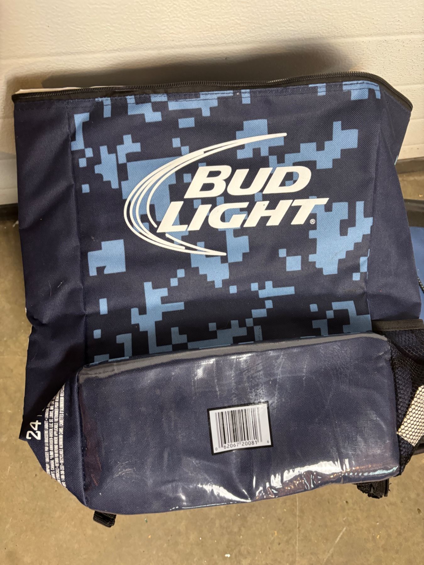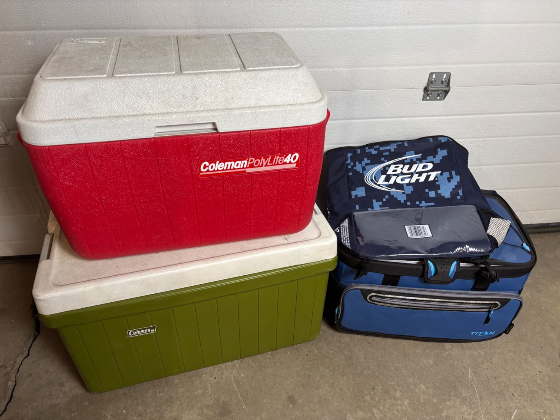 Includes, Bud Light Cooler Bag, Titan Cooler Bag, two Coleman coolers, some stains