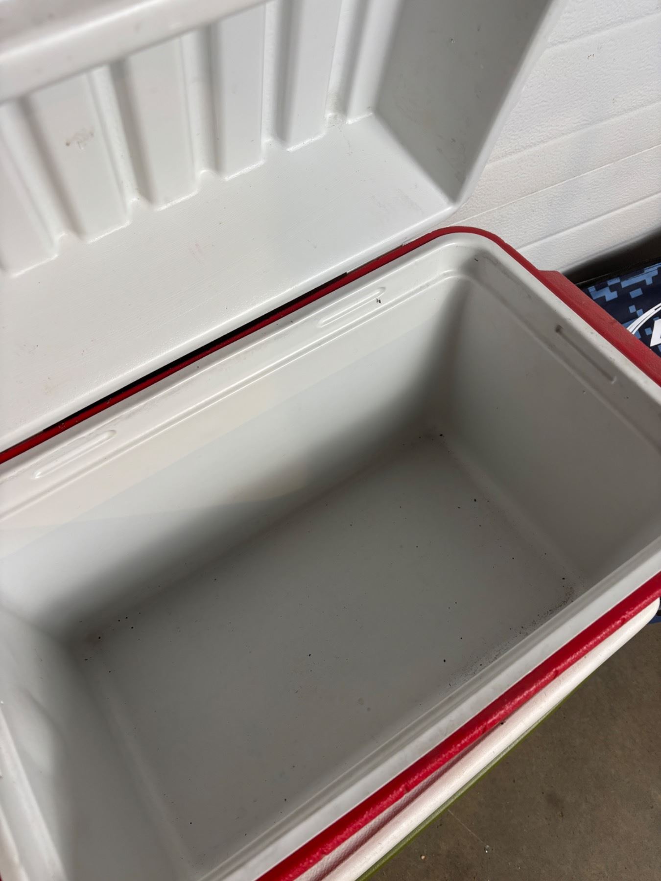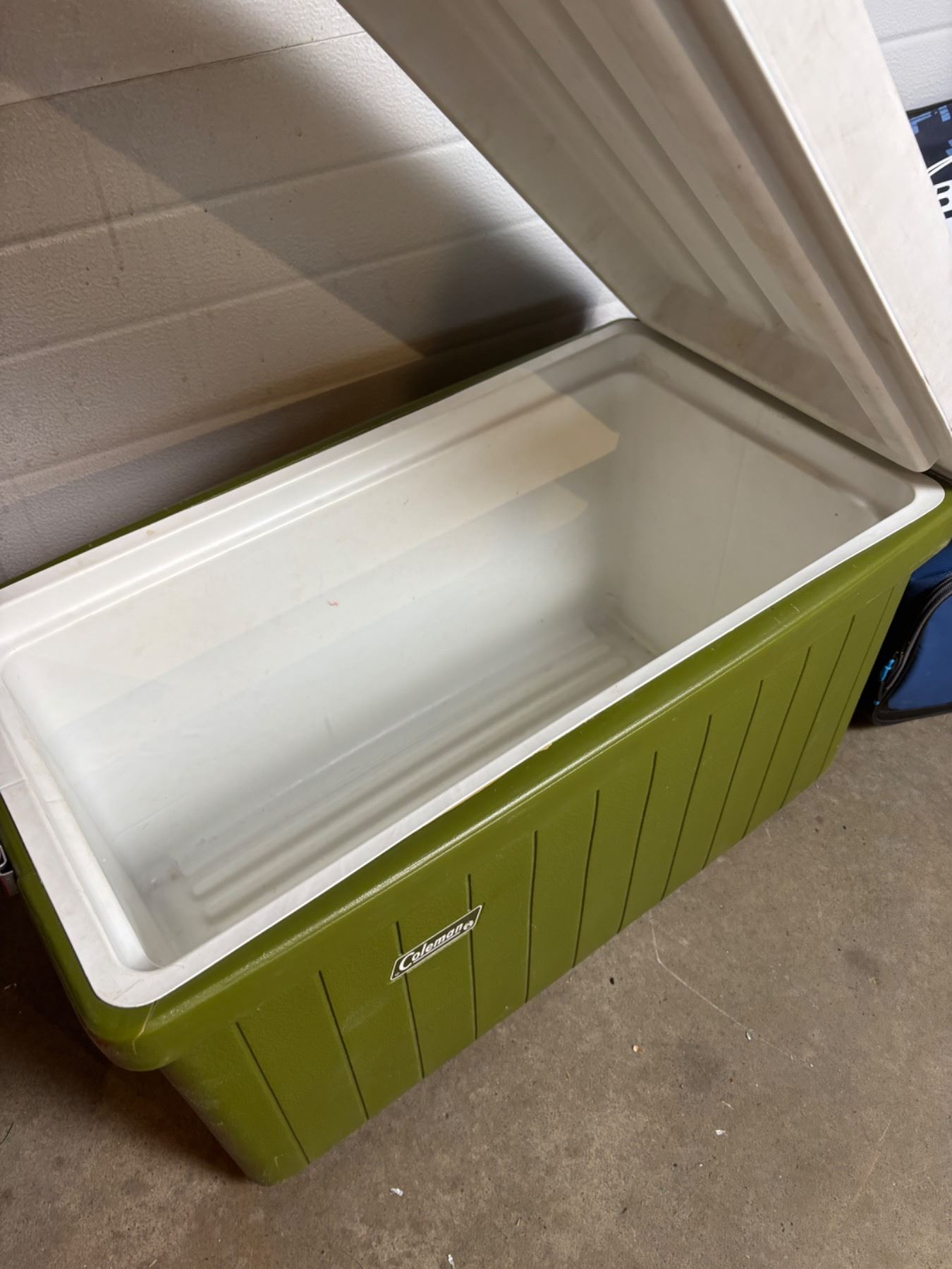 The green Coleman cooler is 25"L x 14"W x 16"H