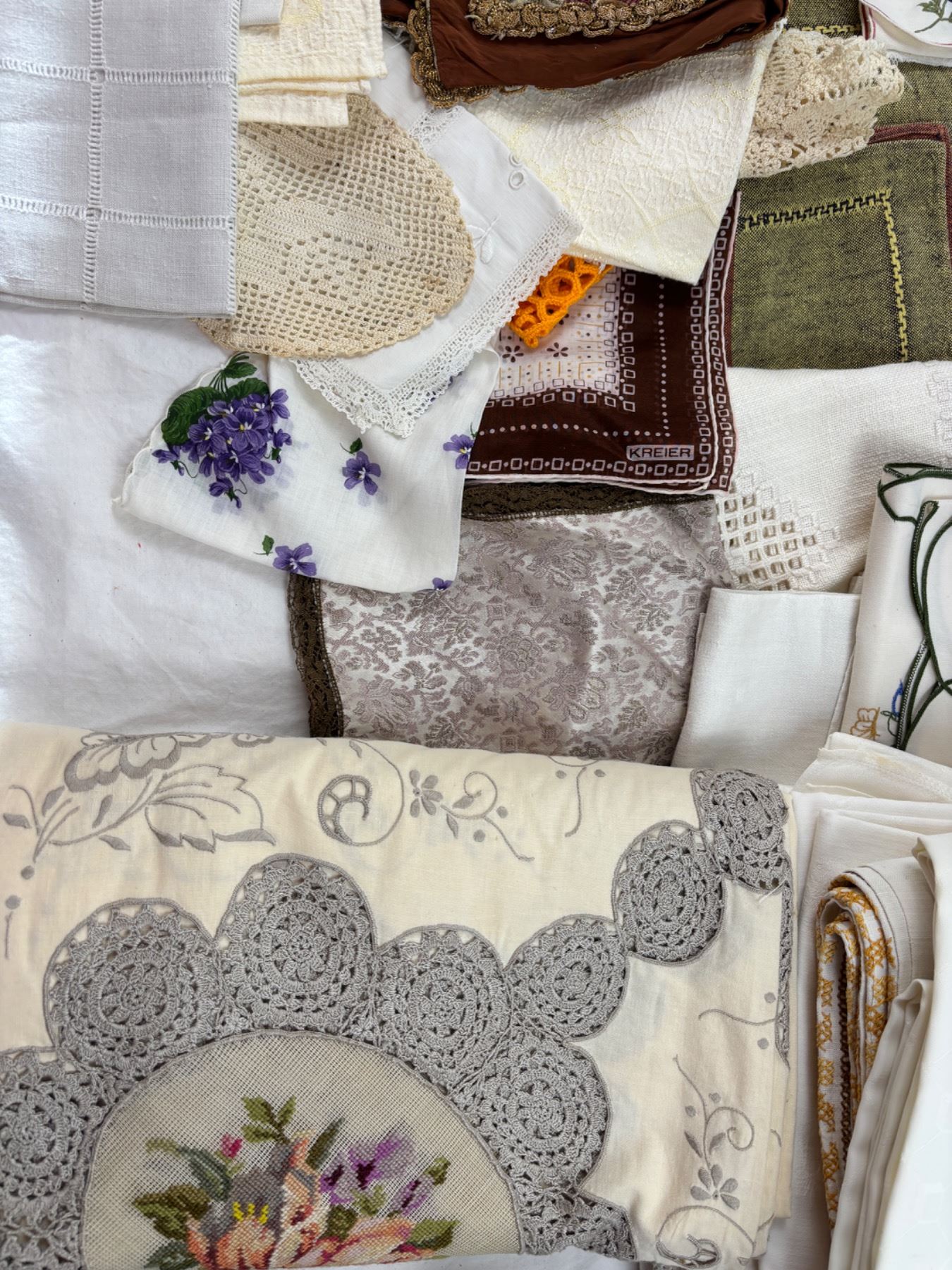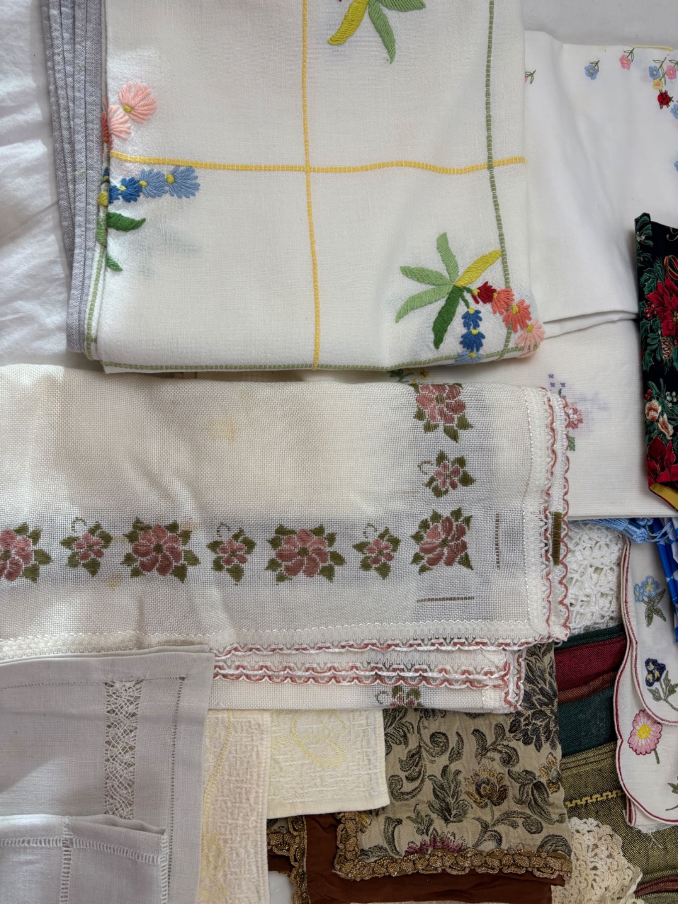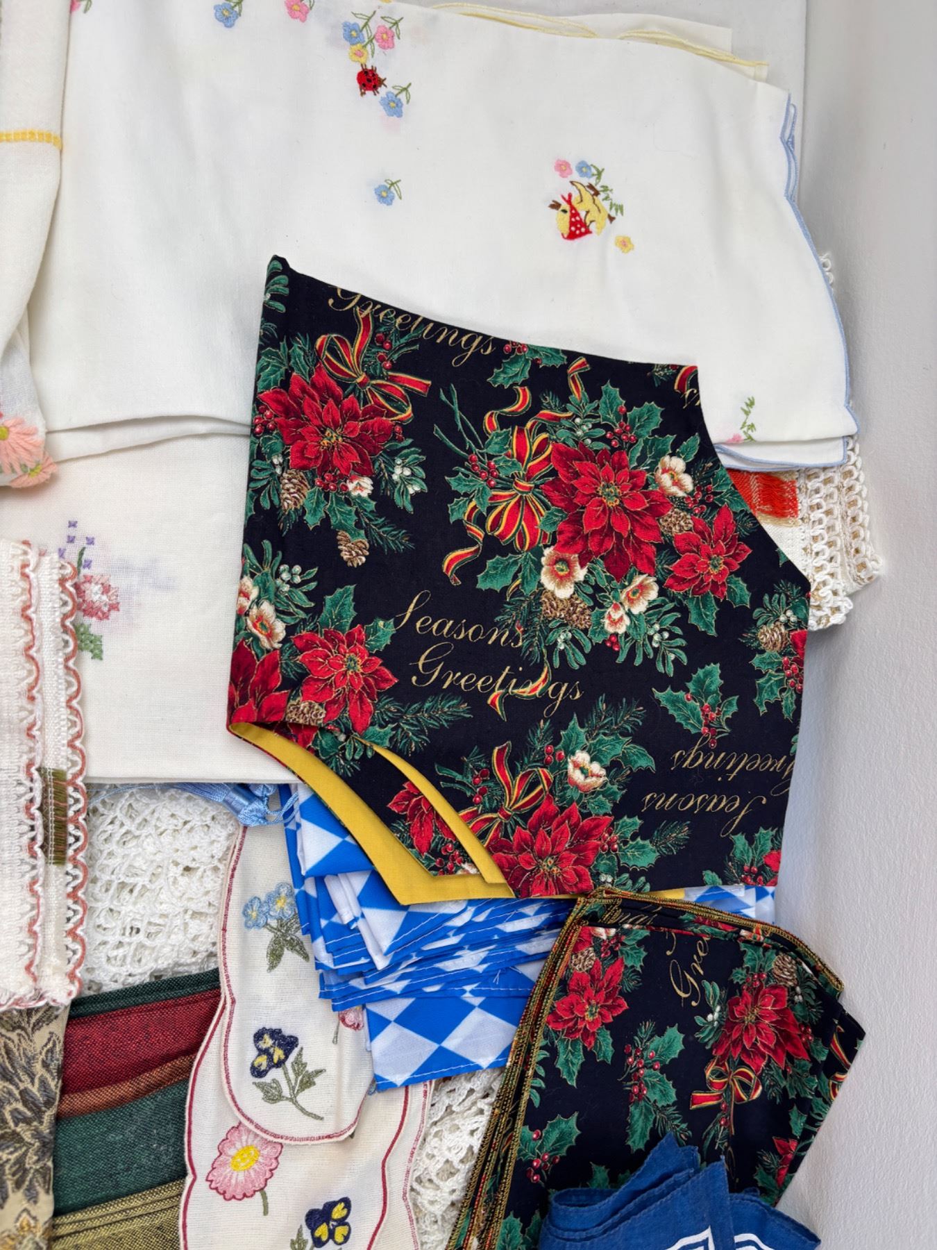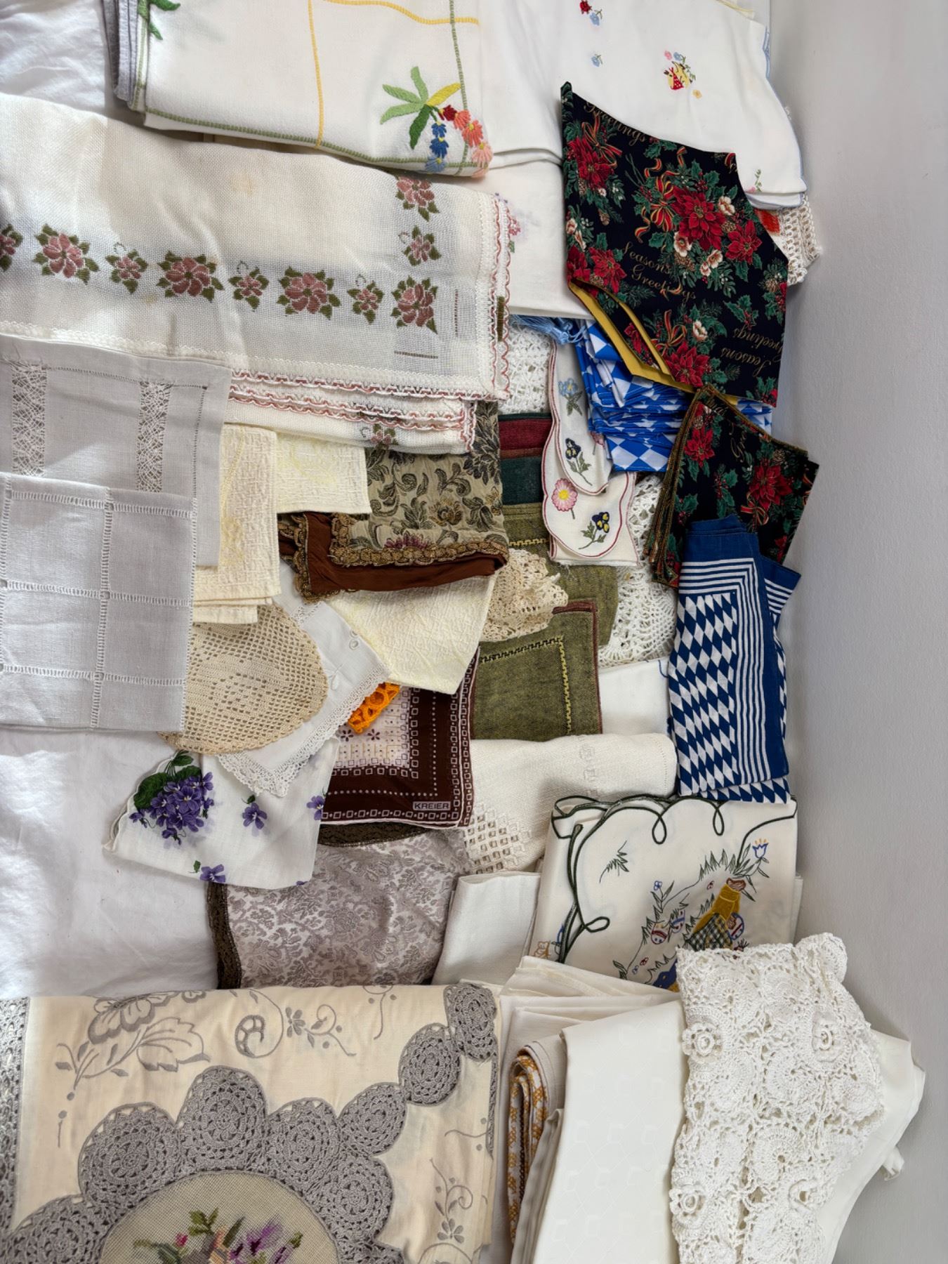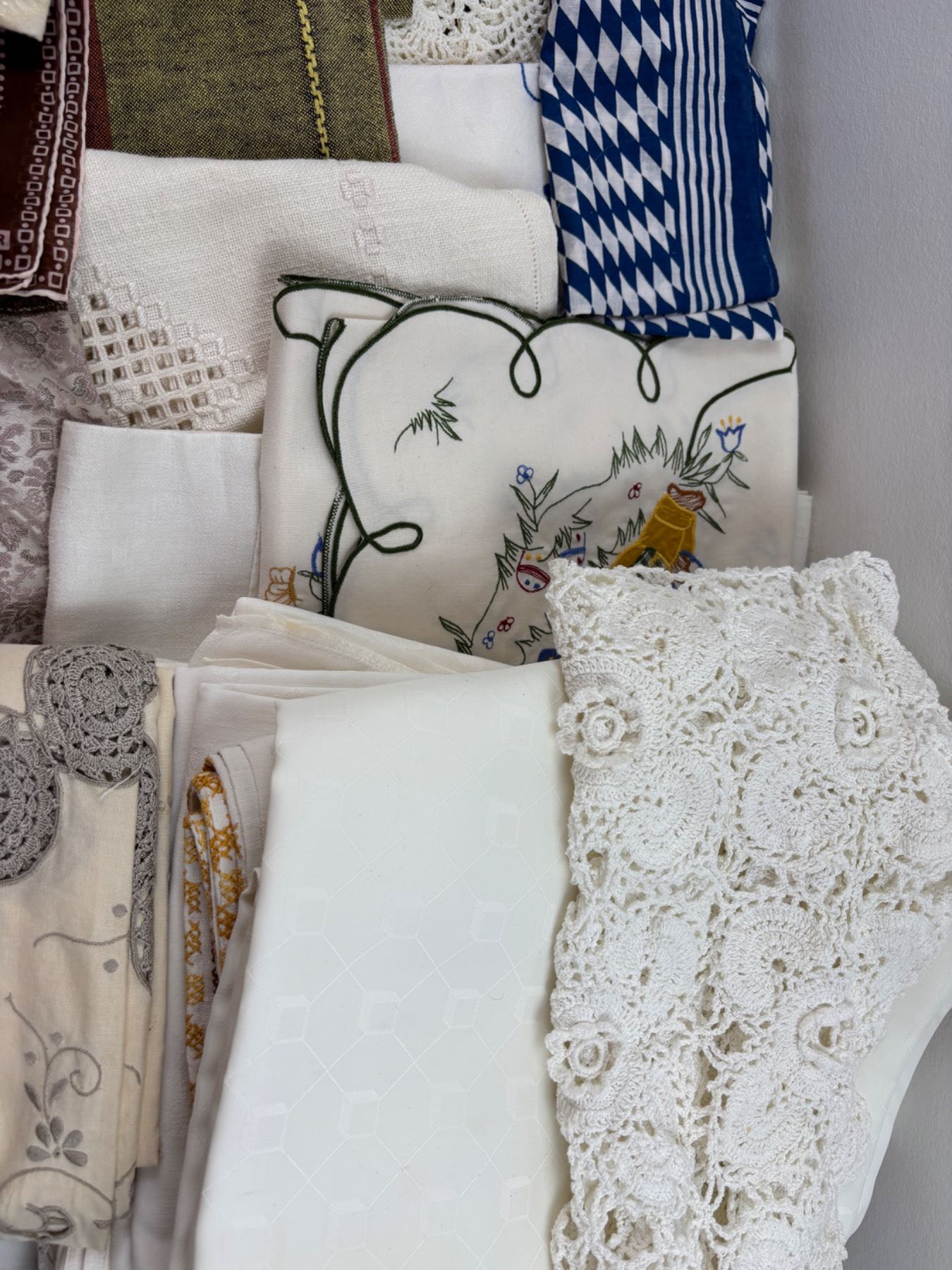 Includes different sizes of table runners, table cloths, napkins, dollies, and more