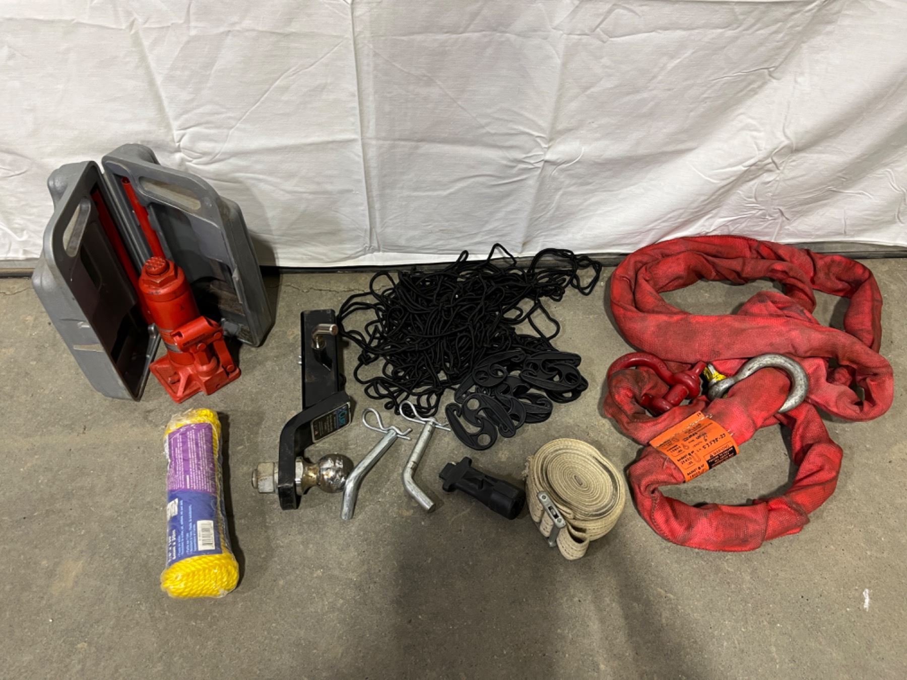 Includes Motomaster 4 ton jack, tow rope, Curt 6000lbs hitch with 2" ball, cargo net and trailer plug