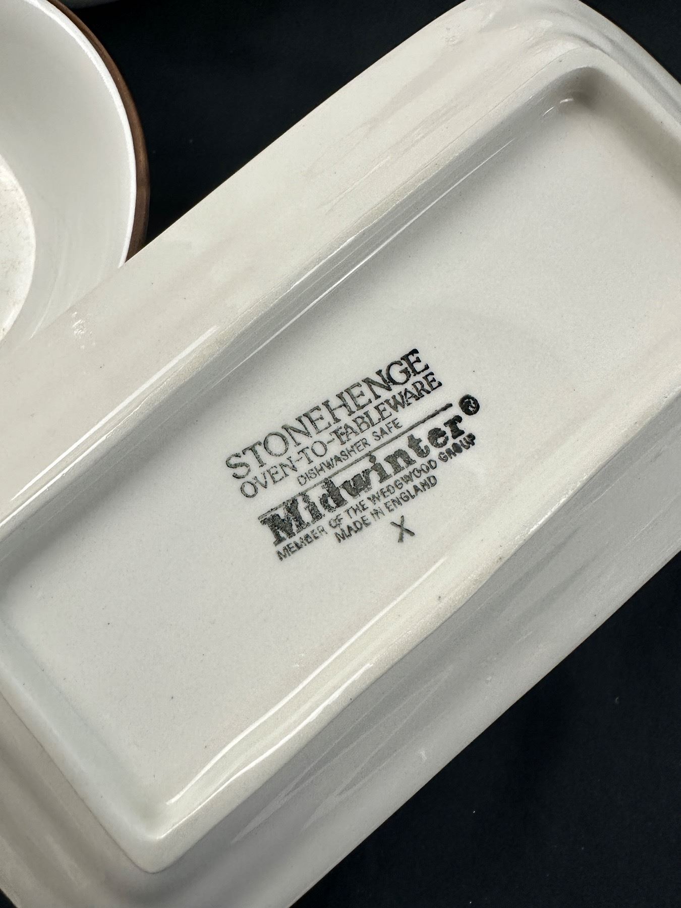 Made in Luxemburg - includes tea pot, sugar dish, 8 cups and saucers, 1 large bowl, 2 medium bowls, 2 small bowls, 1 extra small bowl, casserole dish, 3 large plates, 2 medium plates, 2 small plates, 1 platter, 3 bowls with handles - Stonehenge Butter Dish - Made in England Creamer and Gravy Boat