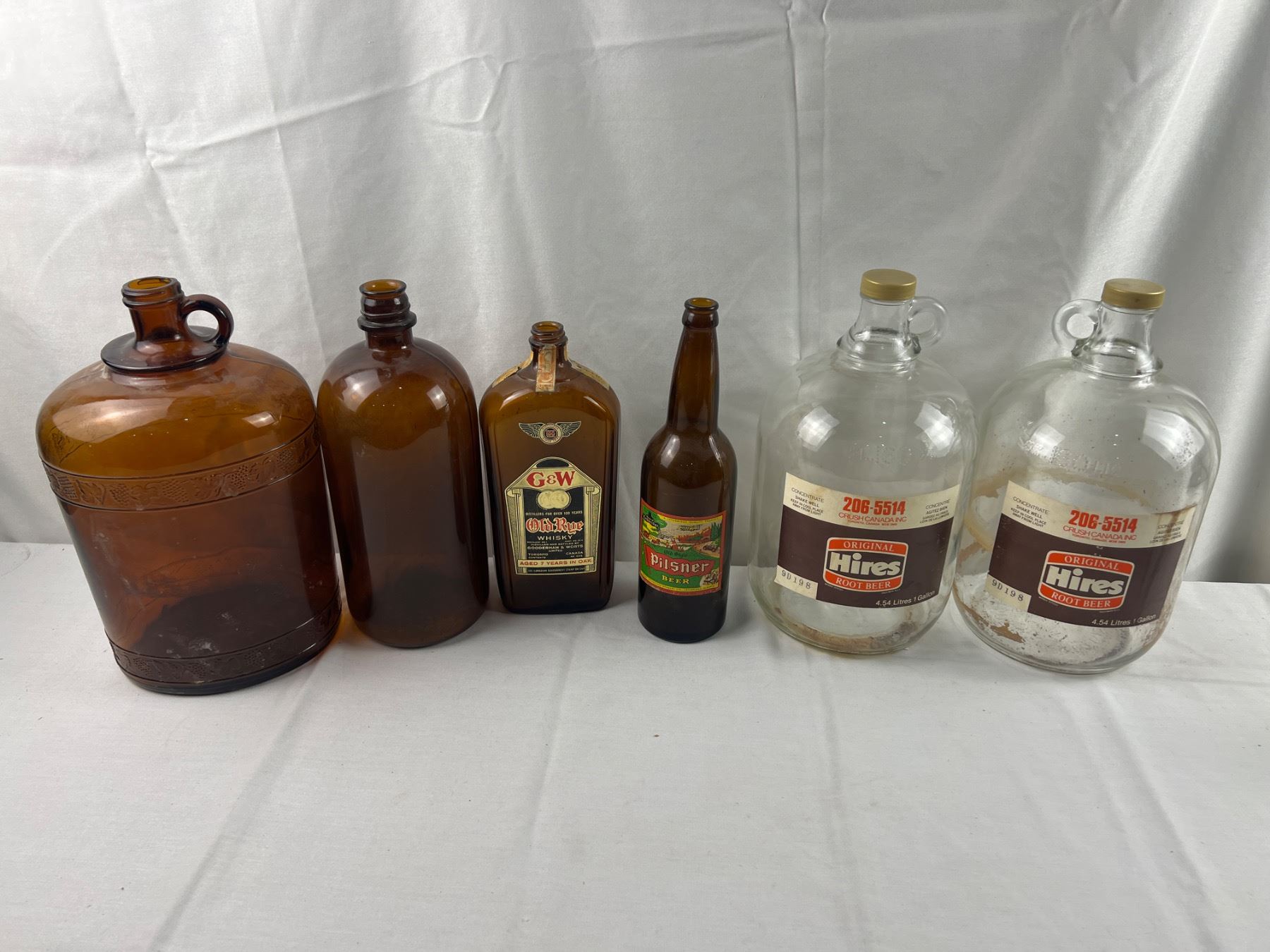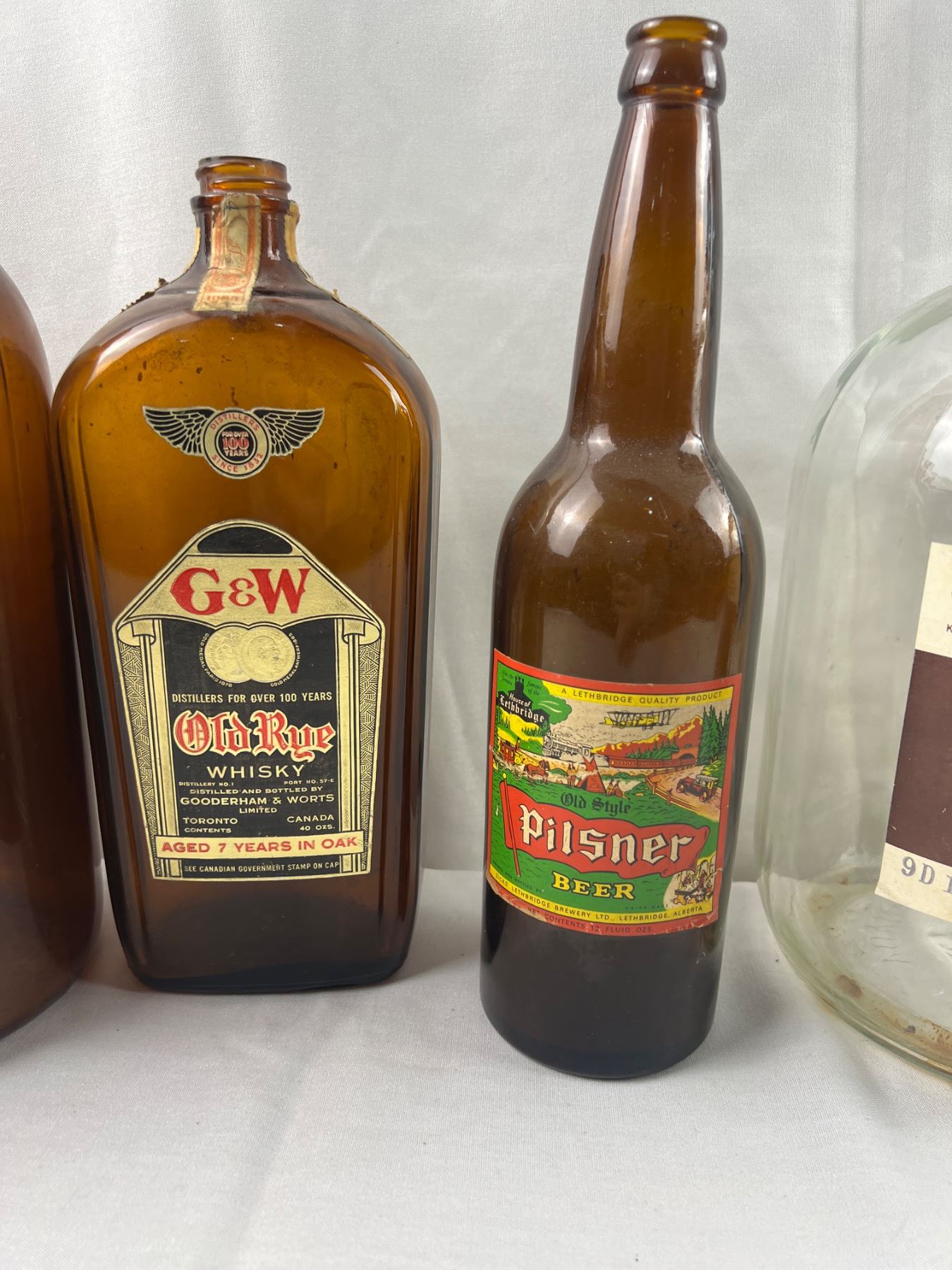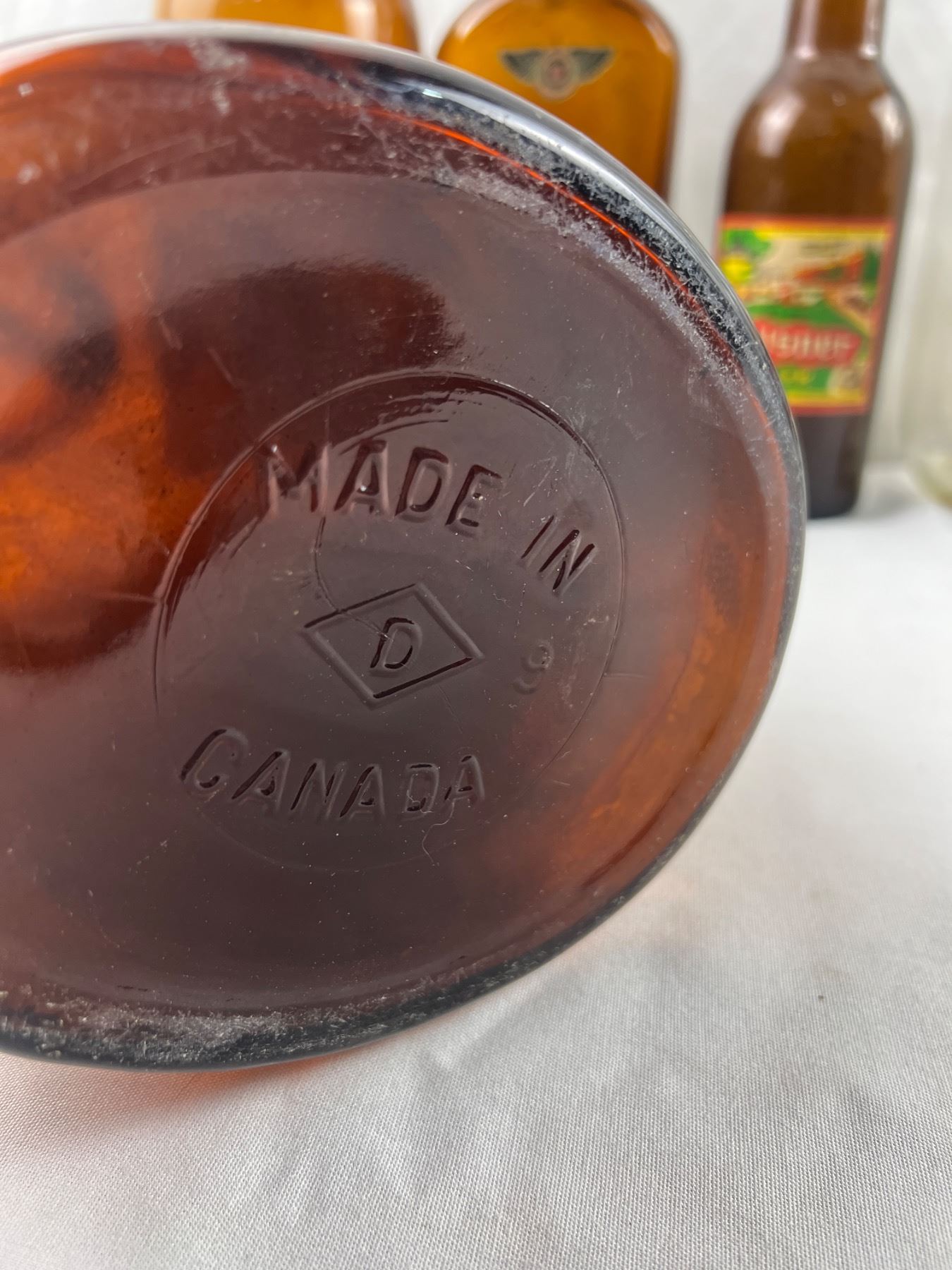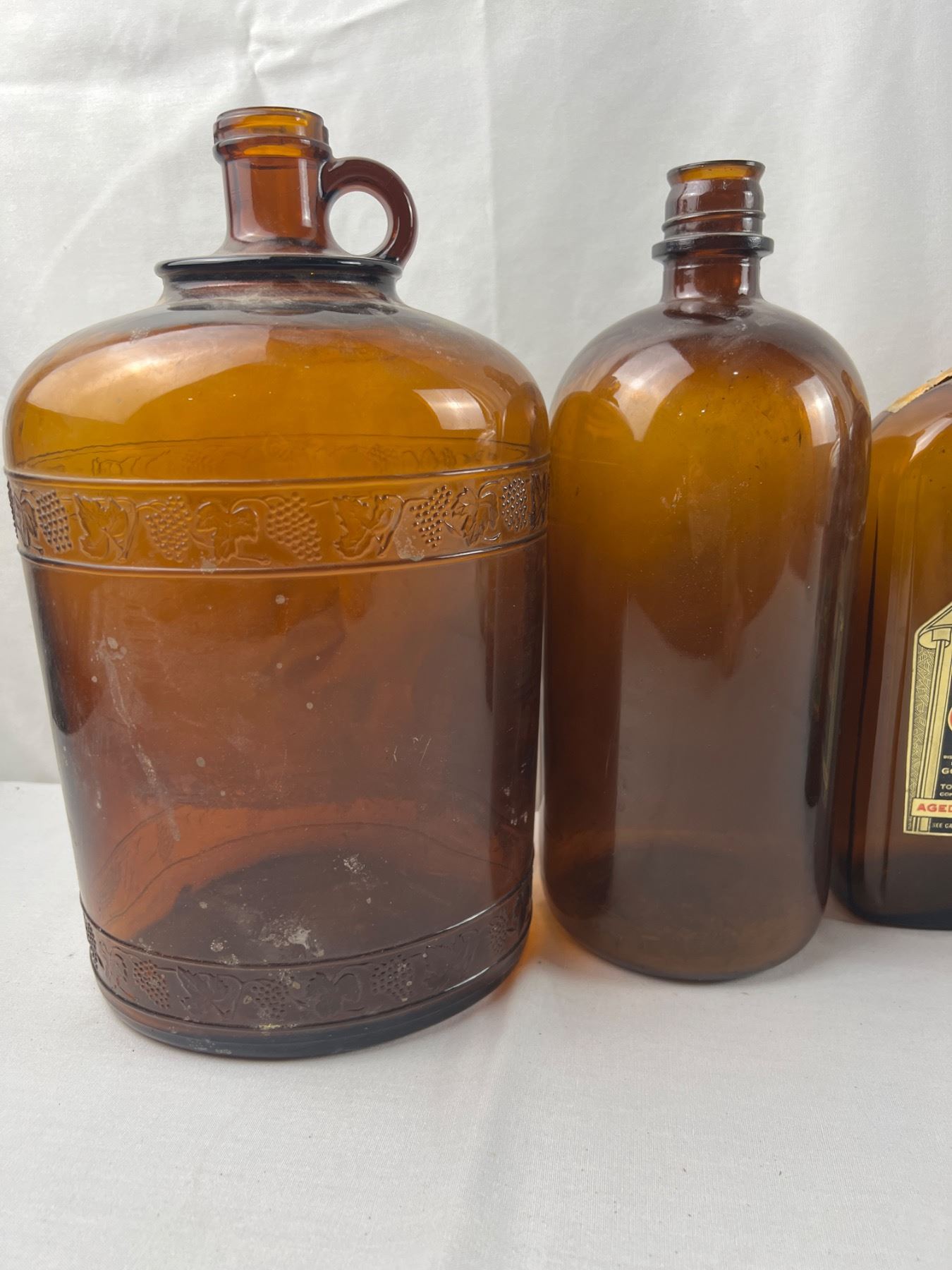 Some stains and wear, the large amber glass bottle is 12.5"H