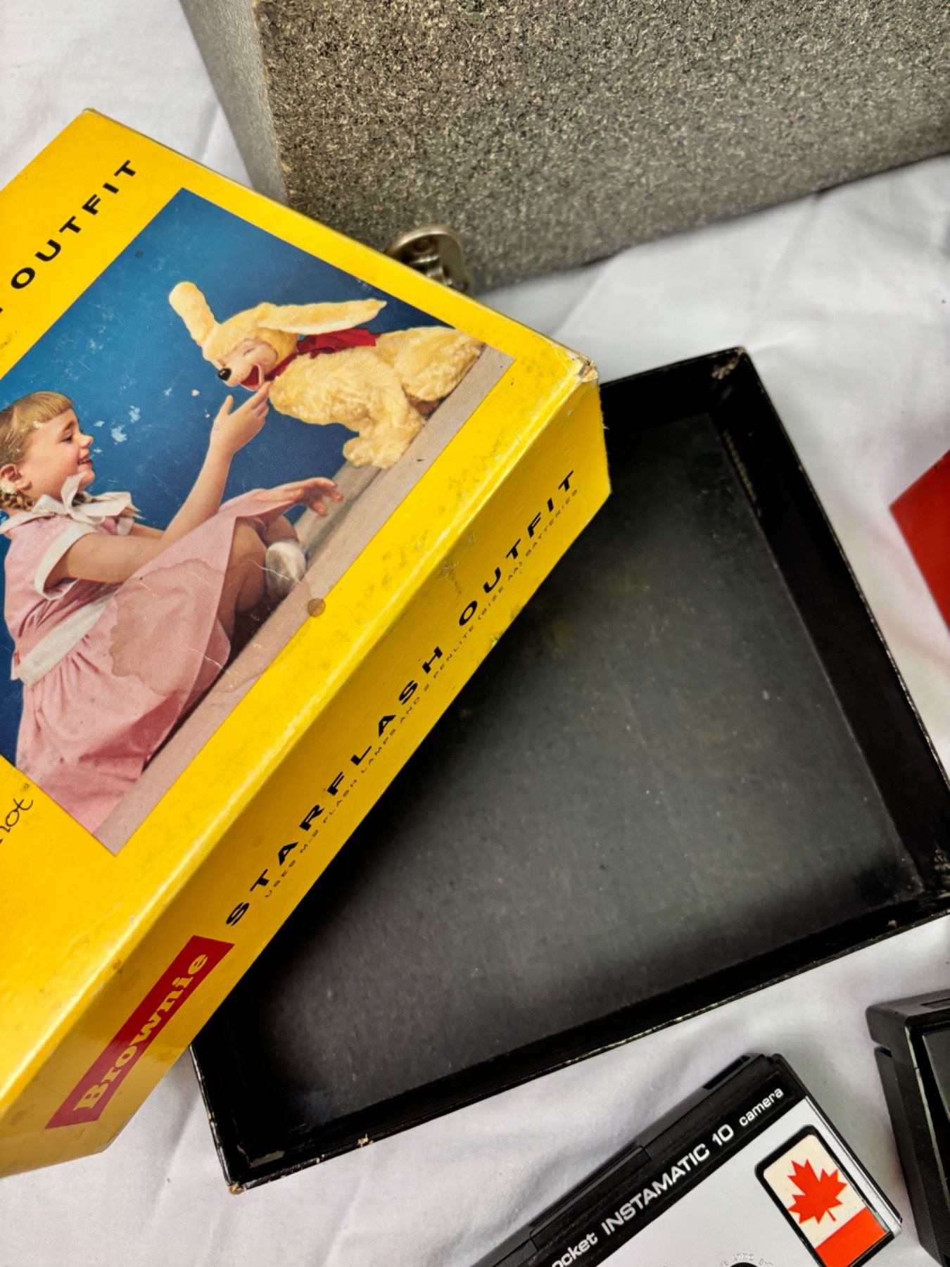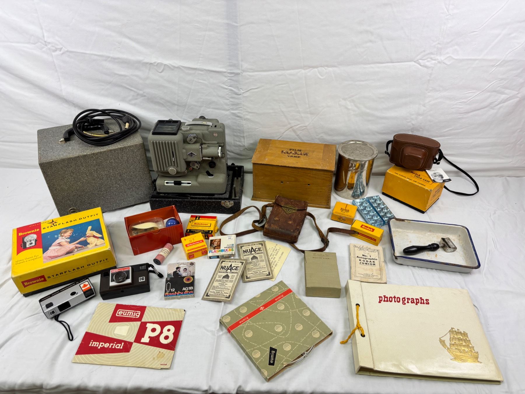 Includes, Film Kodak Tank, Kodak Pony 828 Camera & Case, Eumig P8 Imperial (not tested), Kodak Instamtic X15F, Various films, etc.