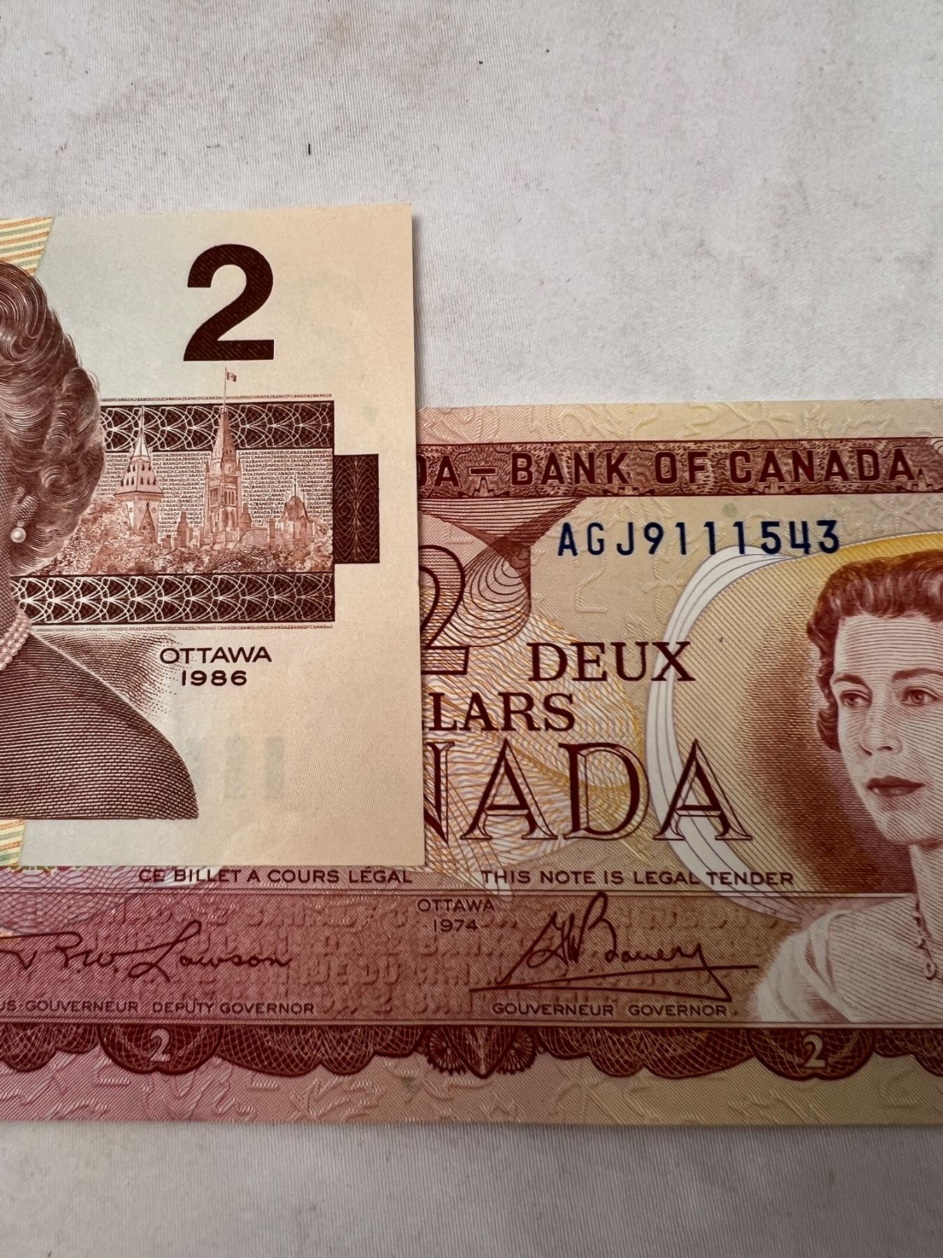 2 dollar bills are 1986 and one 1974, small stack of one dollar bills Is 1954 with two being 1967, and larger stacks of 1's are 1973