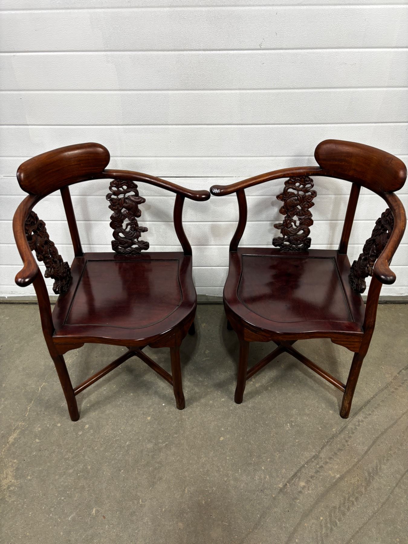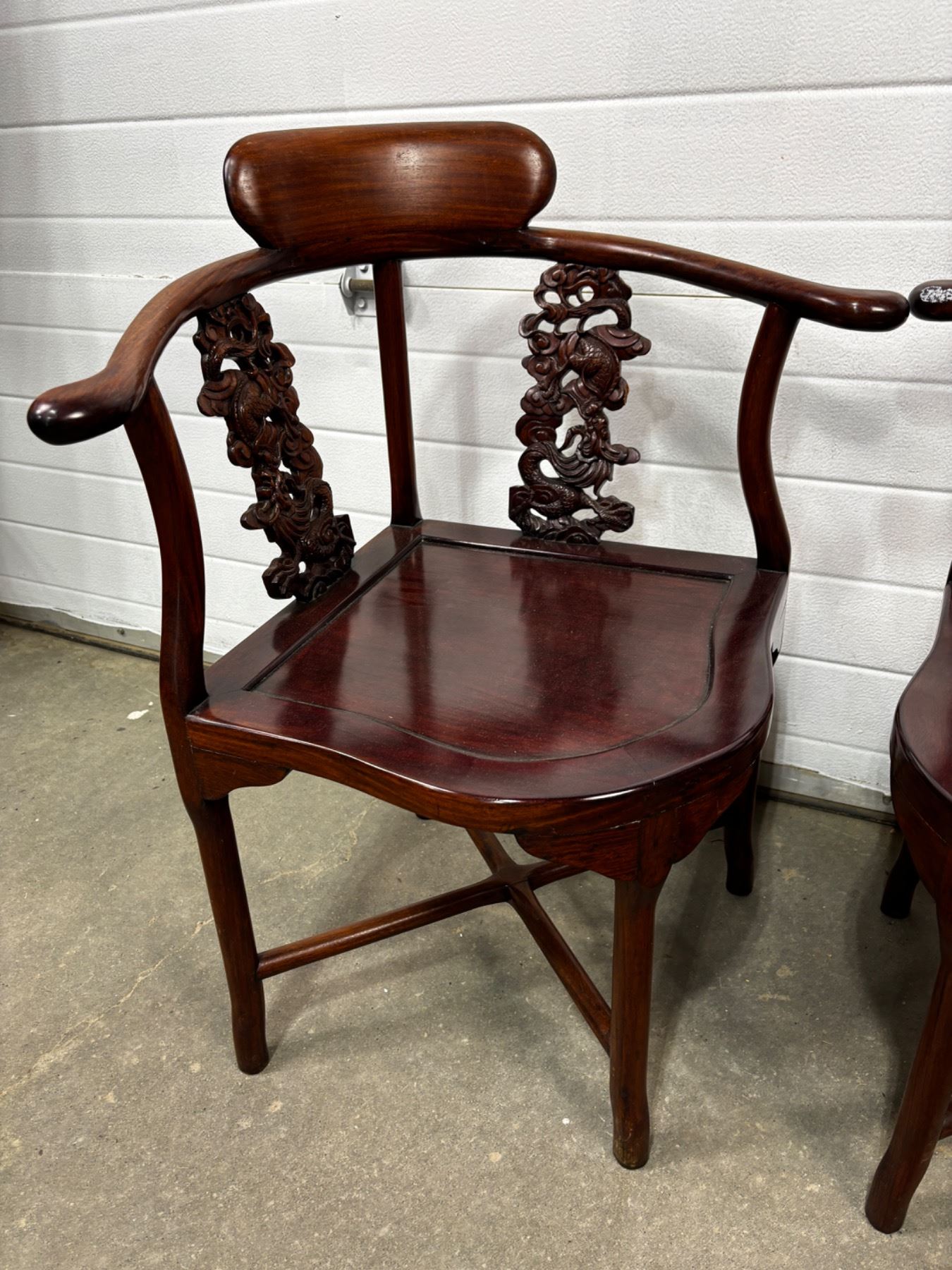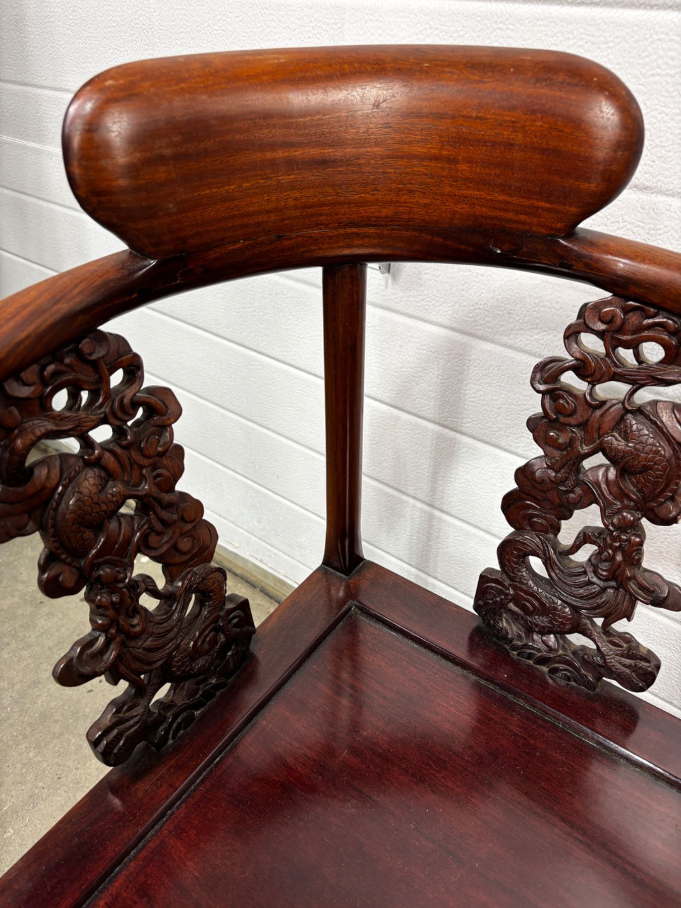 Carved Dragon motif on chairs. White stain on one of the arms of one of the chairs. Measure 32" tall by 19" by 19" for seat surface.