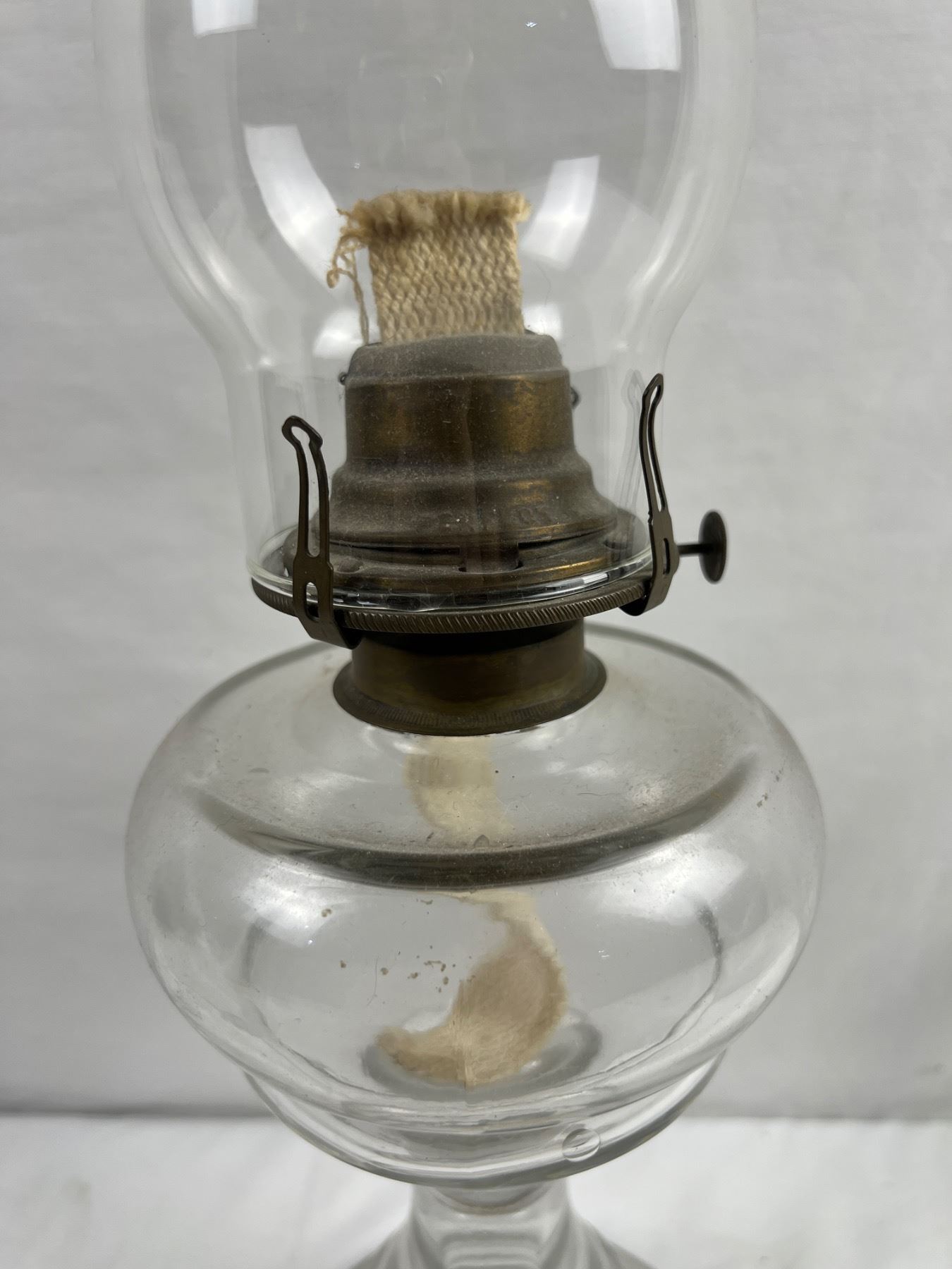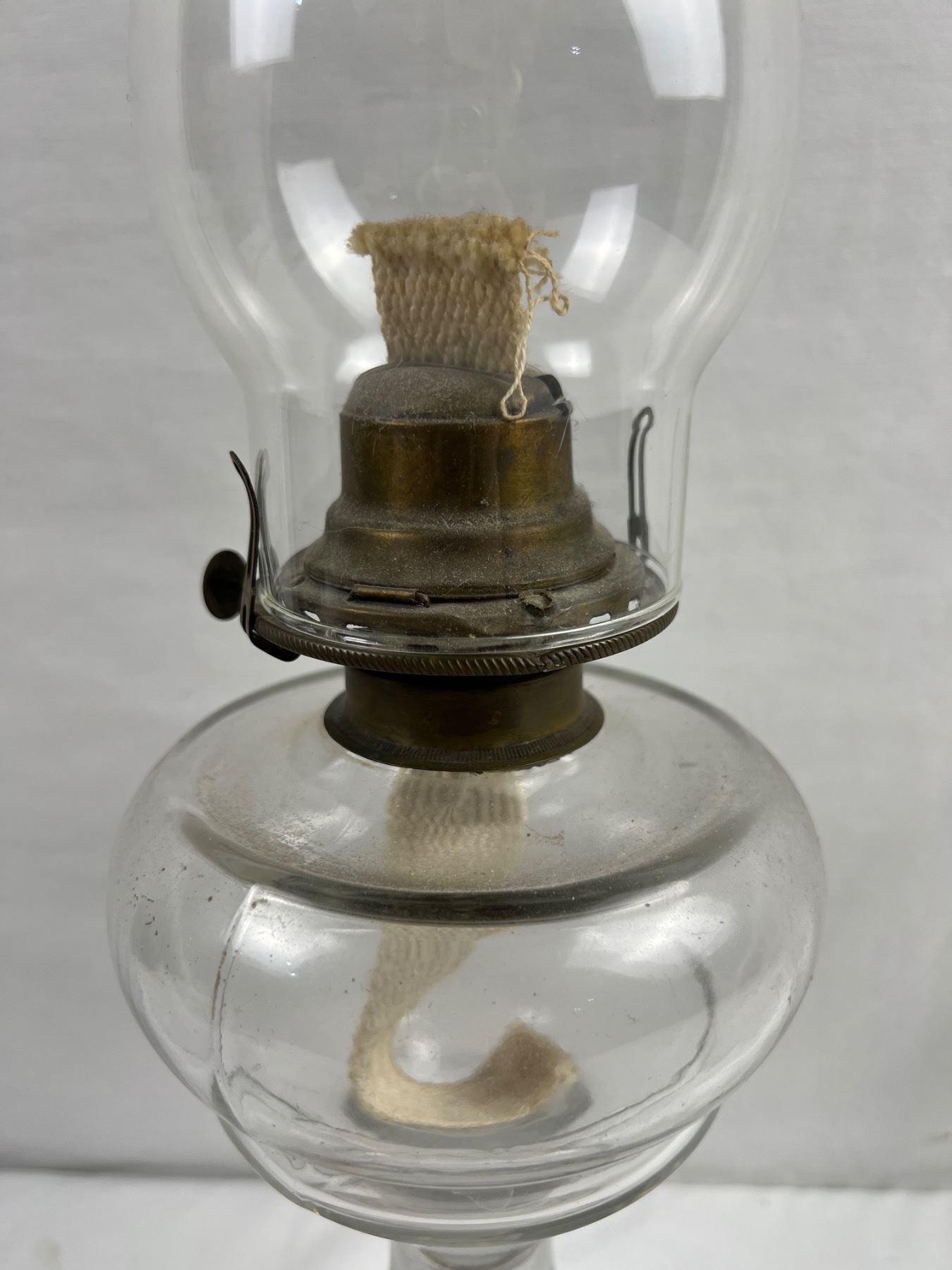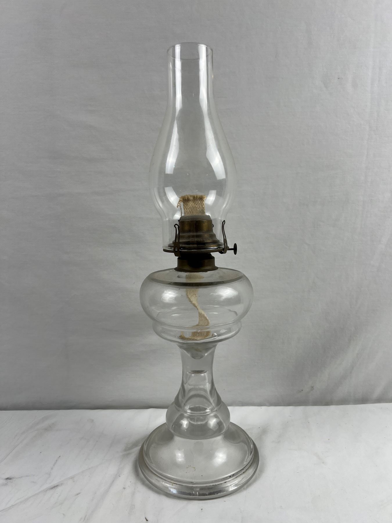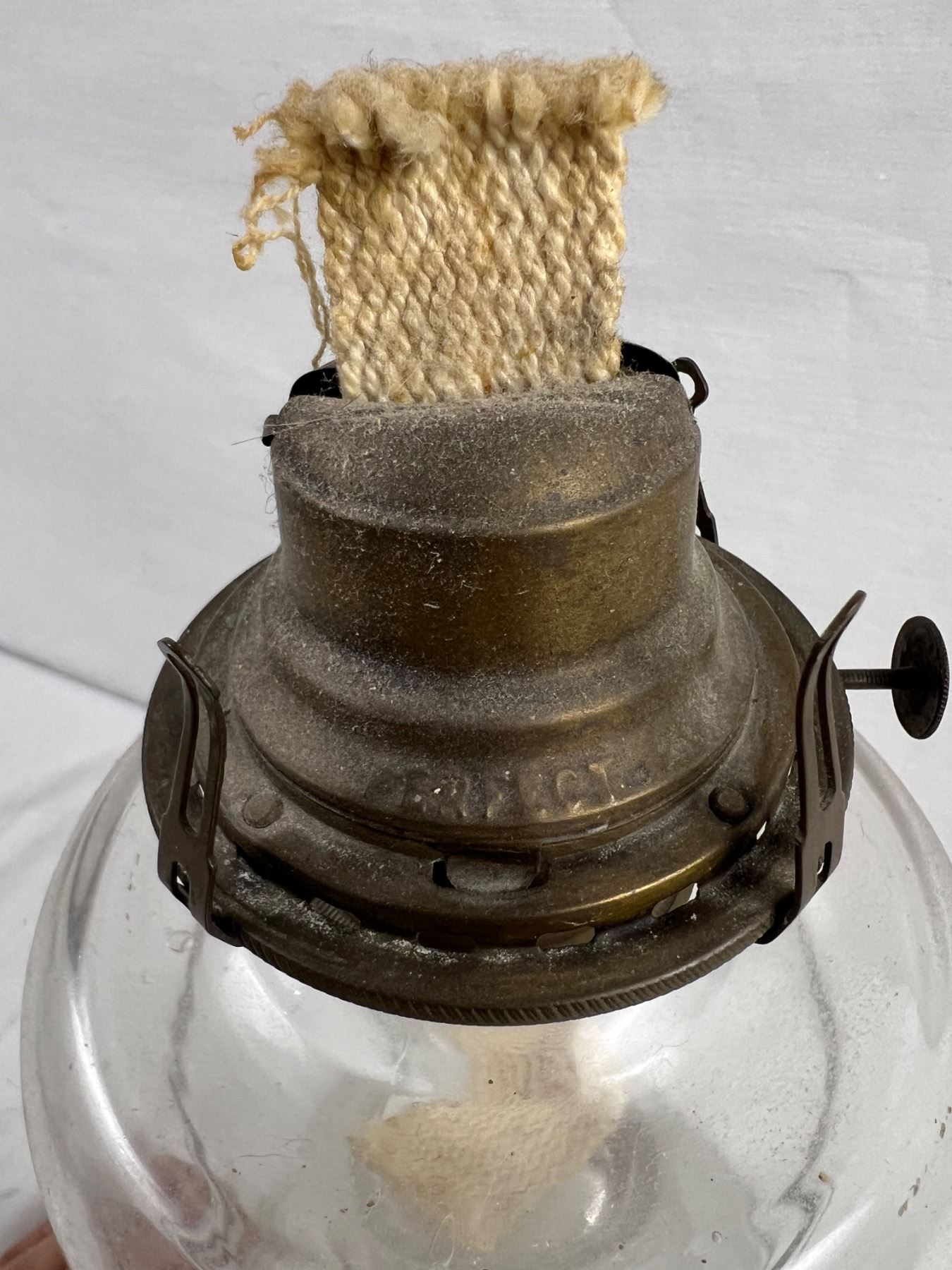 Some staining from dust. One of the retainer clips for holding the lantern glass is missing. 19" in height.