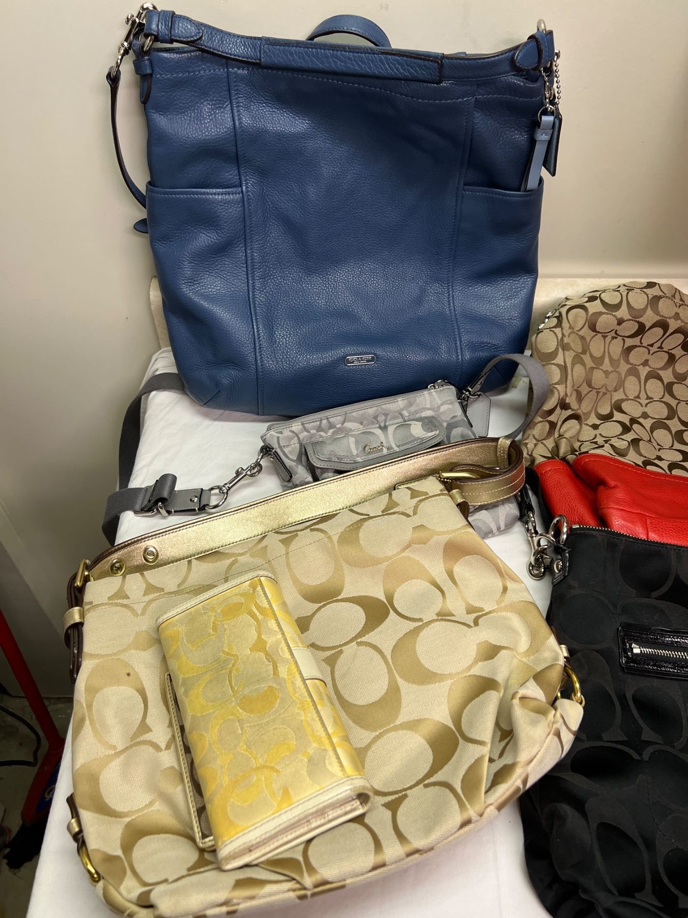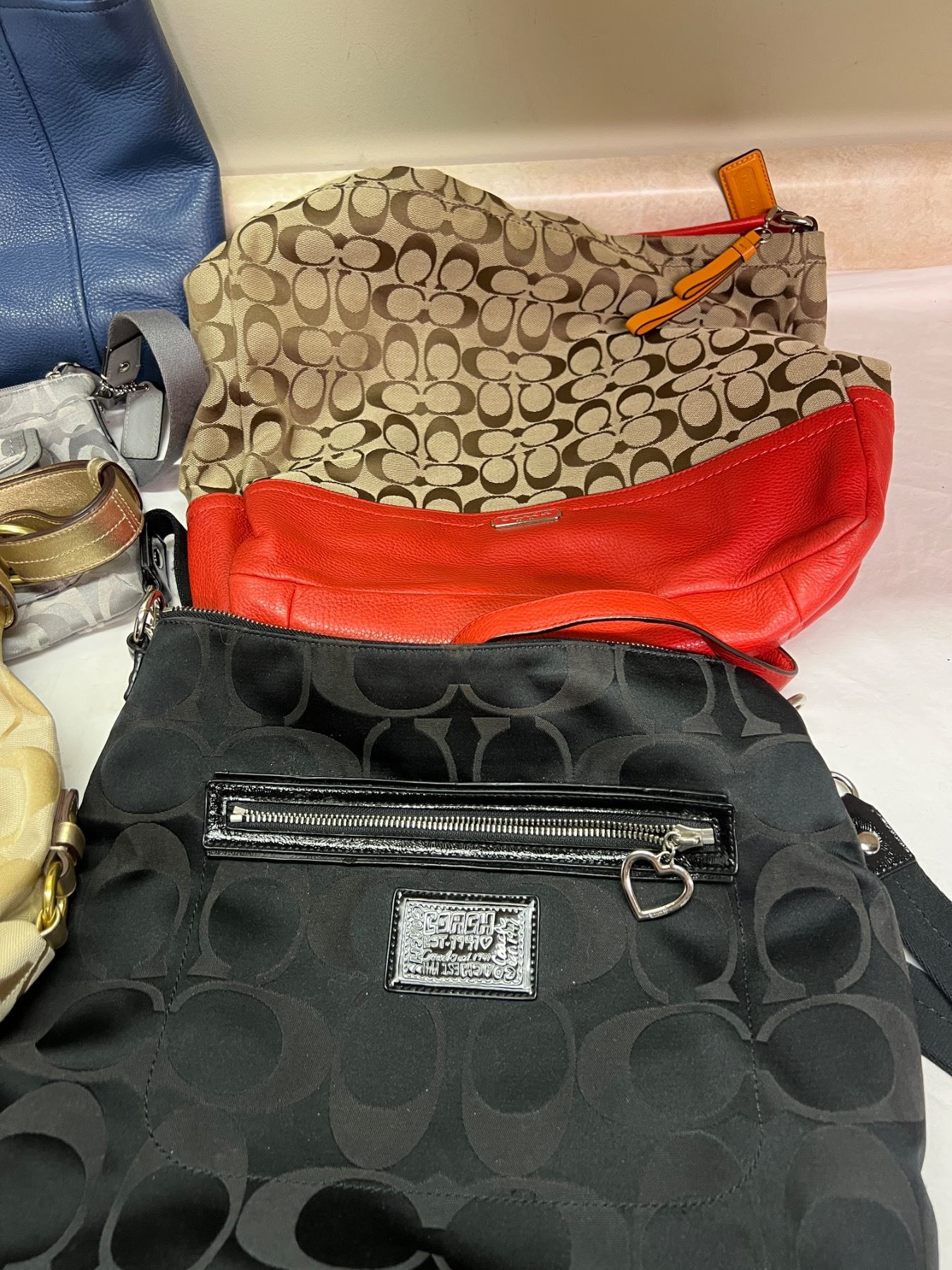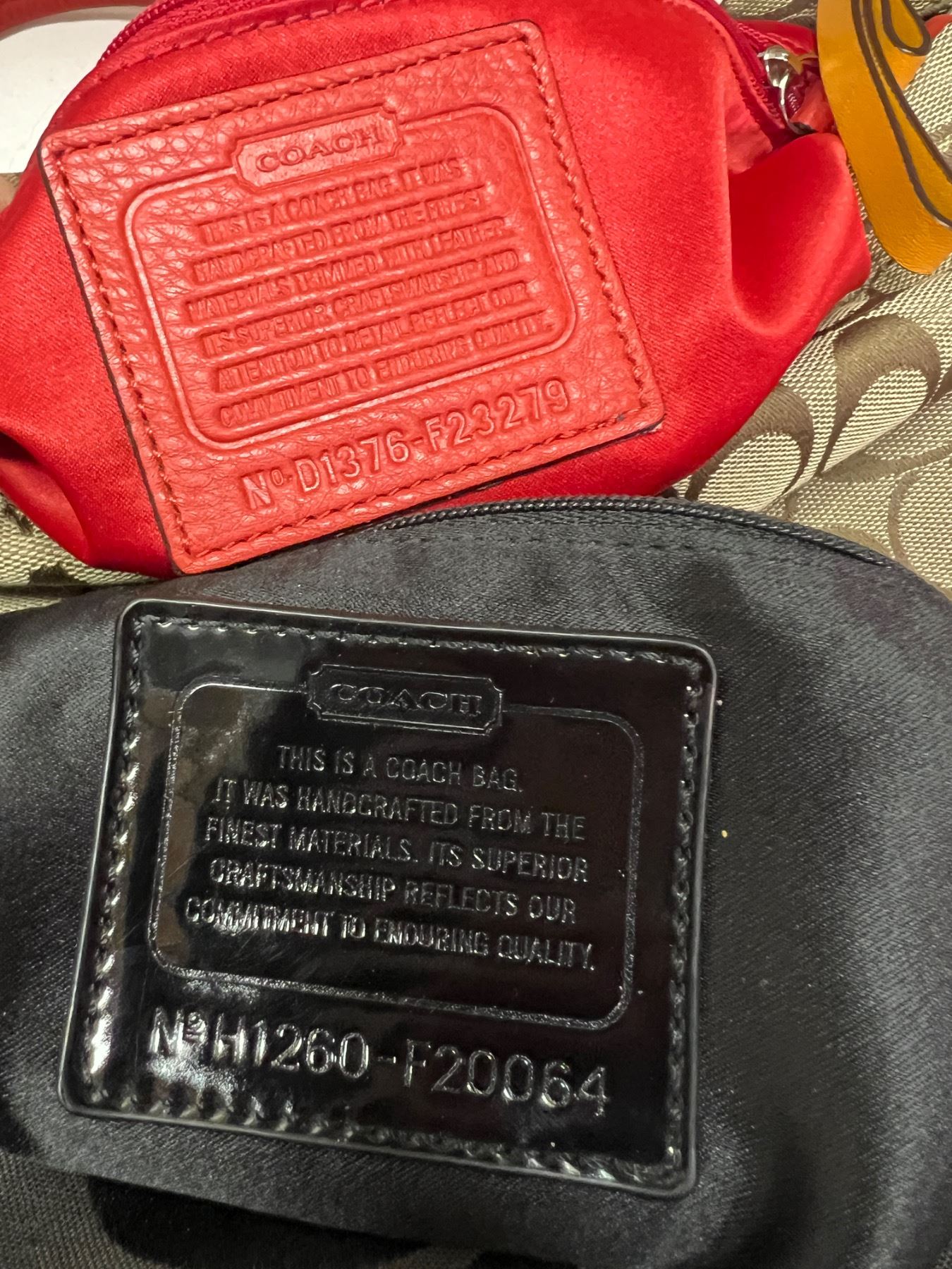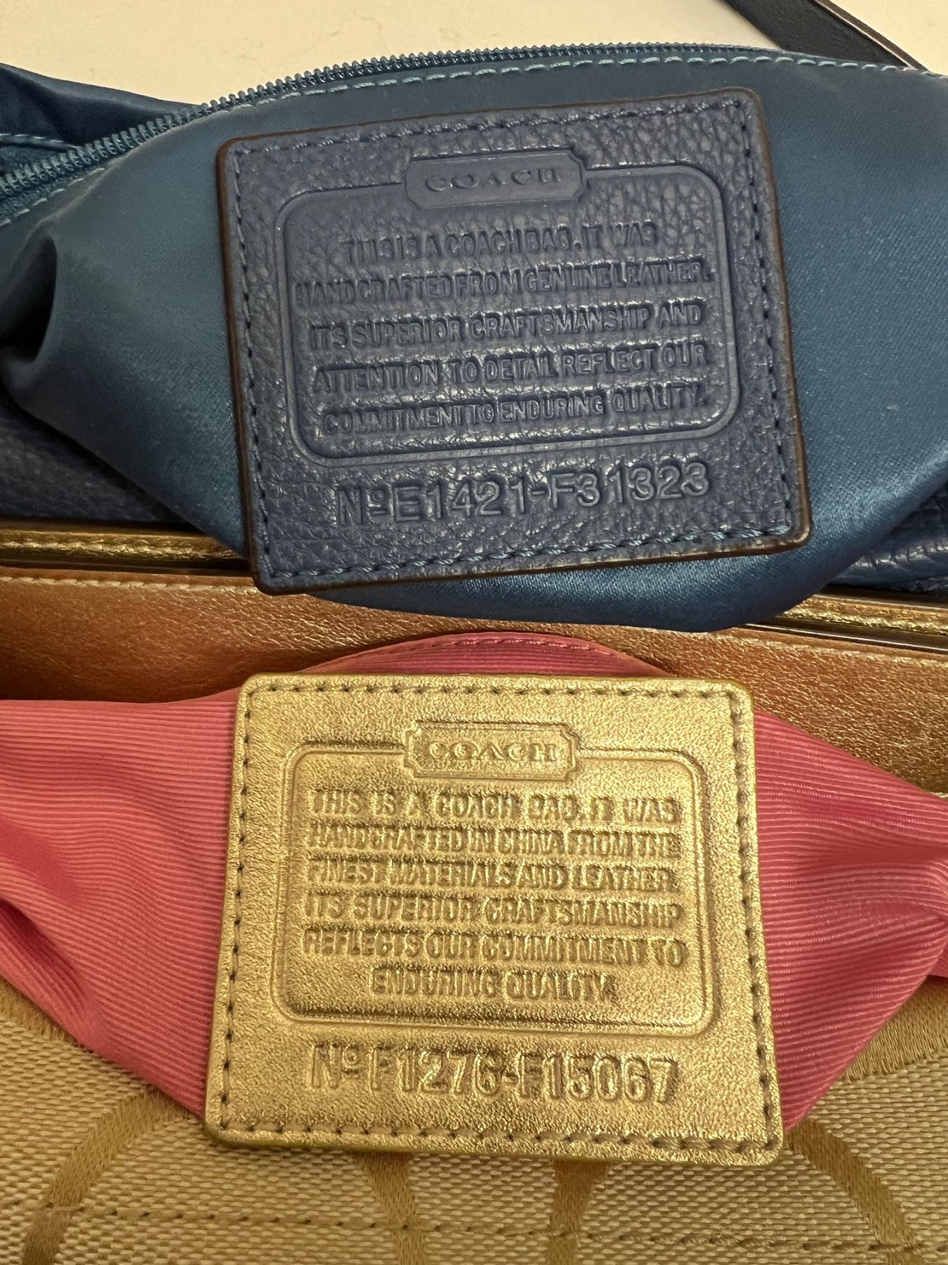 4 of the bags, the larger pieces all have the Coach tag made of leather on the insides of the bags. However there are no receipts or boxes and we cannot confirm authenticity.