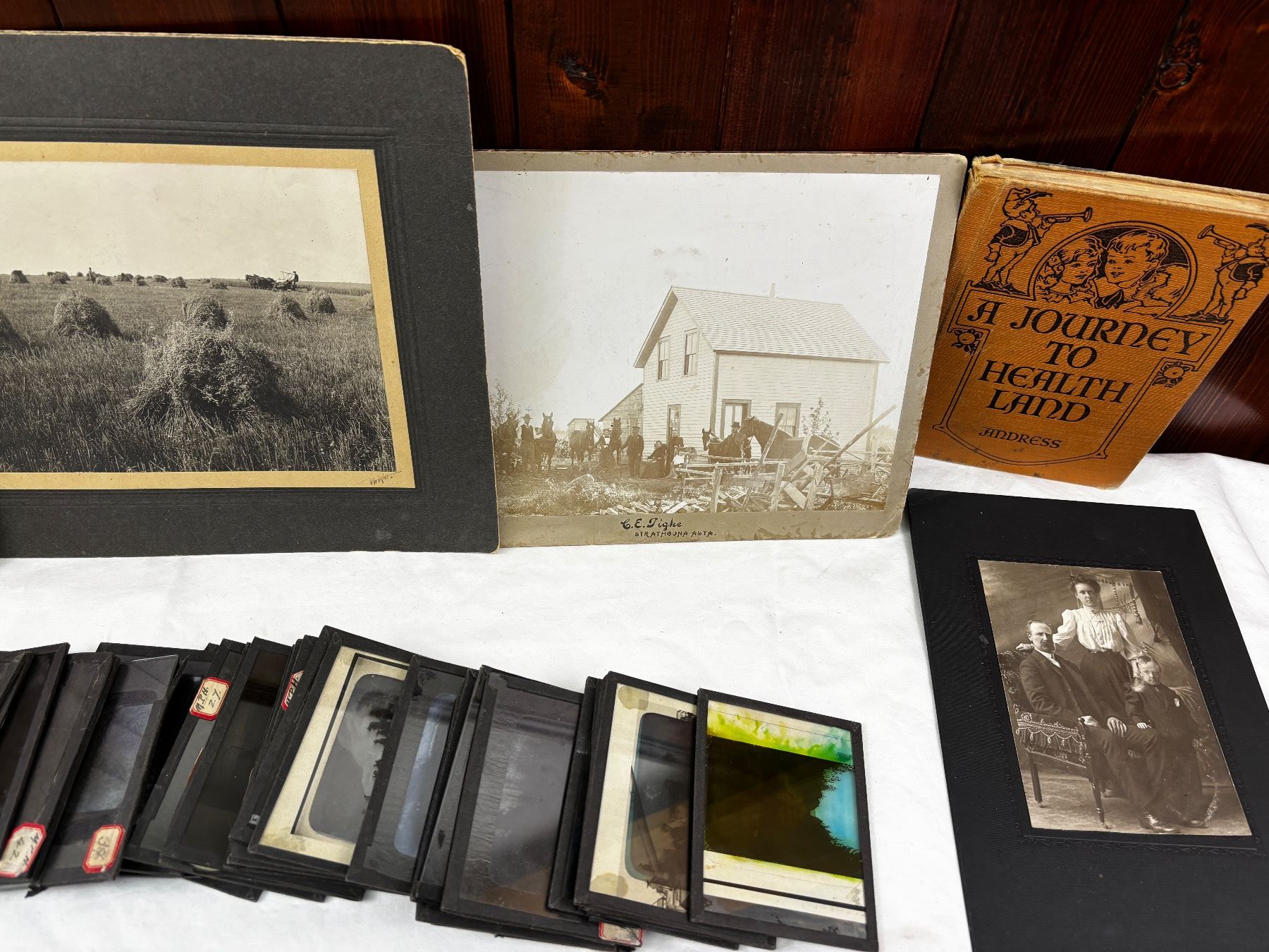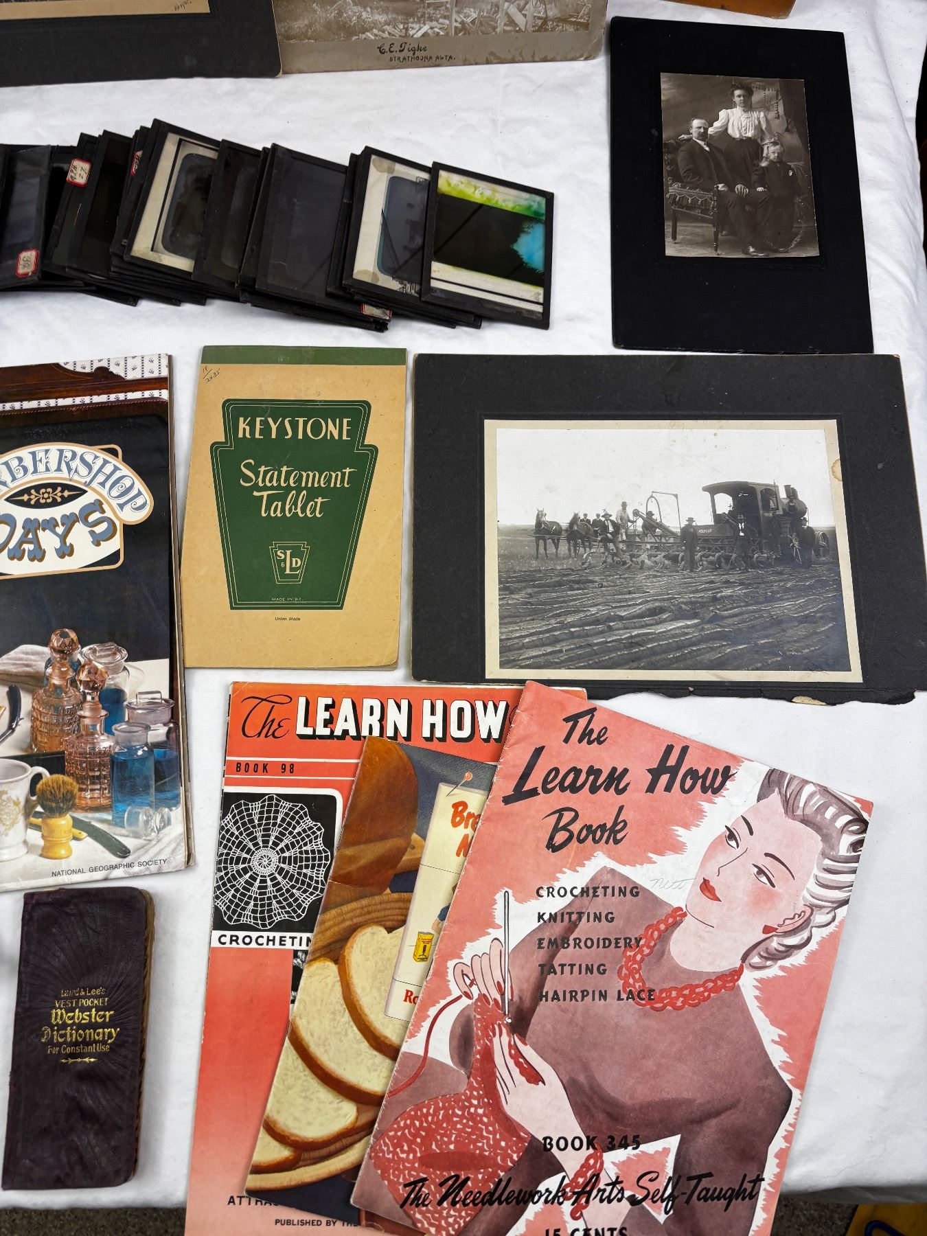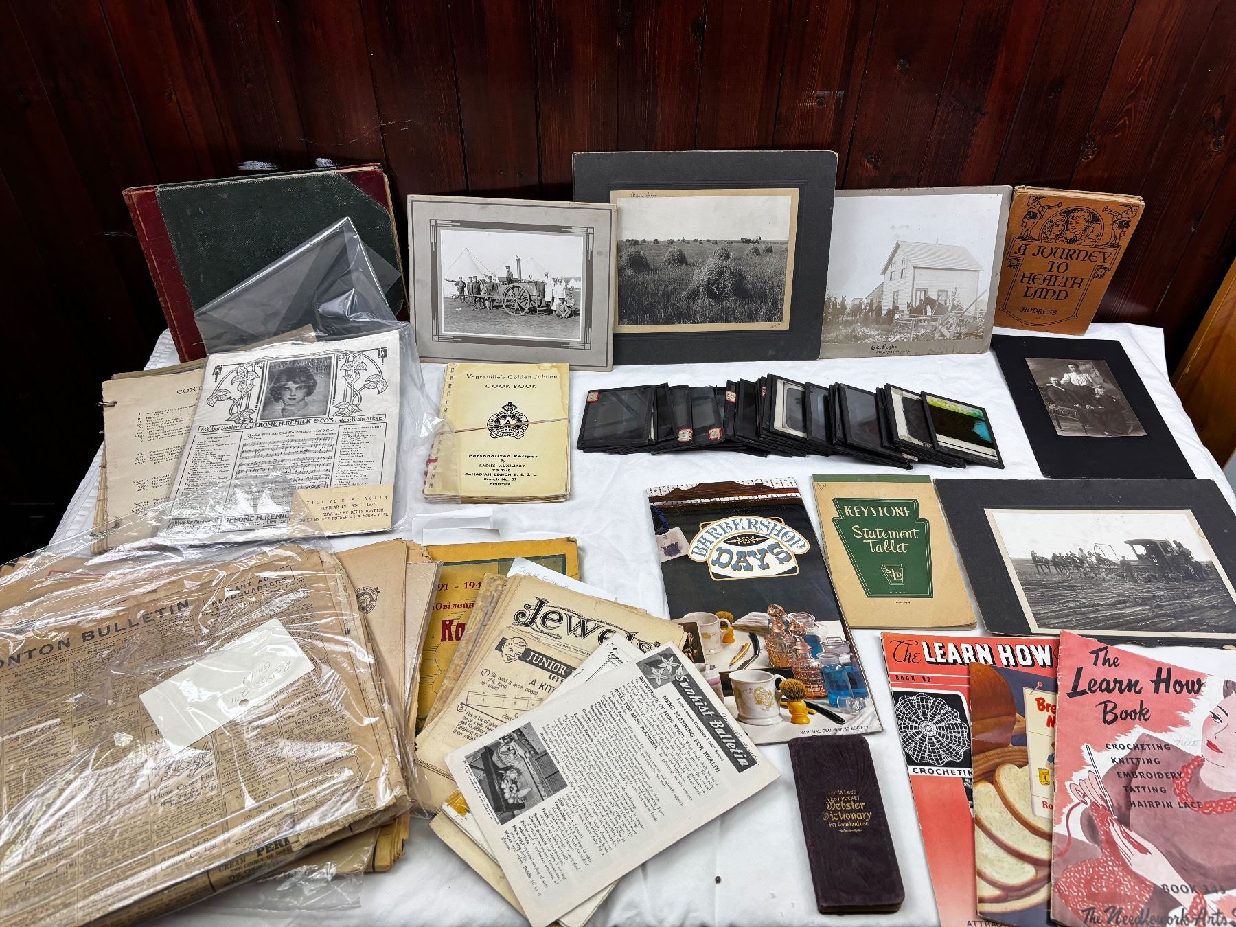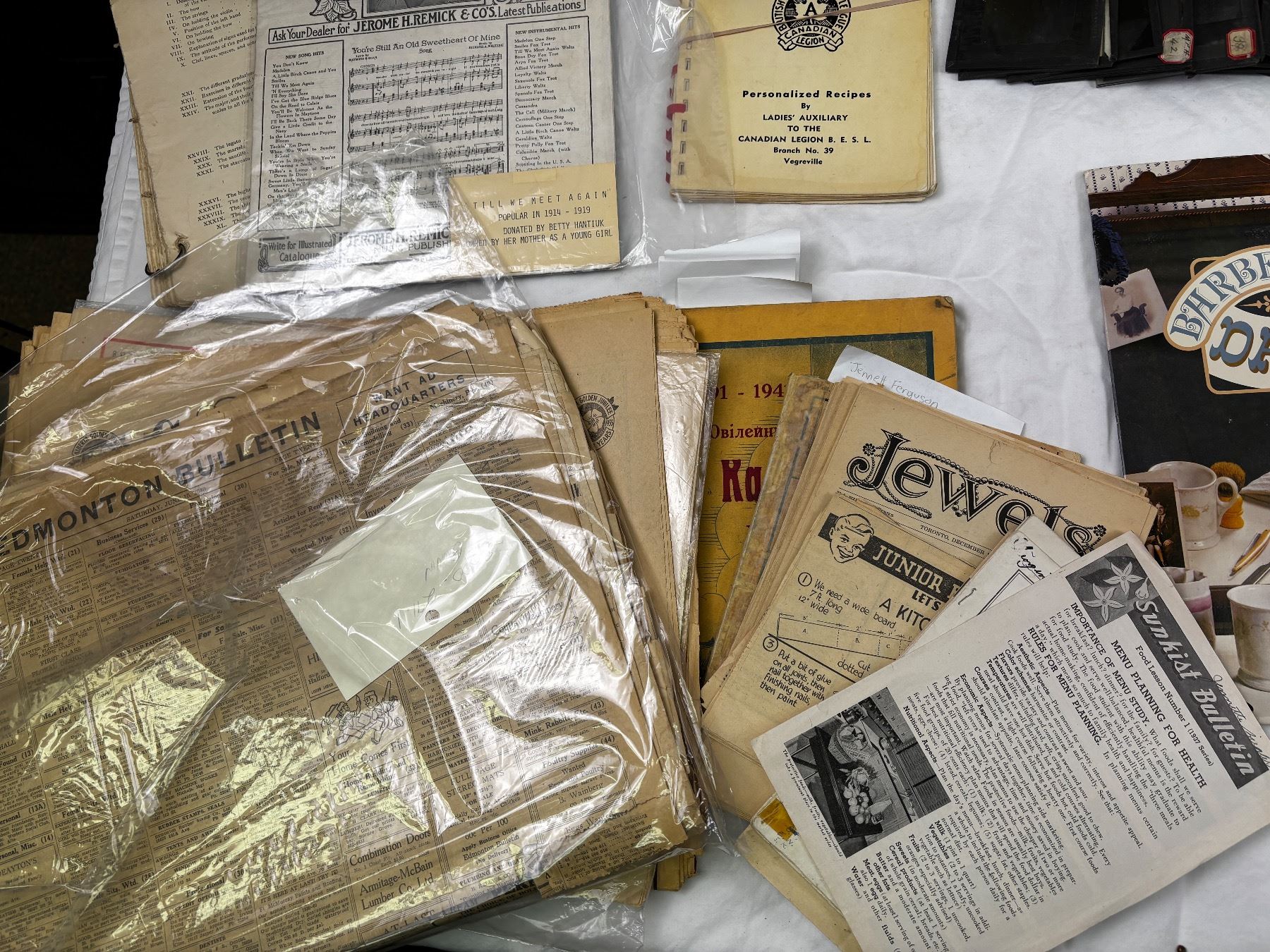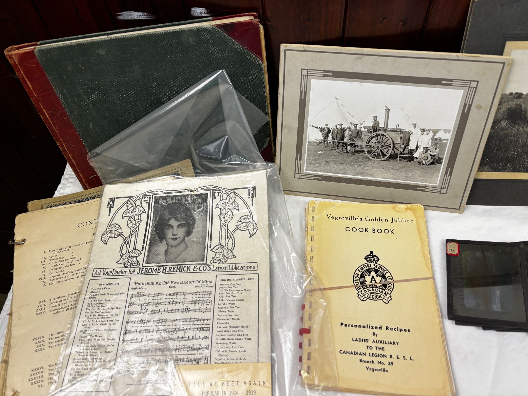 Includes, photographs, cook book's, vintage papers, School Library, sheet music, etc.