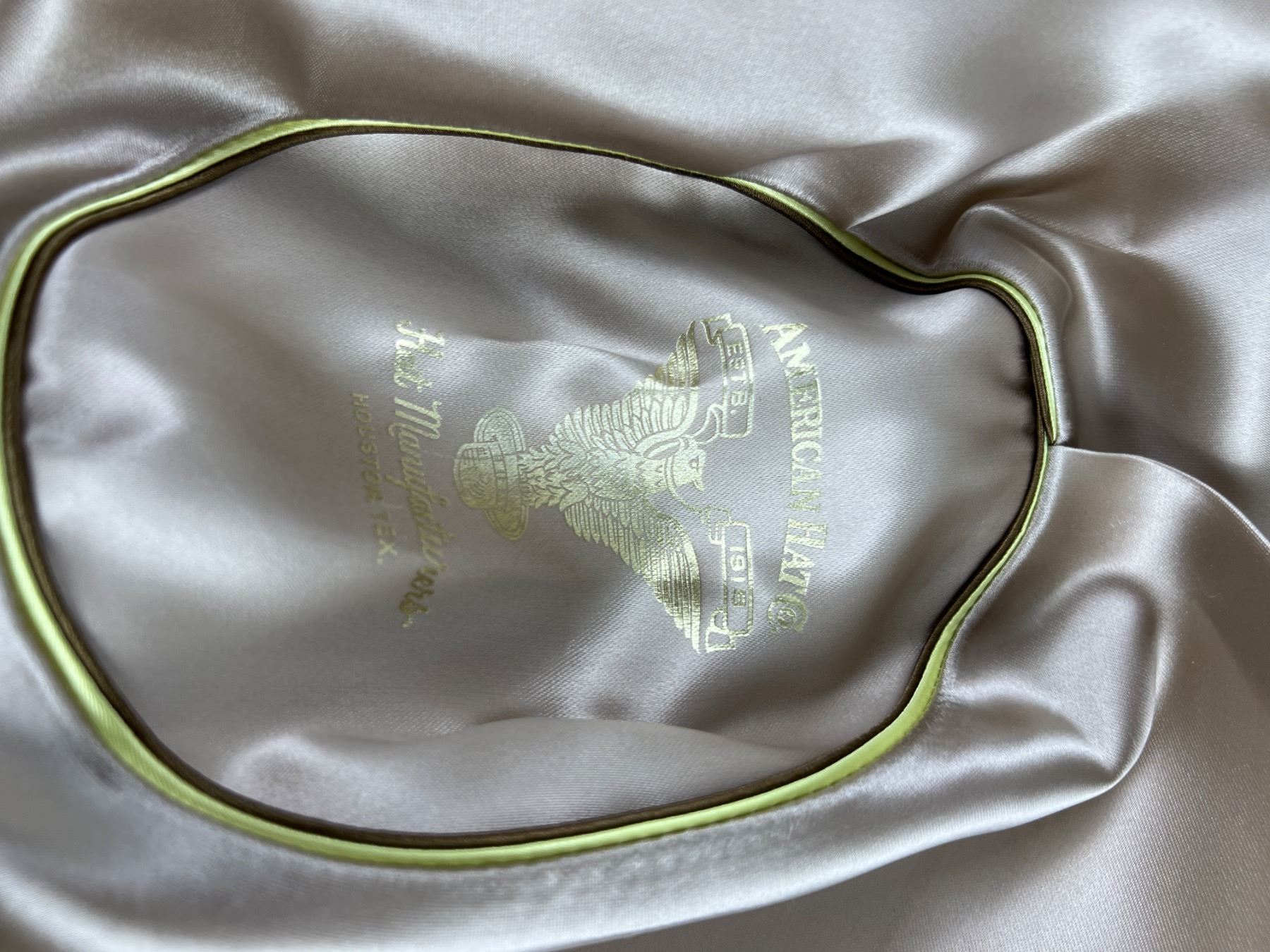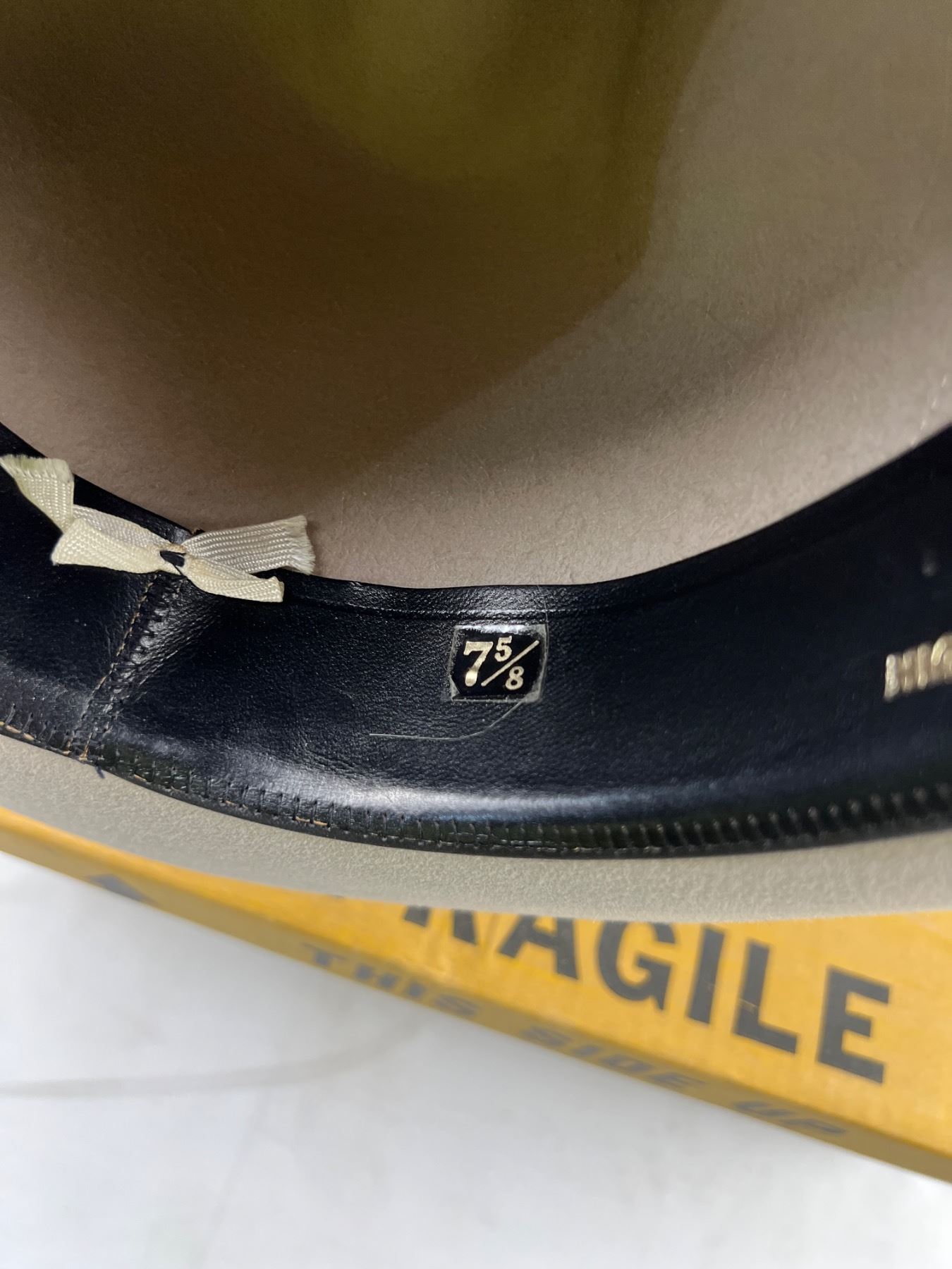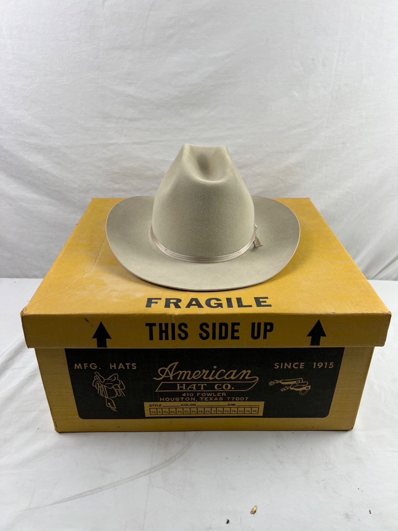 Manufactured by American Hat Co. Small stain on top of hat. Includes original box and silk sheath
