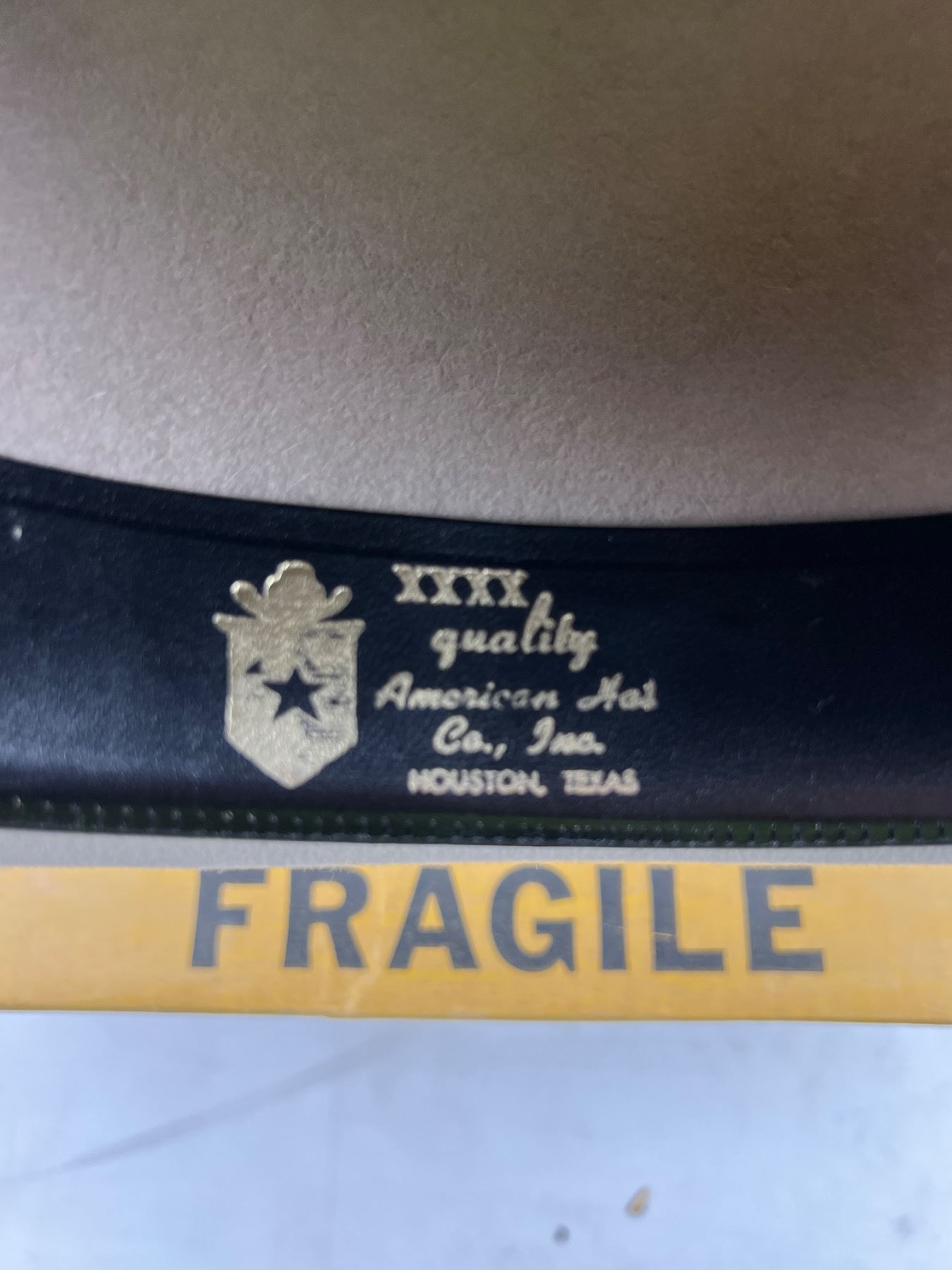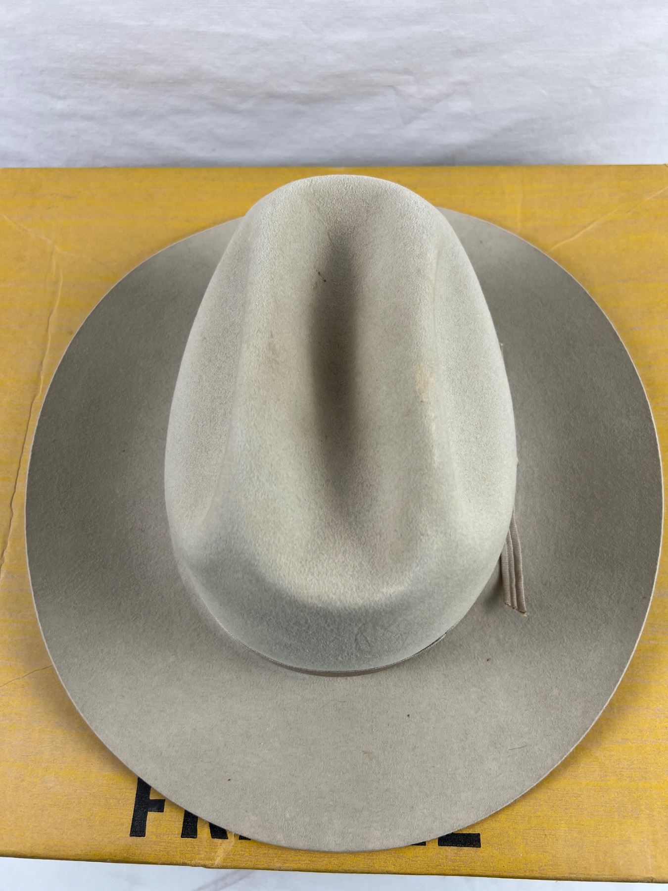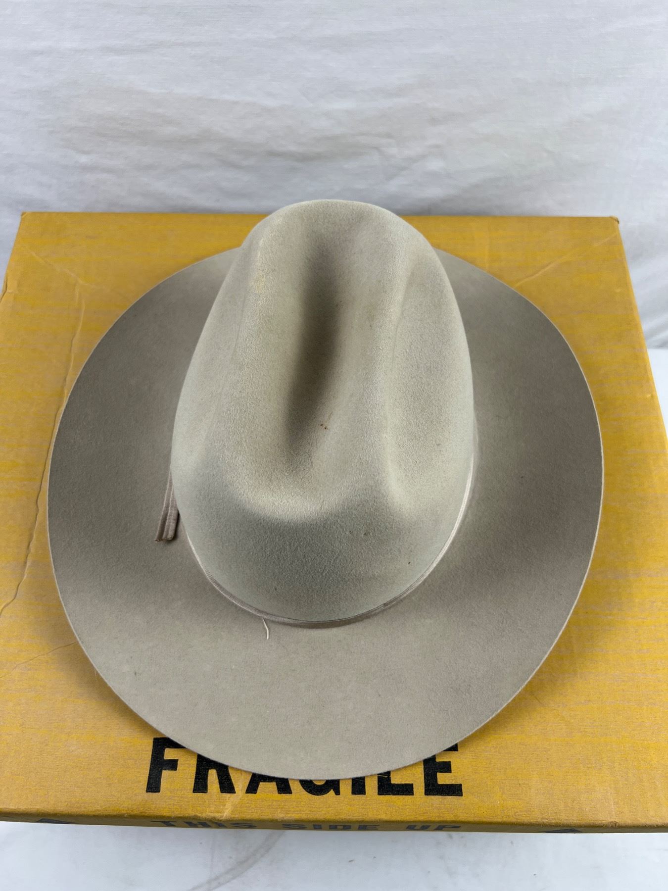 Manufactured by American Hat Co. Small stain on top of hat. Includes original box and silk sheath