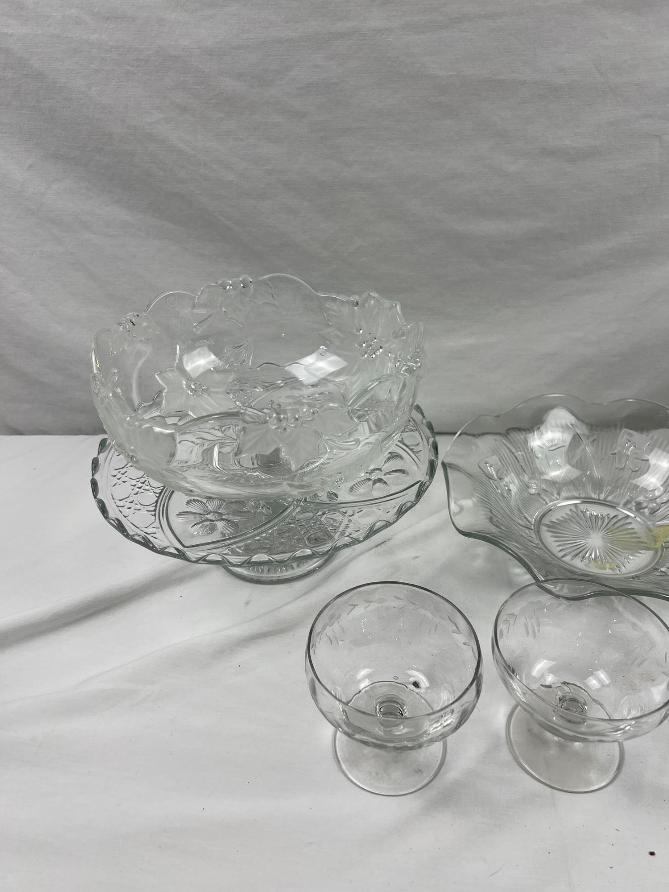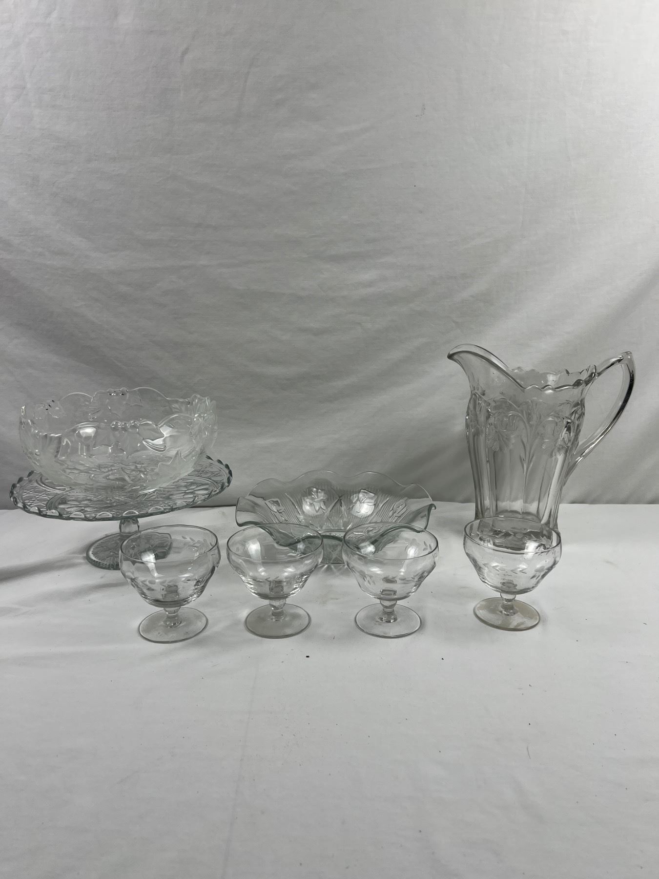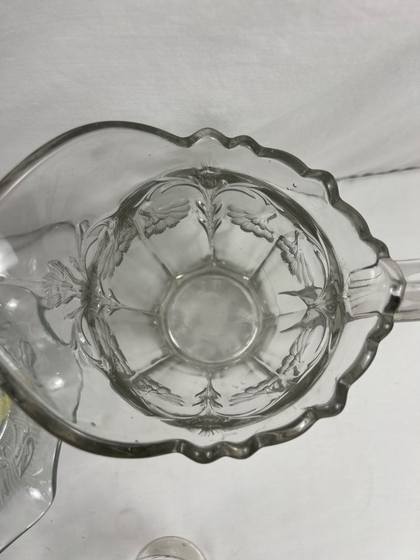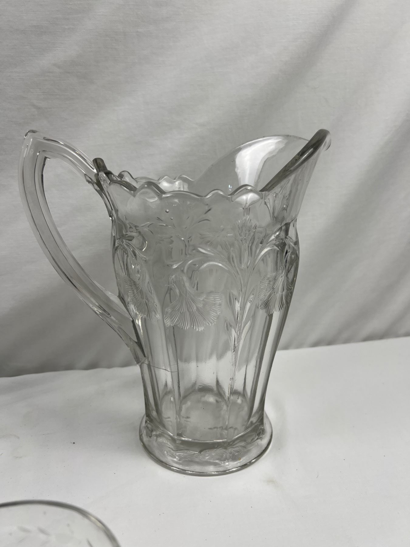 Pitcher is 9" tall. Staining to one of the bowls and crack at rear of base of pitcher.