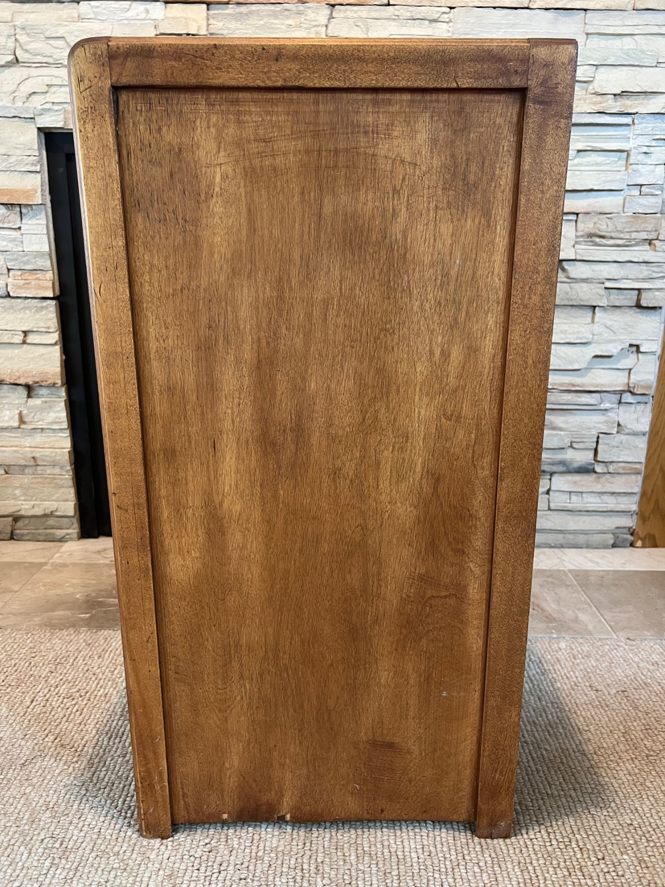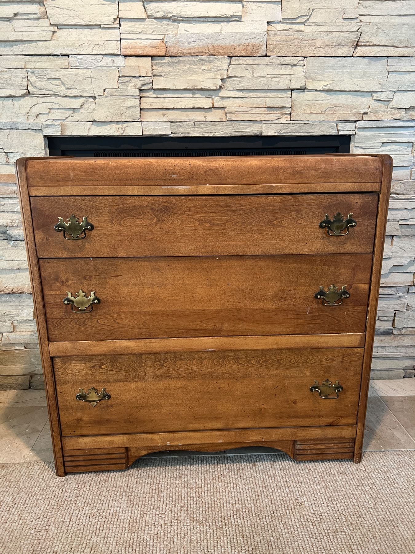 35"H and 35"W and 18"D. Will tip over if all 3 drawers are extended at the same time. Some stains to top of dresser.