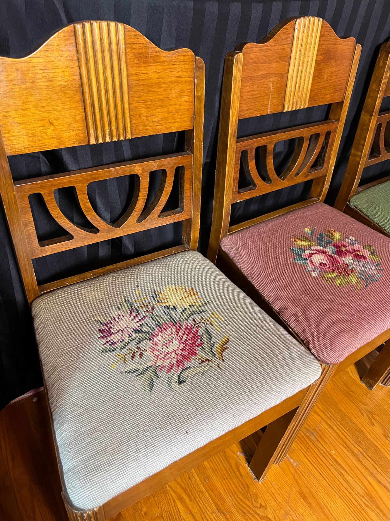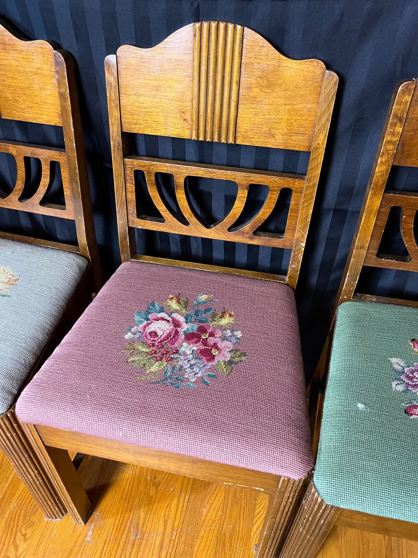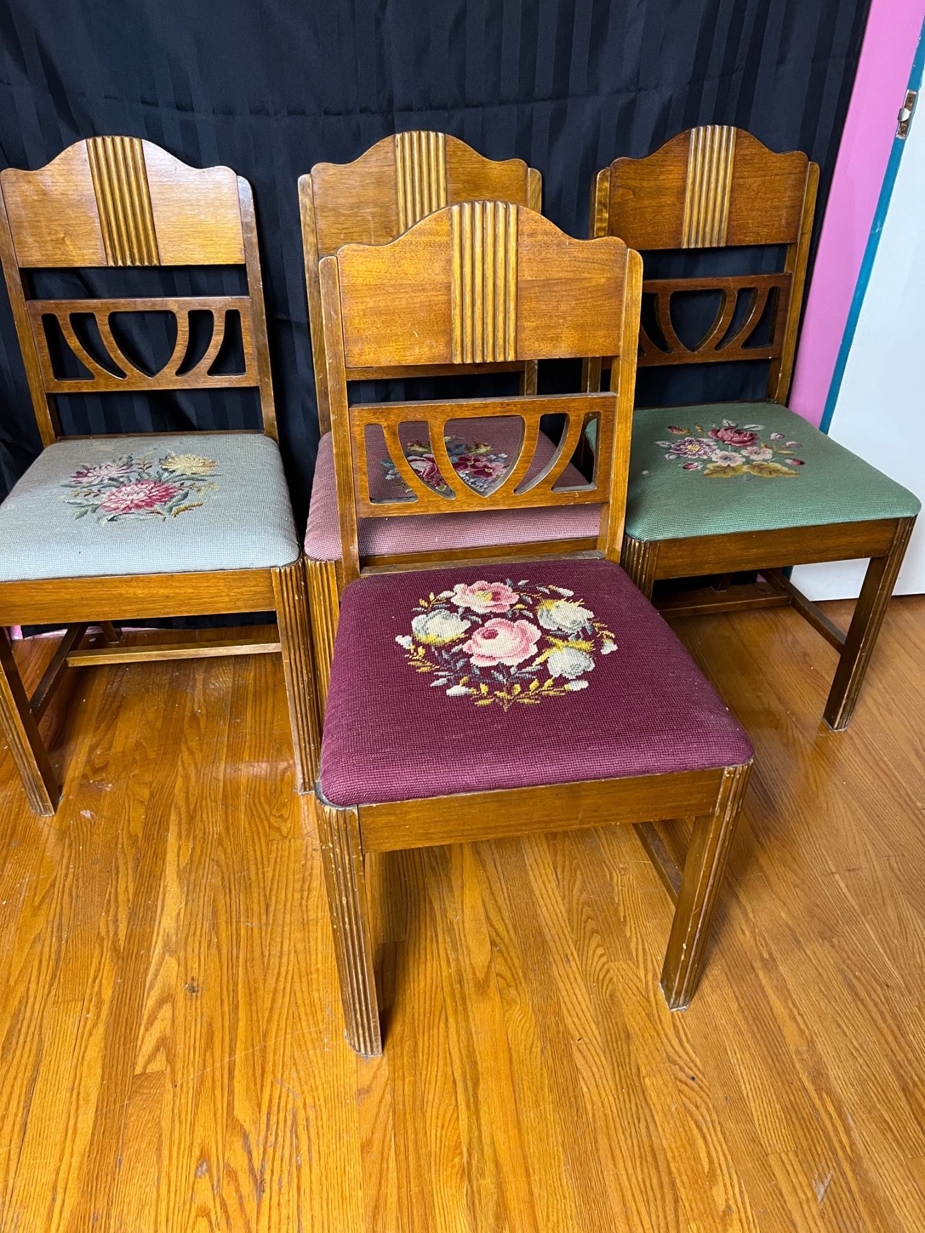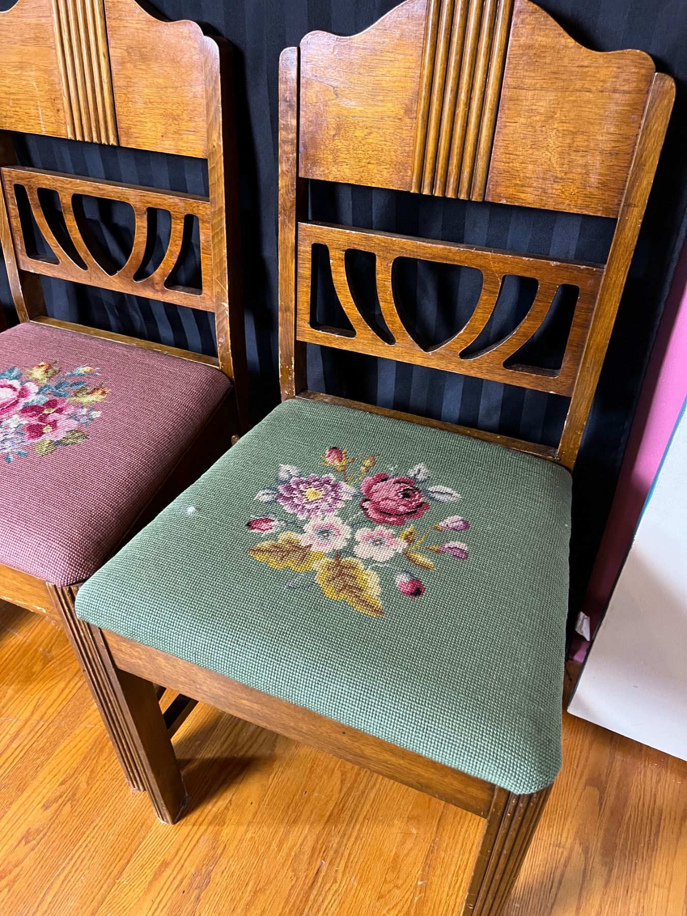 The upholstery has some wear and tear, Each chair measures approximately 16"W x 18"L x 35"H