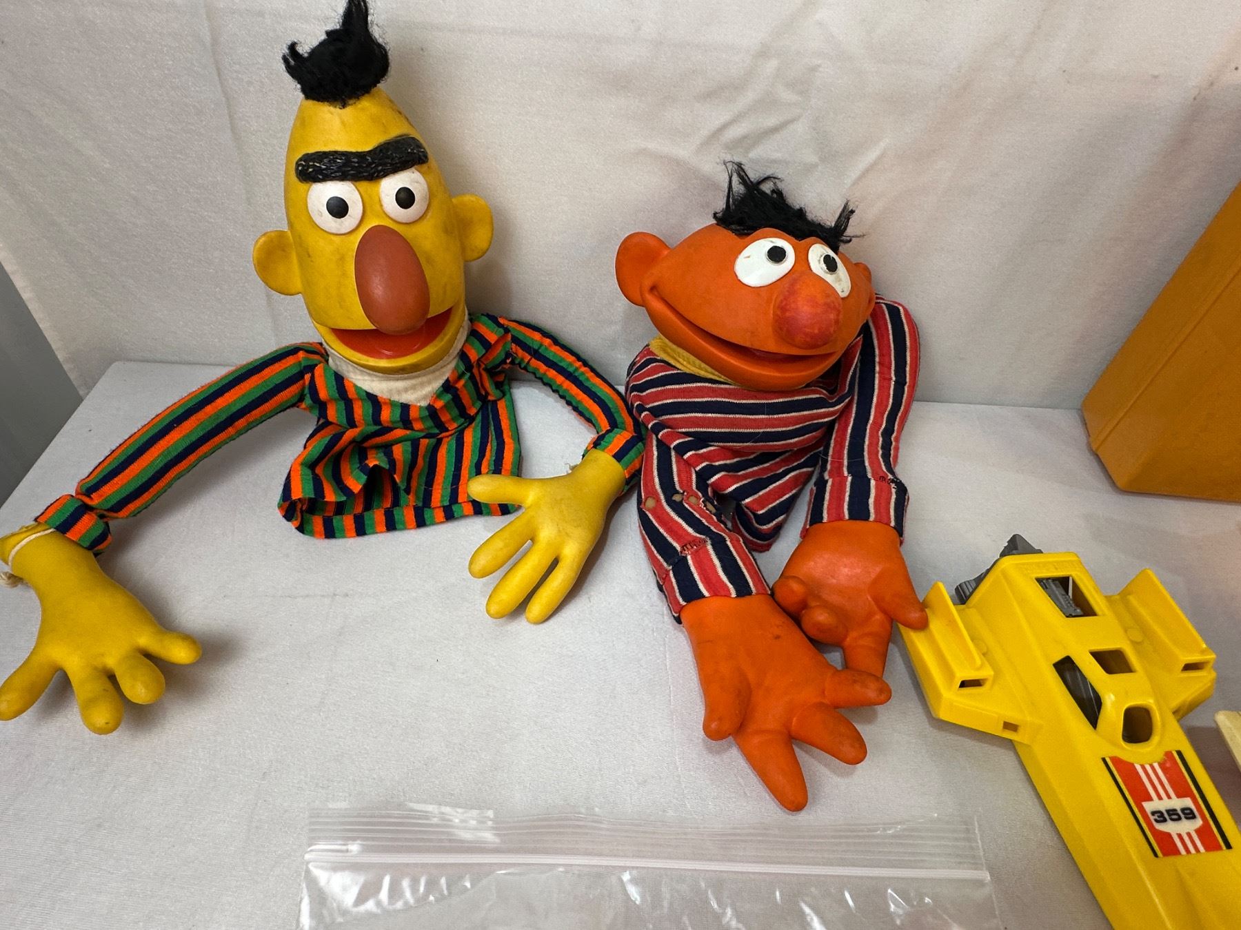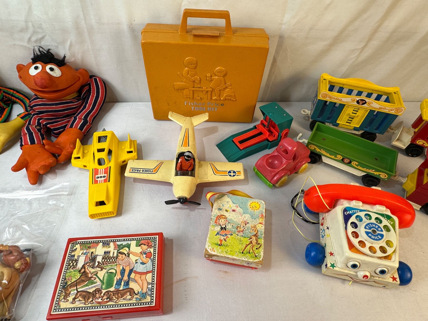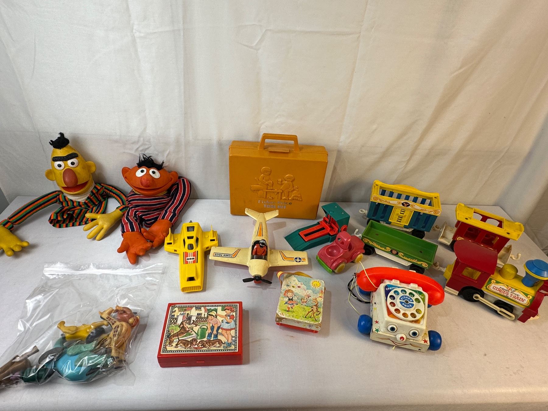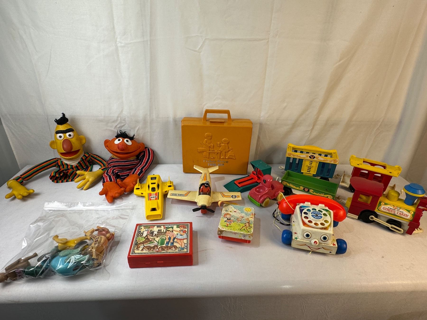 Bert & Ernie hand puppets - Fisher Price tool kit (full) - 4 pcs Circus Train - Fisher Price Phone/Radio/Plane/Shuttle/Pilot/Animals
