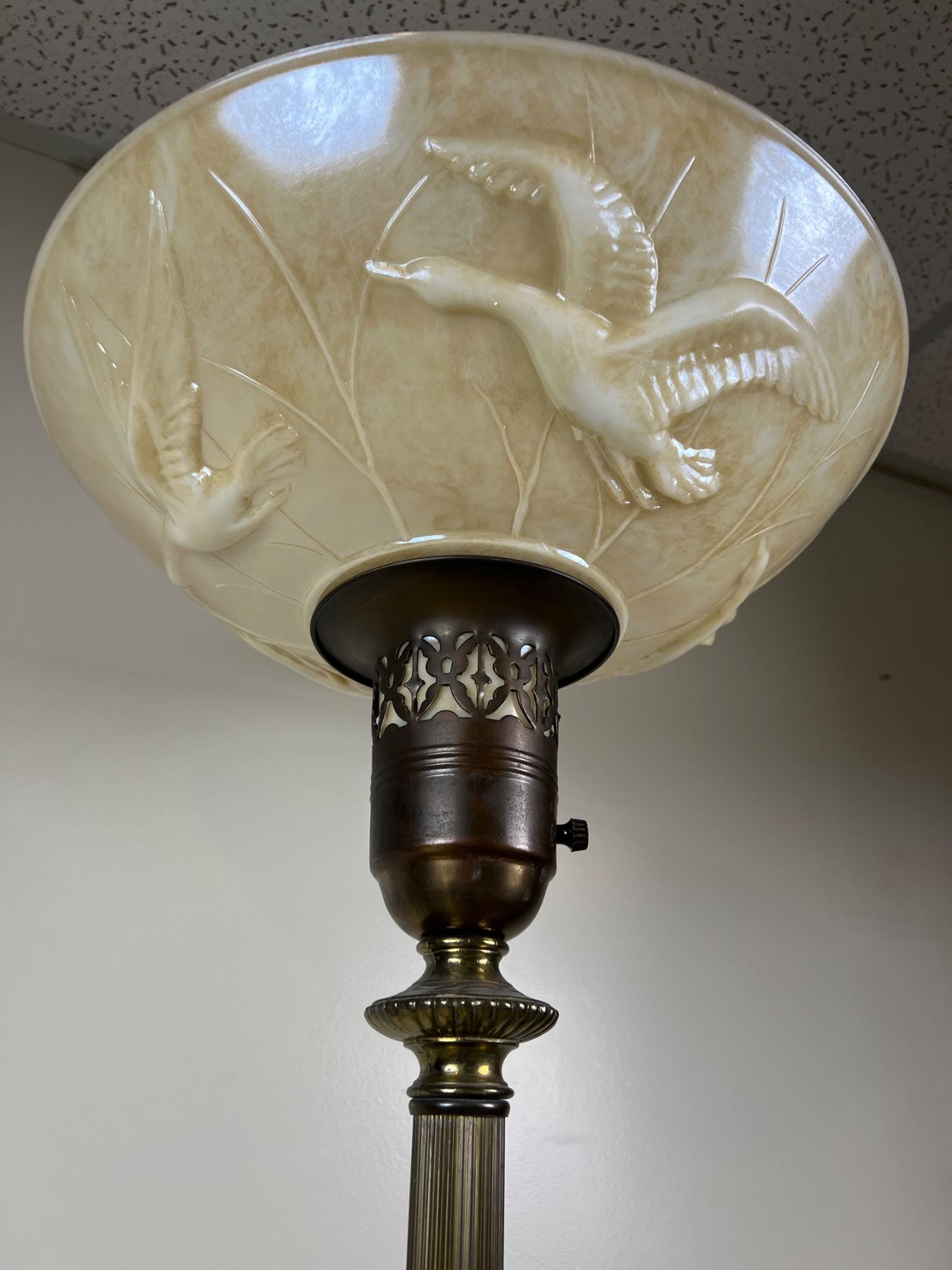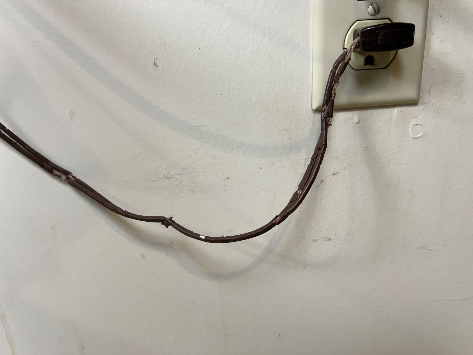 Power cord is damaged (see photos), has various light settings, 64"H