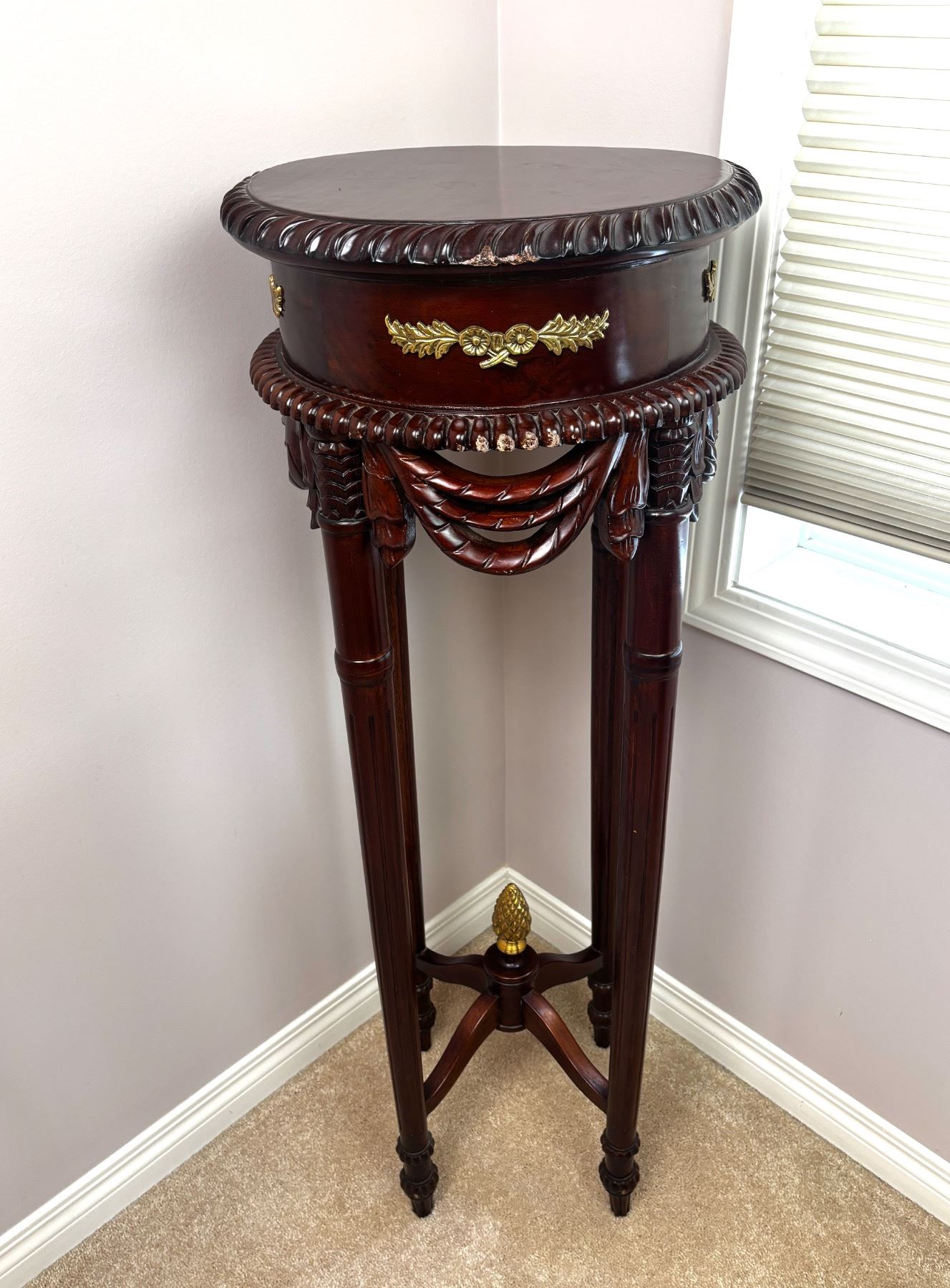 Decorative piece for displaying items. Likely Victorian Era but no way to confirm. Approximately 15" in diameter and 42" tall. One of the wooden ribbon banisters was broken off and glued back on. Metal embellishments have been damaged on one side of the table. Nicks and scratches to wood.