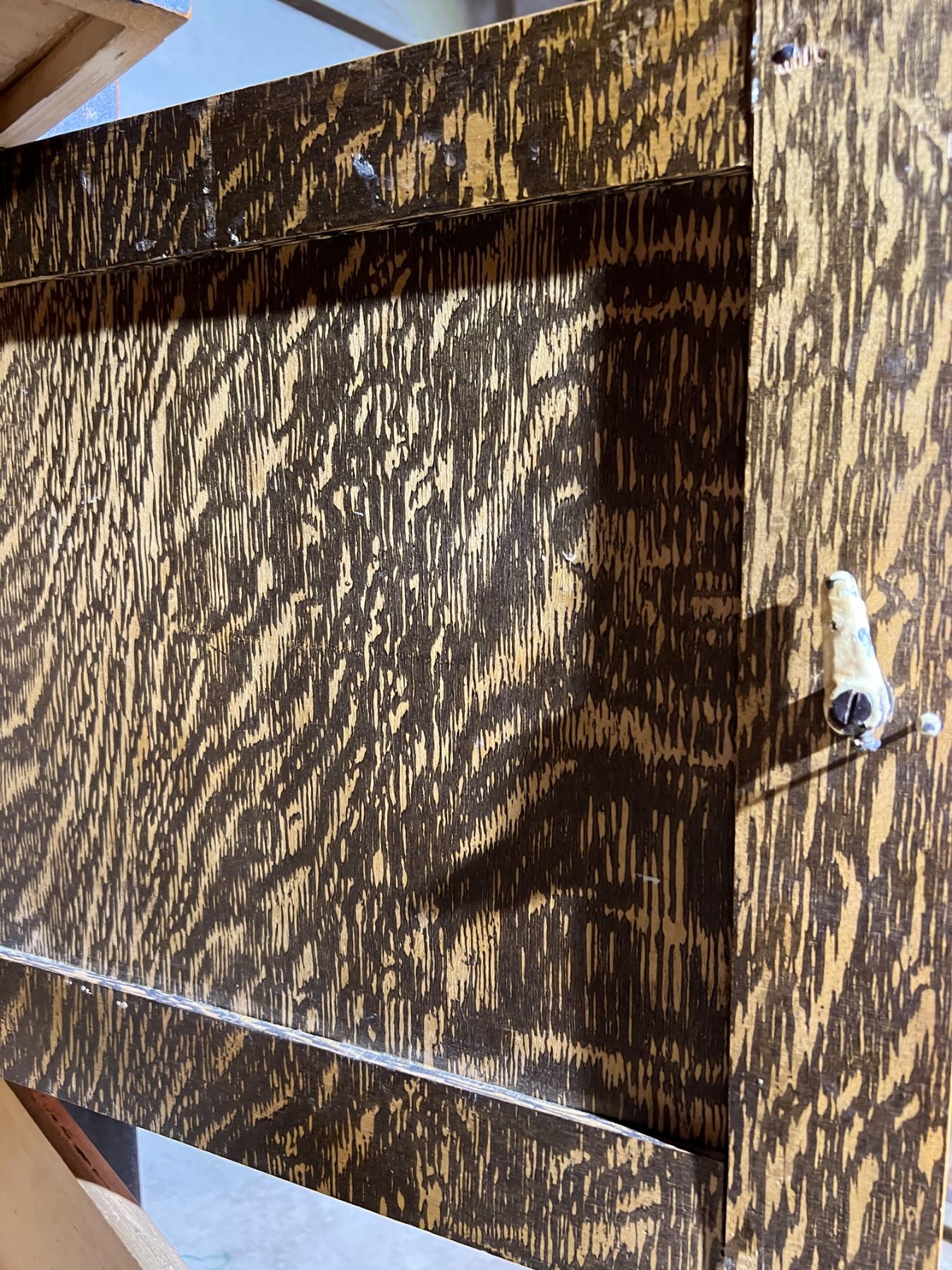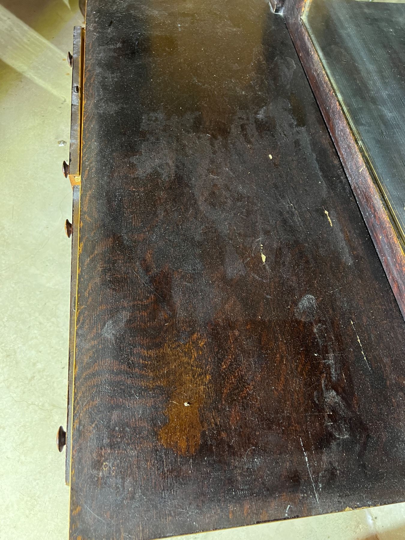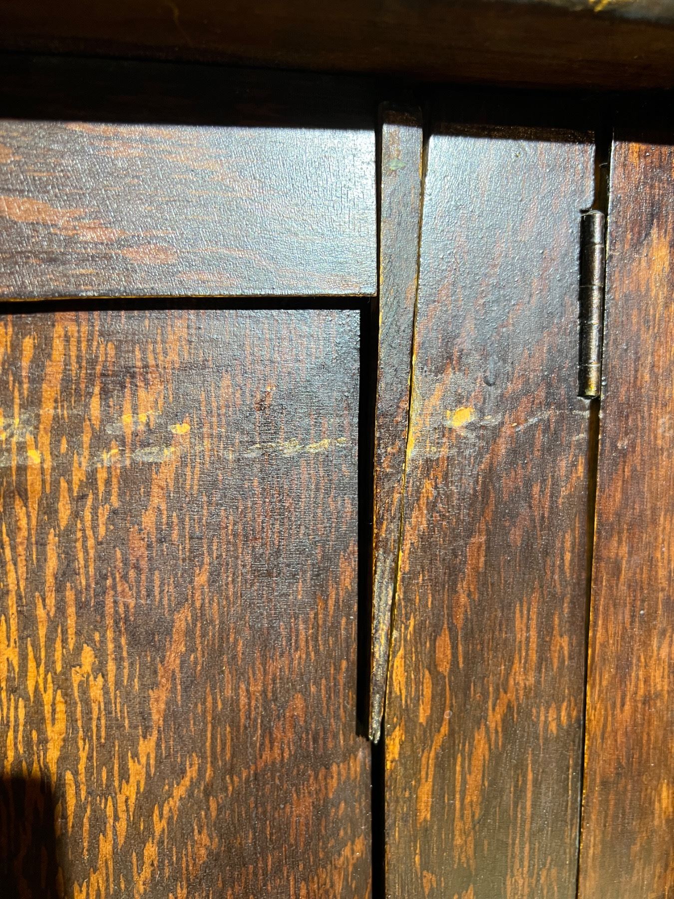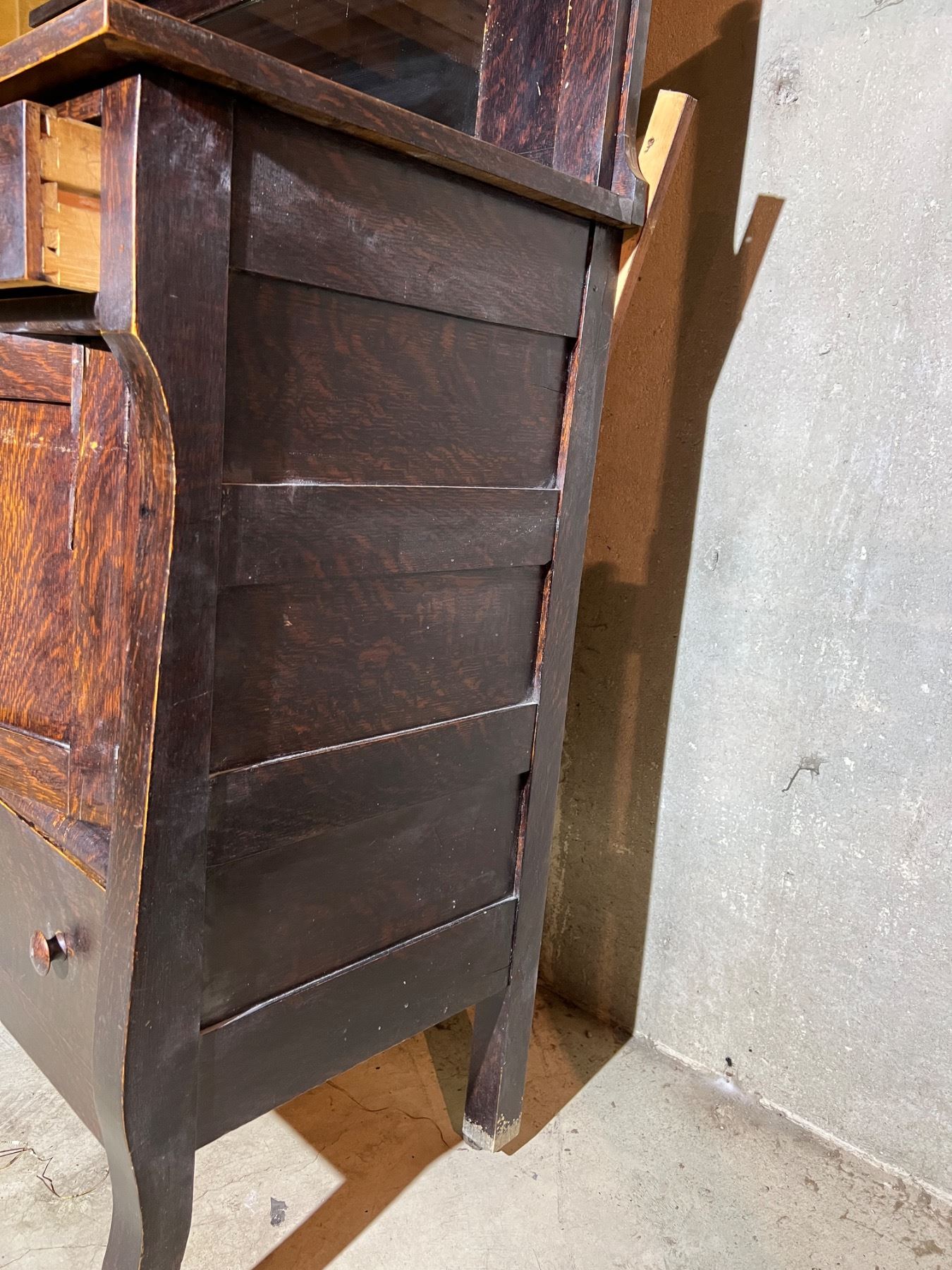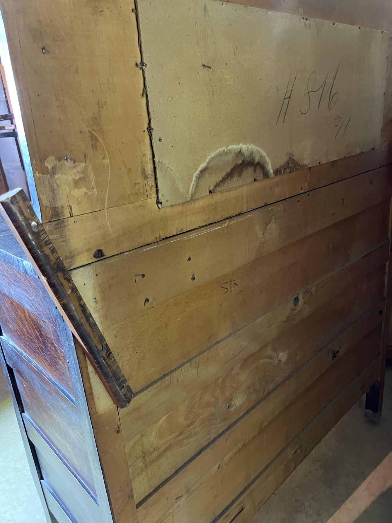 Measures 58" tall by 46" wide and 20" deep. Discolouration to top panel and sides and there is a sliver of wood on the front door that is damaged.