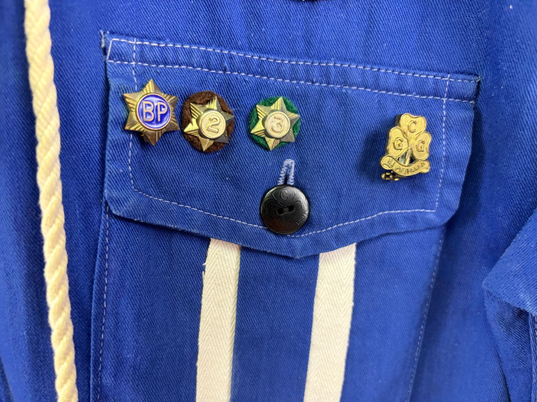 Includes, Official Uniform Girl Guides Association button-up dress (unknown size), Canadian Girl Guides whistle, Girl Guides leather belt, Handbook for guides, etc.
