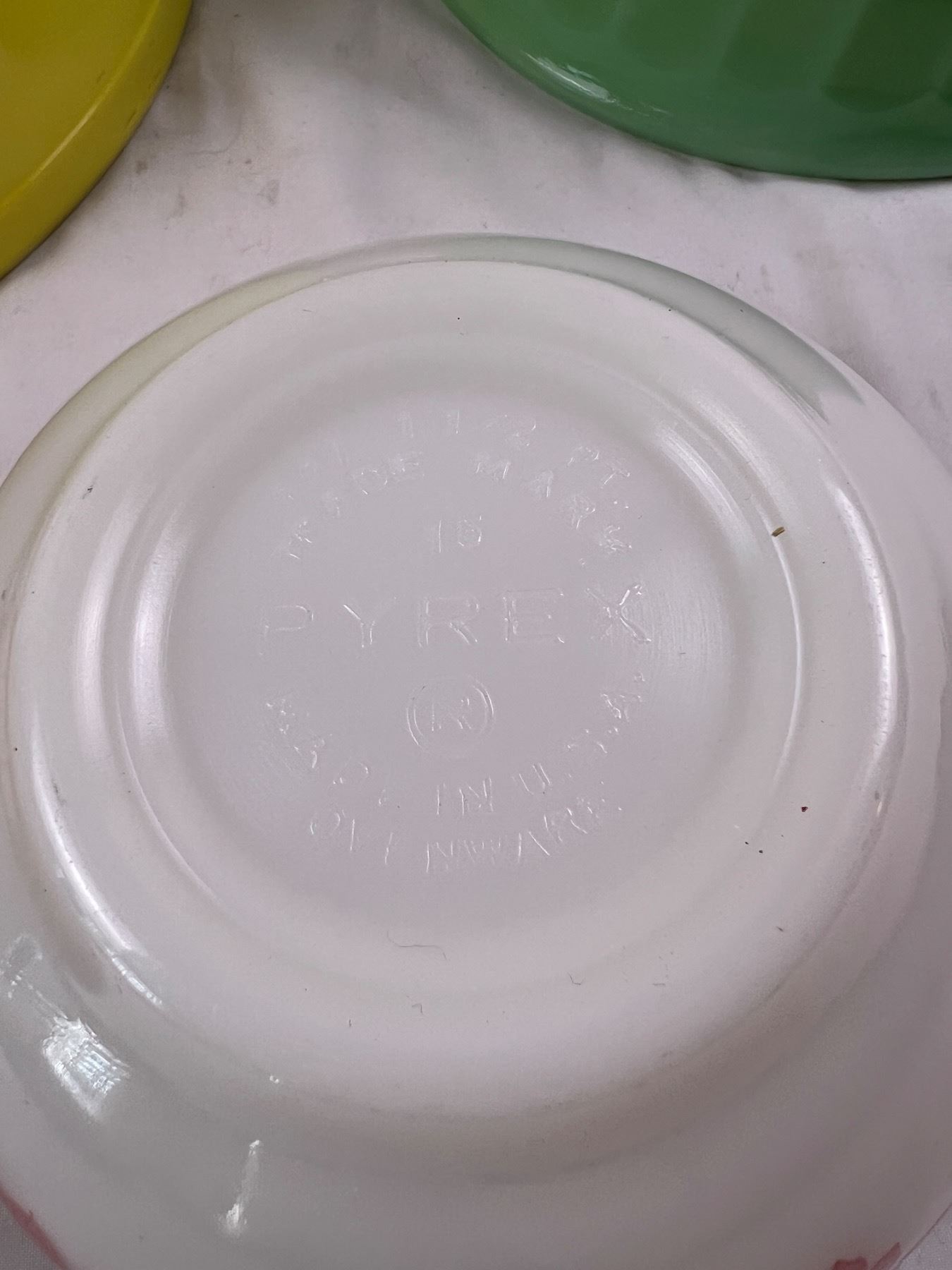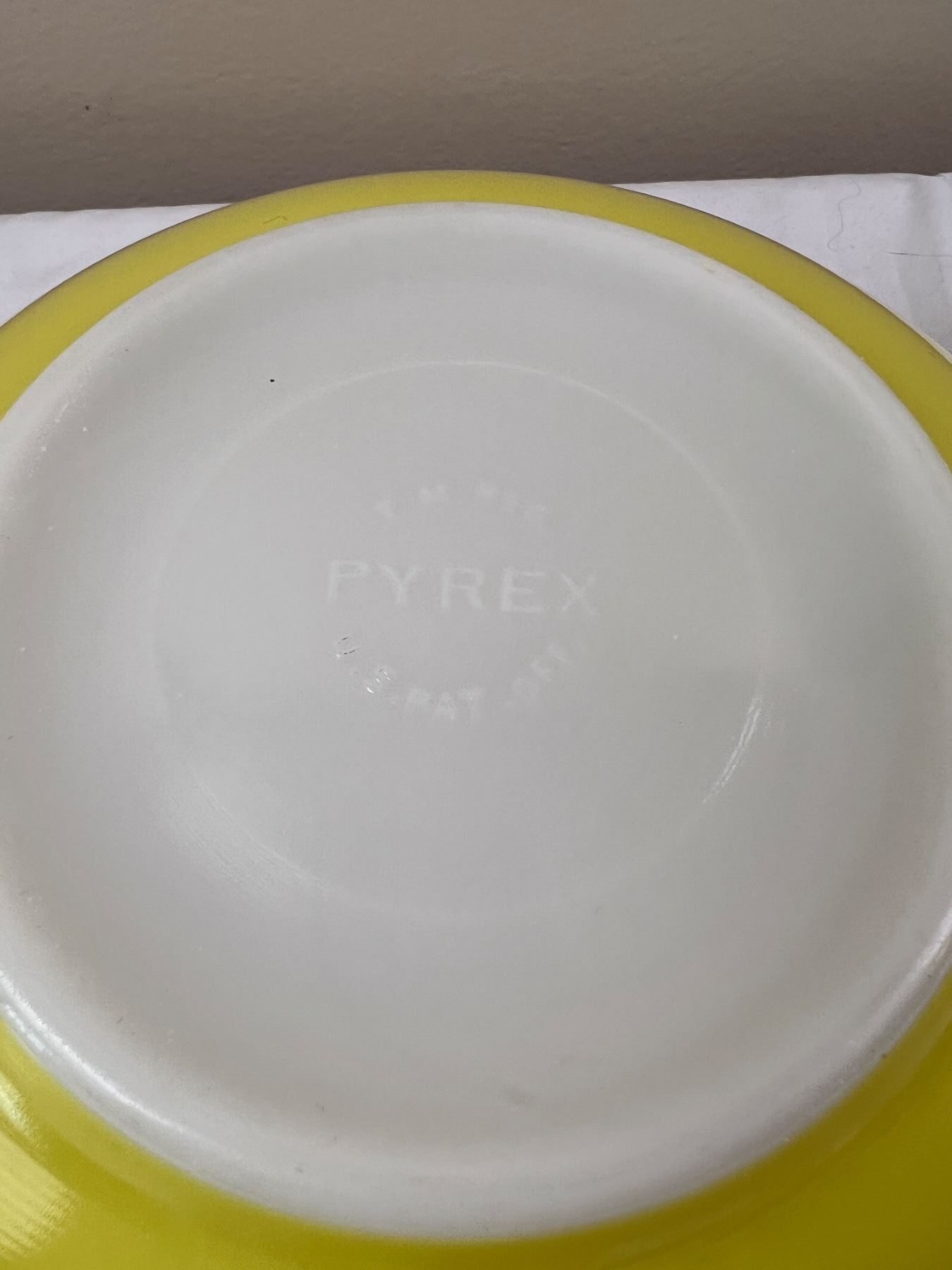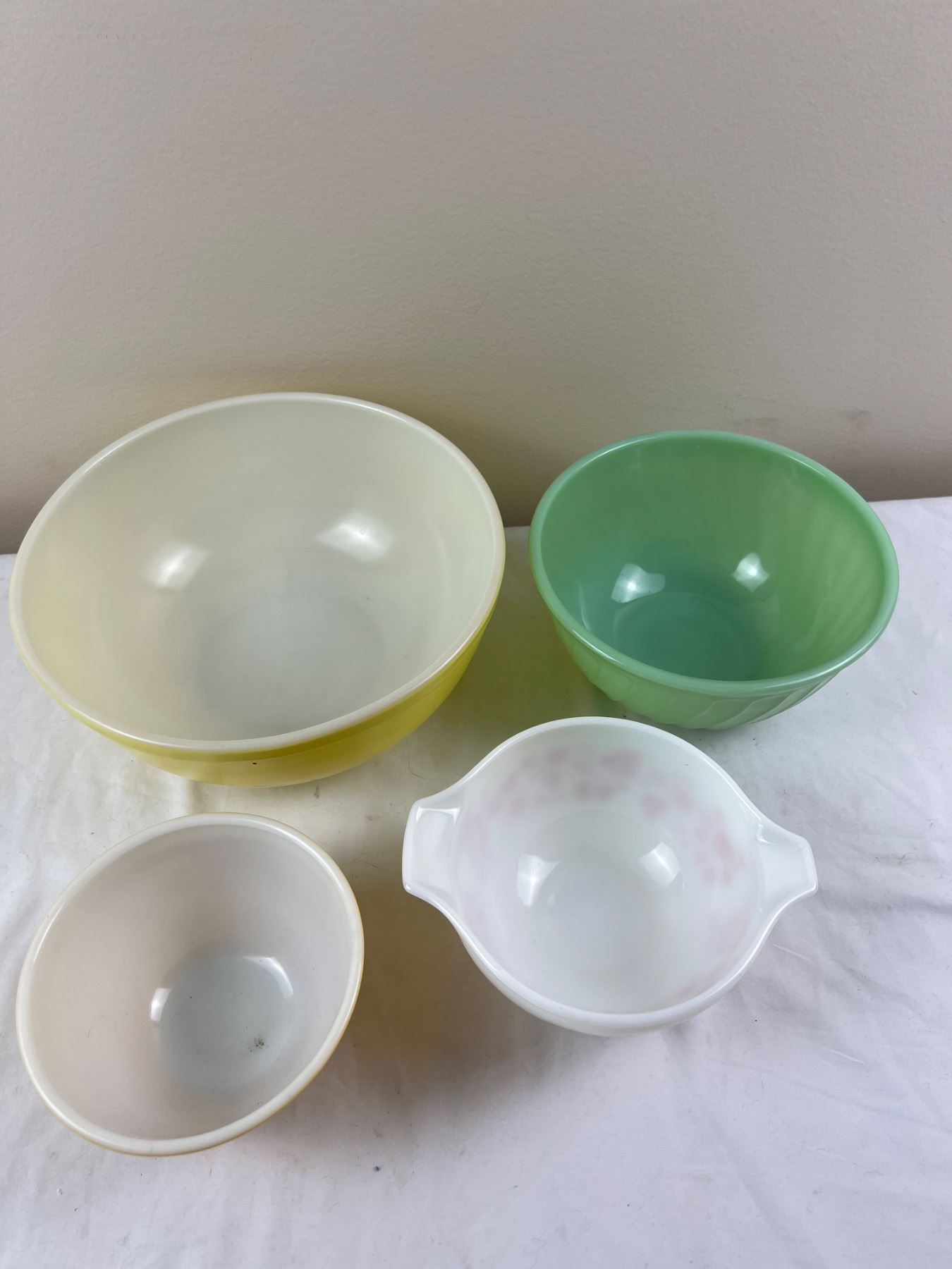 Includes three Pyrex bowls (large yellow bowl is 10.5"diameter), and one Fire King bowl, some wear