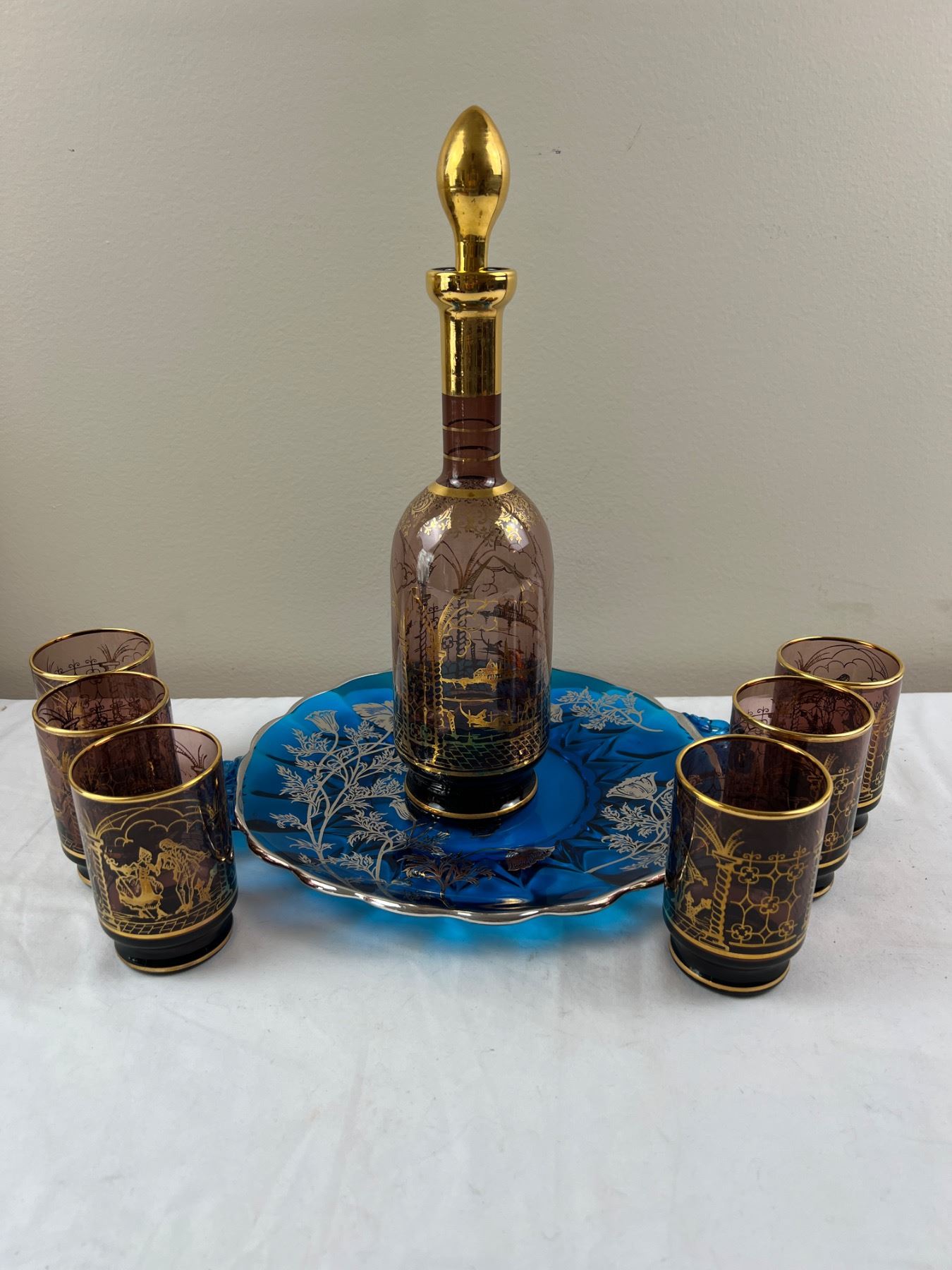 Includes a seven piece decanter and glass set as well as a elegant blue plate (13"diameter)