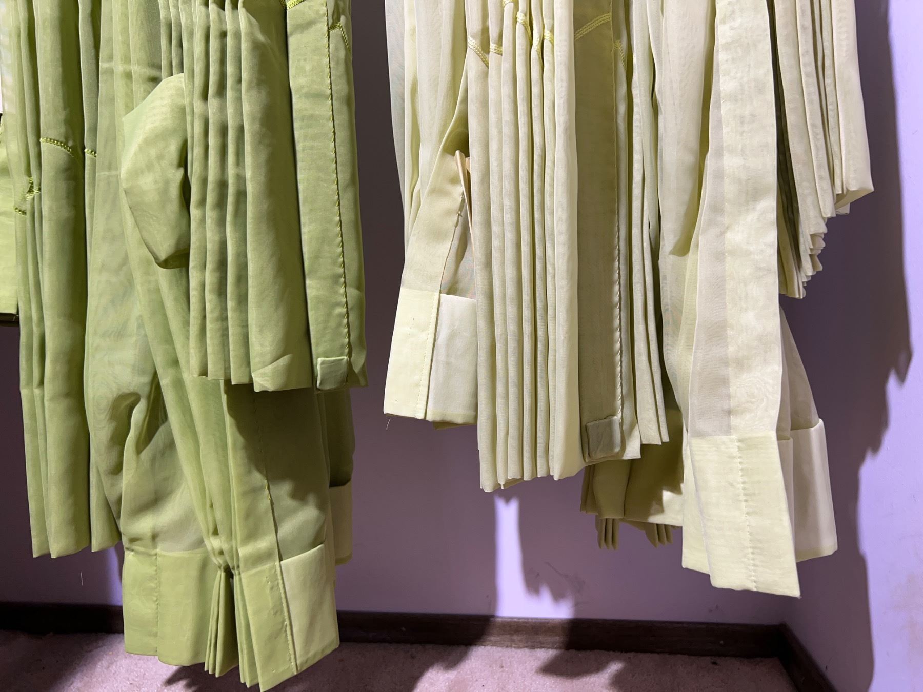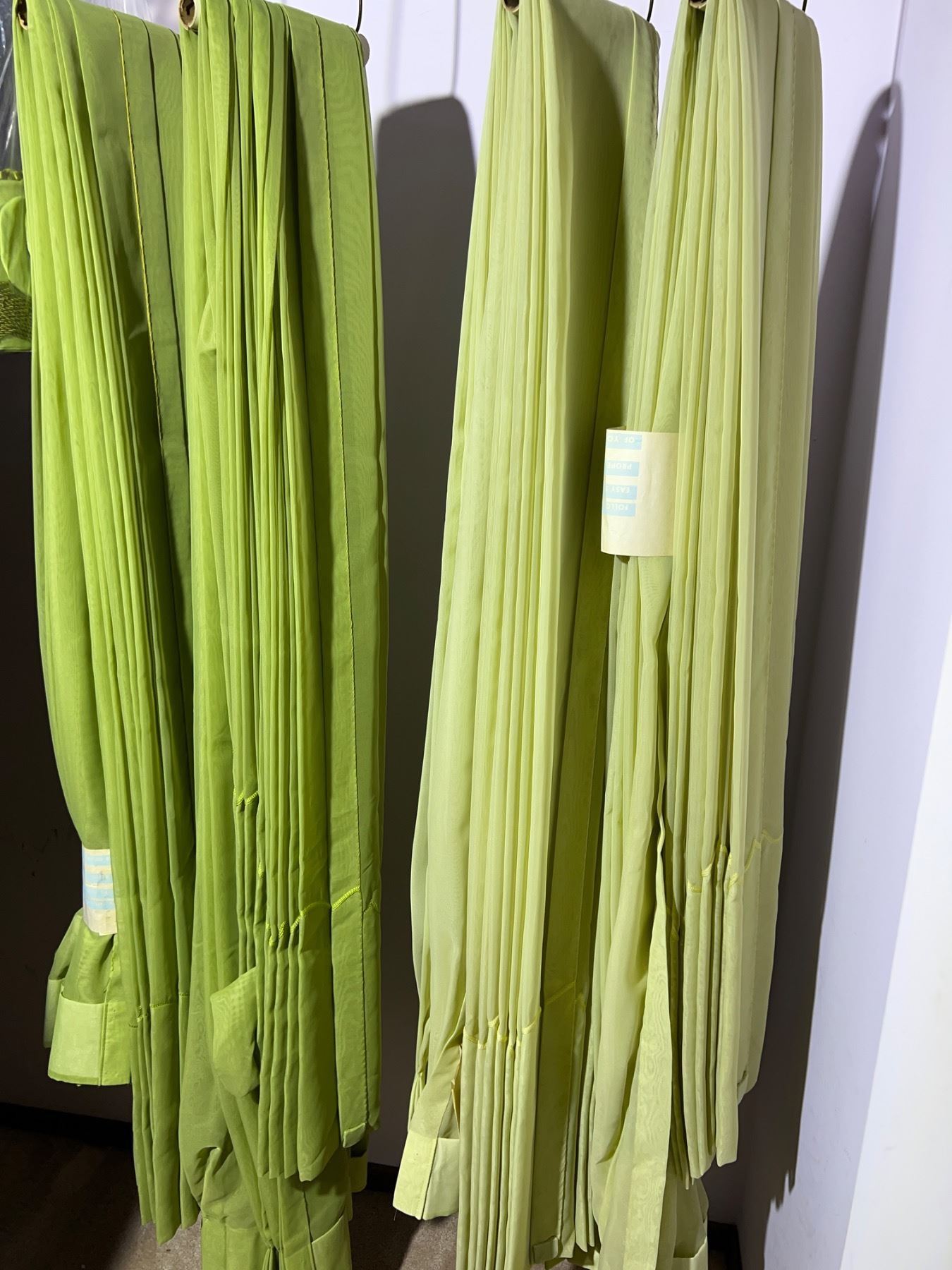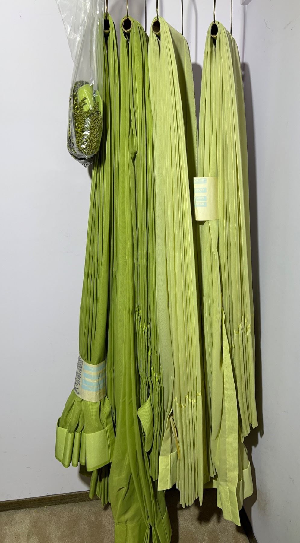 Includes four curtains total, two are a lighter shade of green and two are a darker shade, each one approximately measures 5'W x 80"L