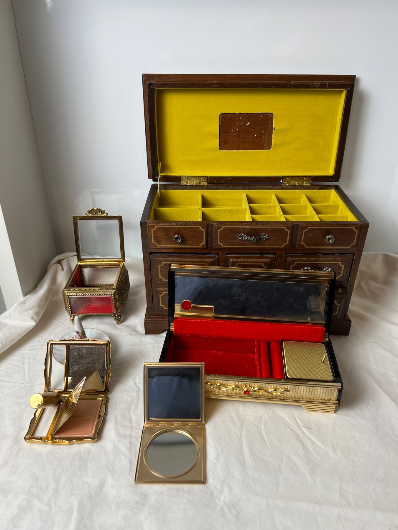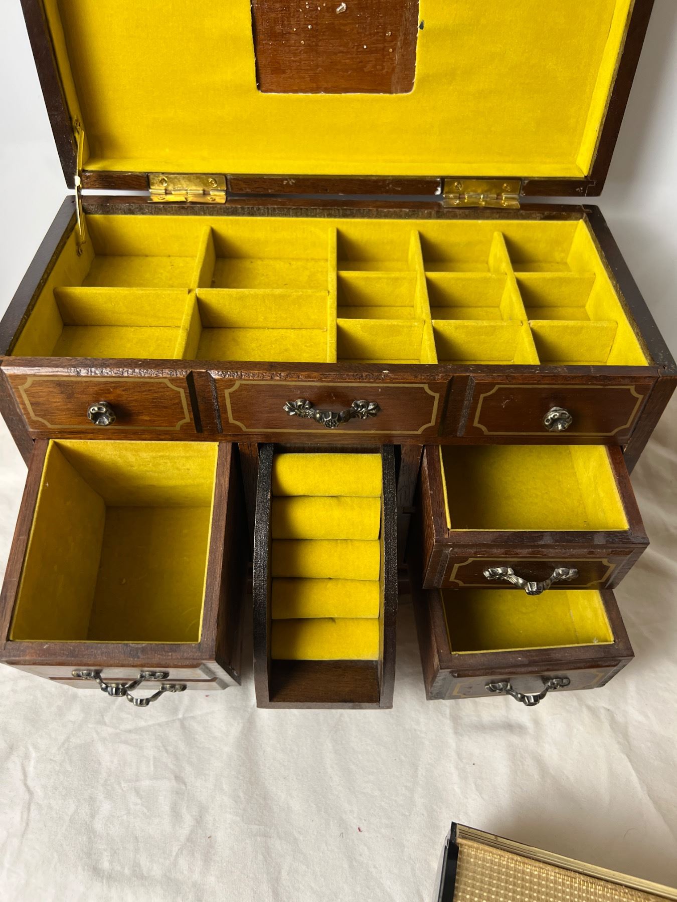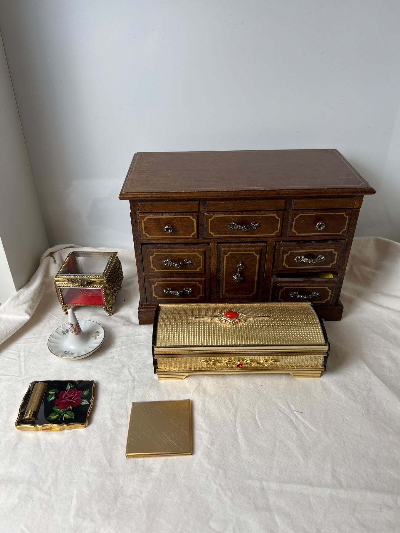 Wooden piece has some markings to top and sides from scrapes. Large gold box is working music box. Large piece has small crank on rear but has no noticeable effect. Measures 9"H by 12"W and 6"D
