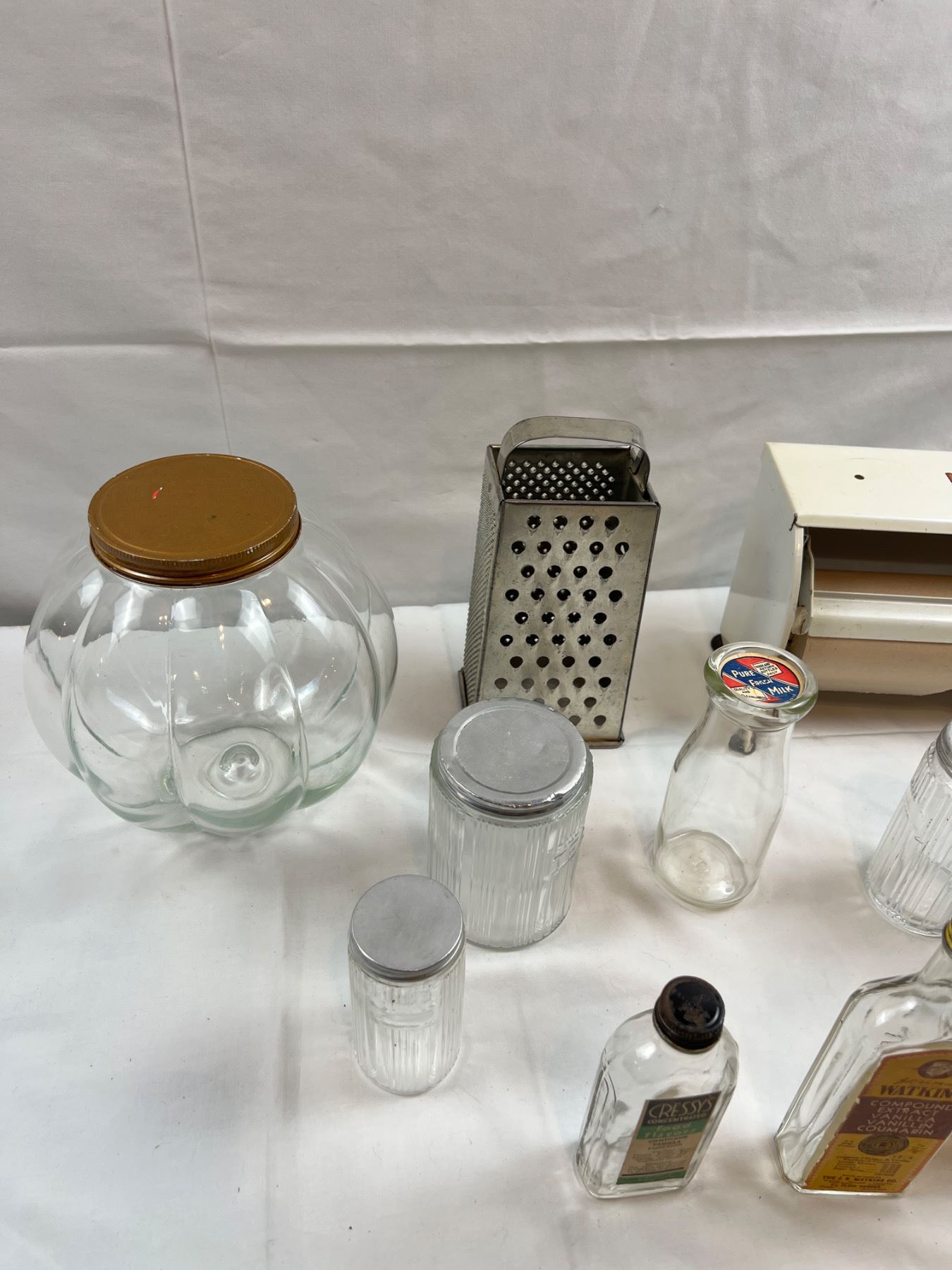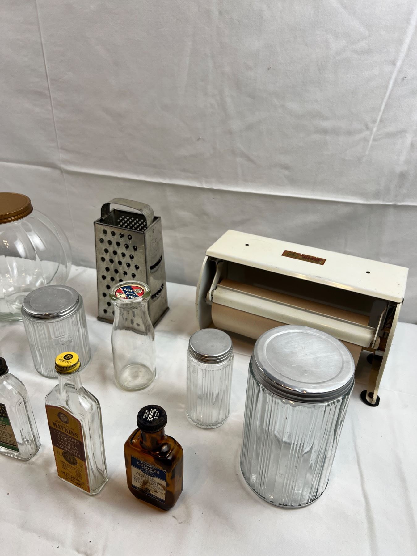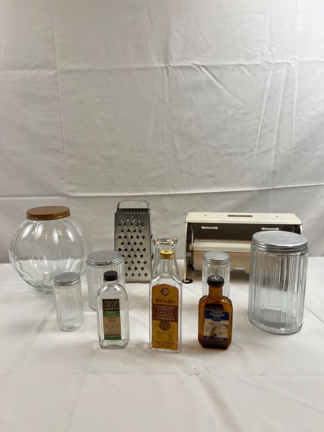 Includes vintage glassware and bottles and a vintage paper cutter.