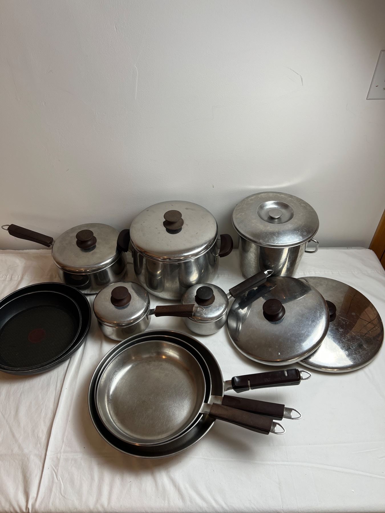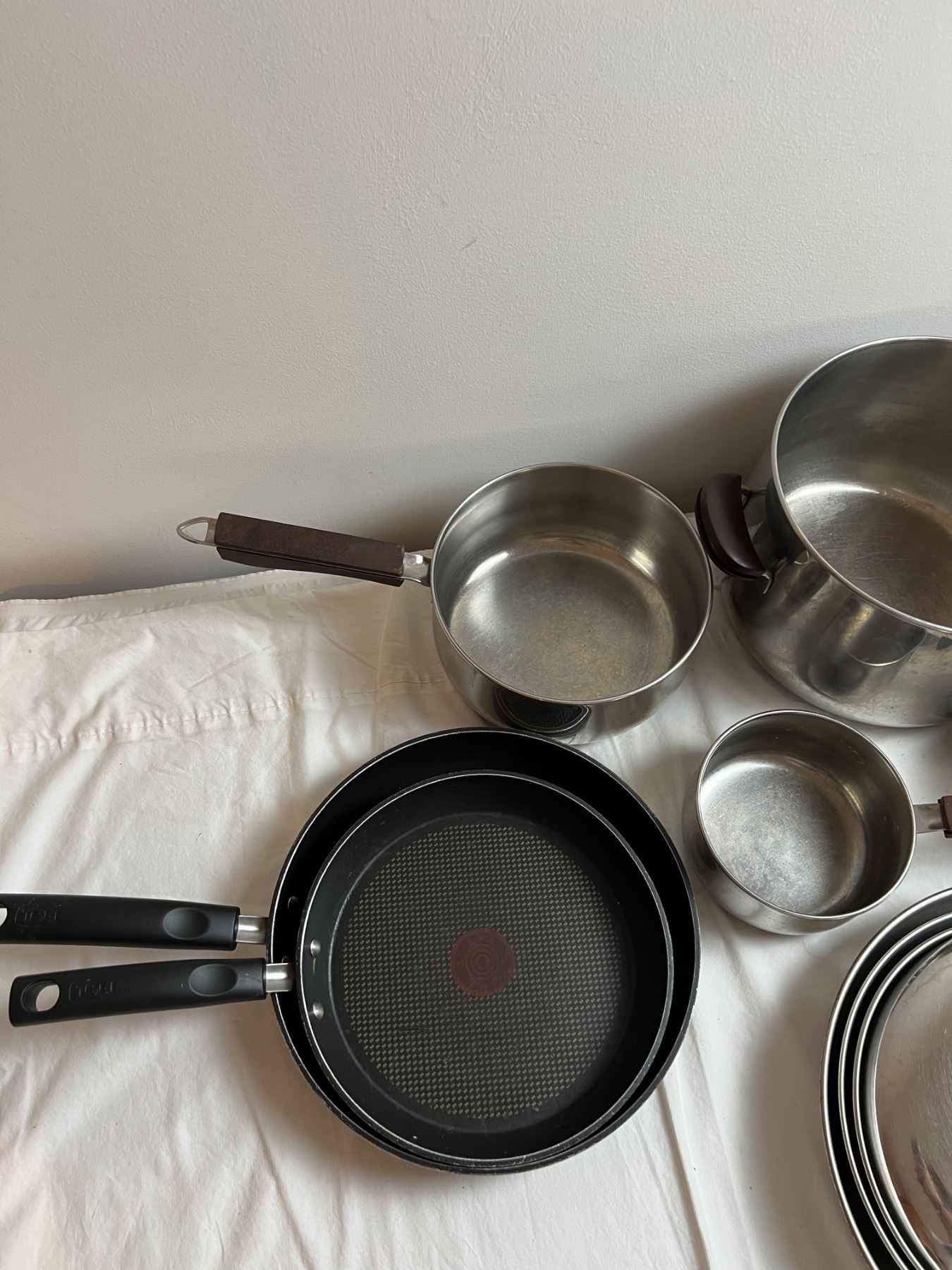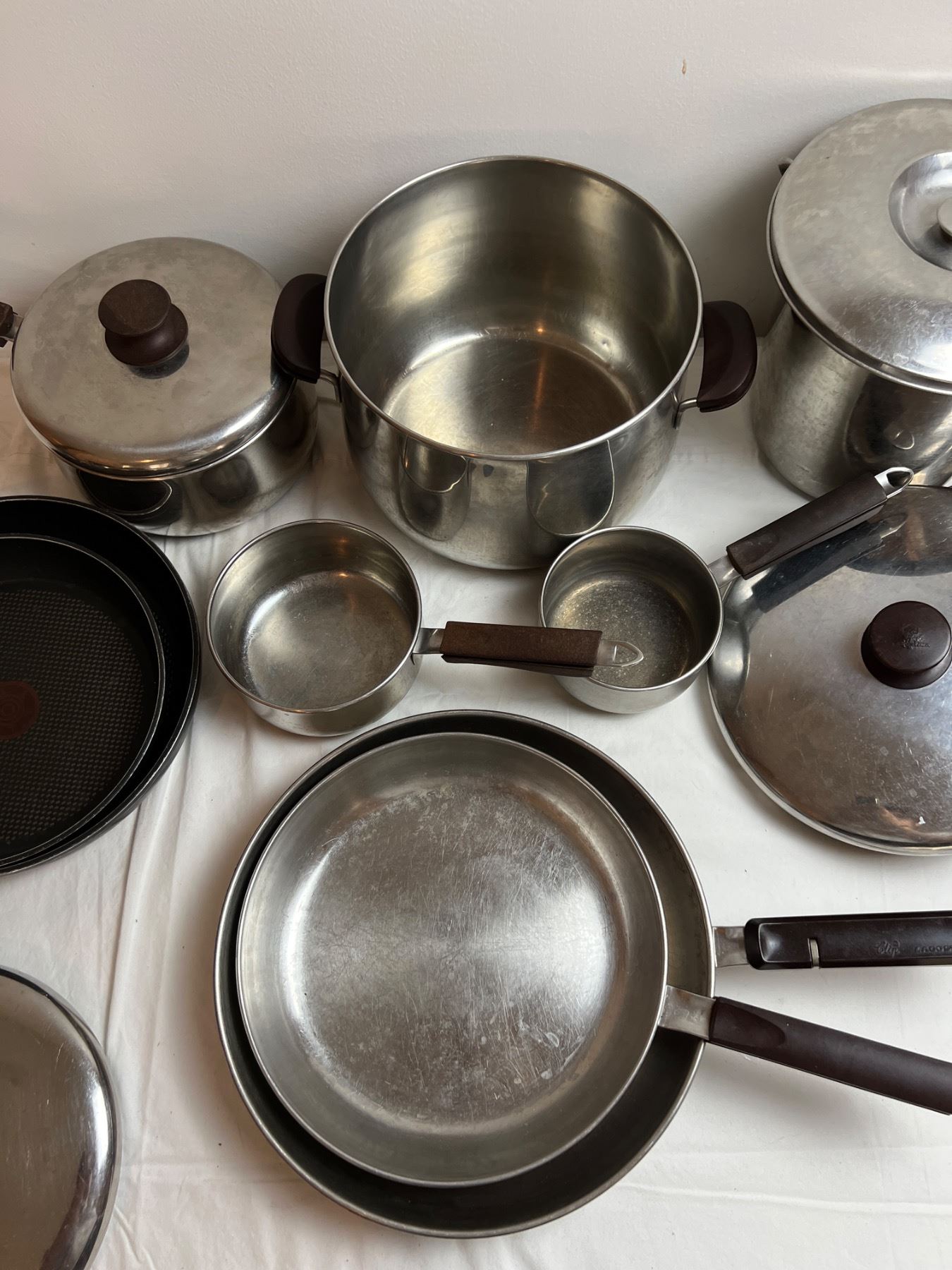 Also features two pieces of T-Fal cookware and an ice bucket. All of the pots and pans have varying level of burns on the base. Some staining to cook surfaces. Largest cooker is 10" in diameter and 7.5" in height.