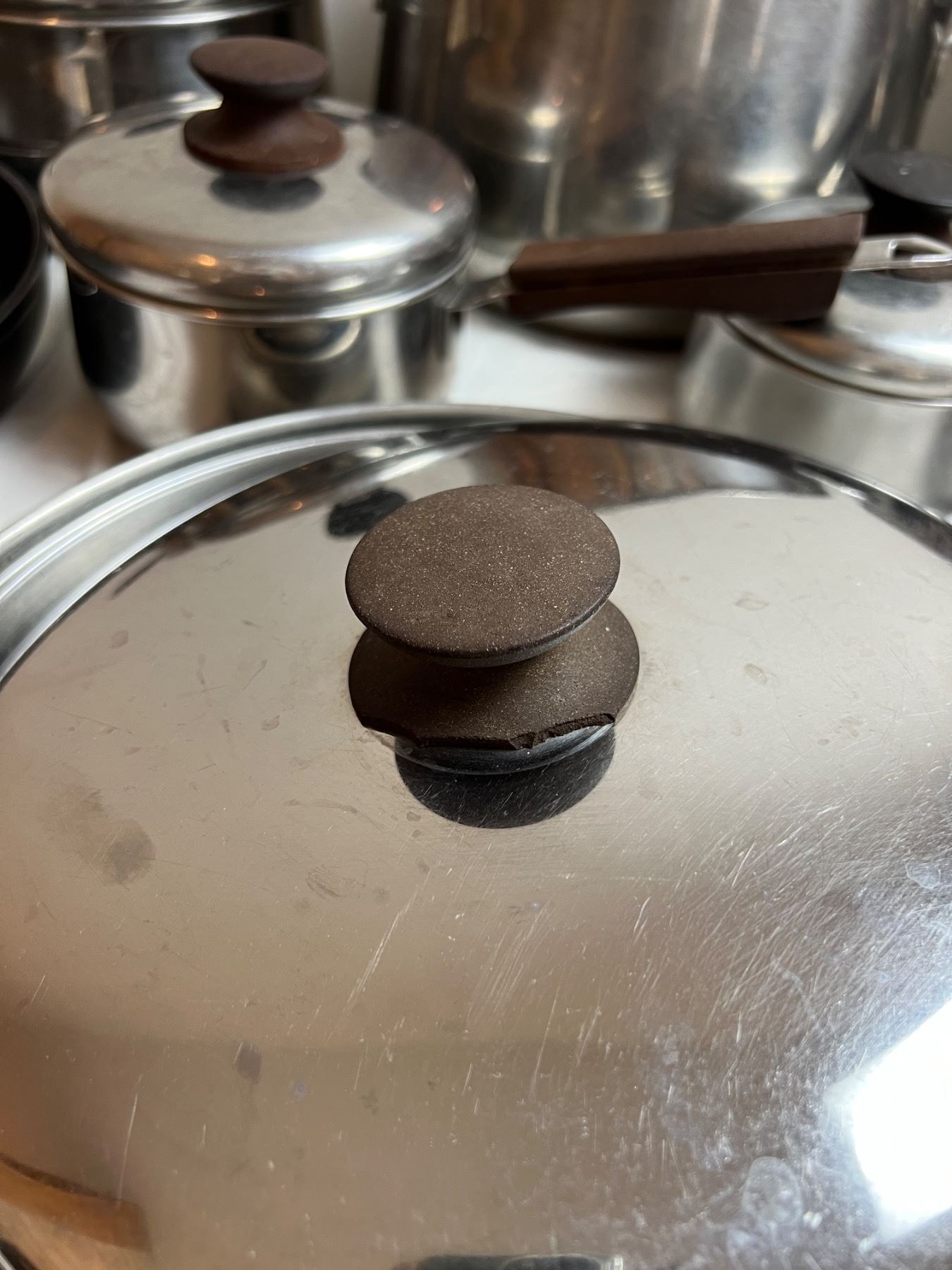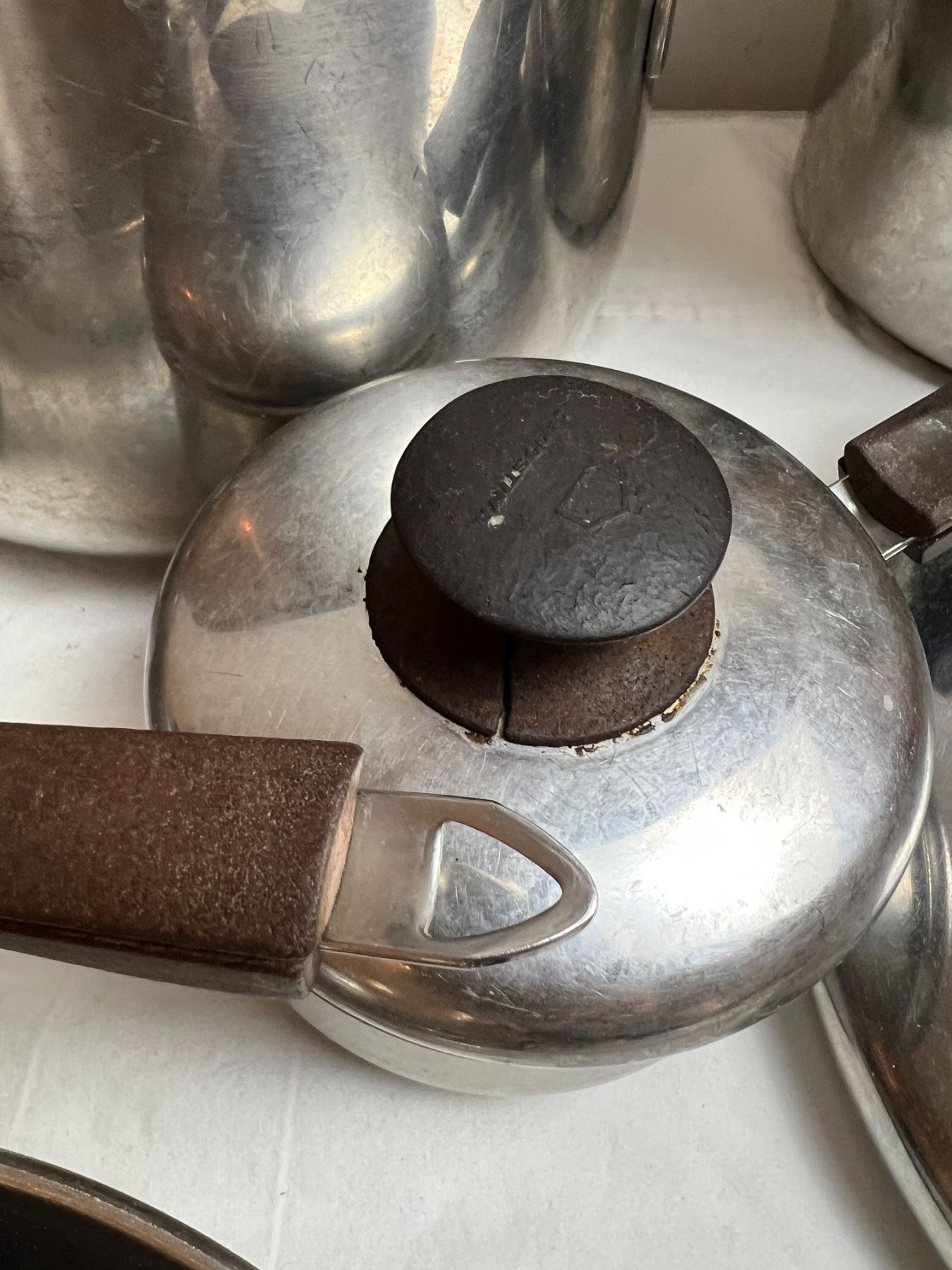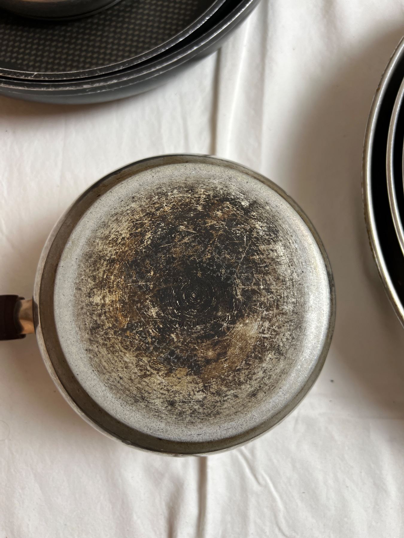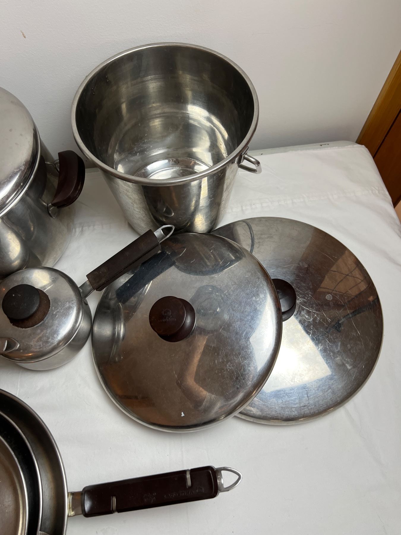 Also features two pieces of T-Fal cookware and an ice bucket. All of the pots and pans have varying level of burns on the base. Some staining to cook surfaces. Largest cooker is 10" in diameter and 7.5" in height.