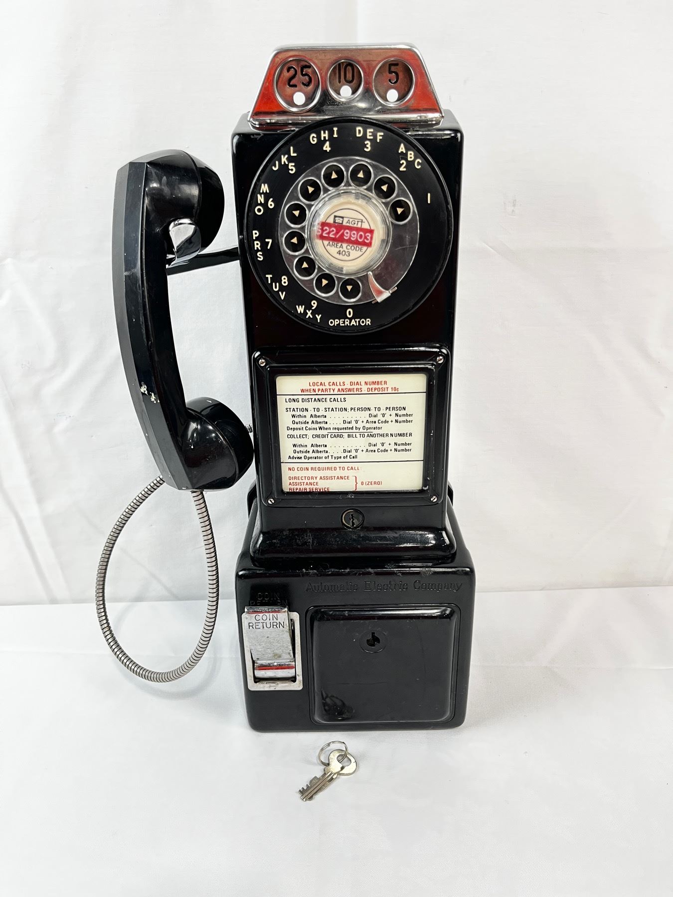 Vintage Automatic Electric Pay Phone. 3 coin slot,rotary dial,with key 18"T x 6 3/4"W. Heavy.