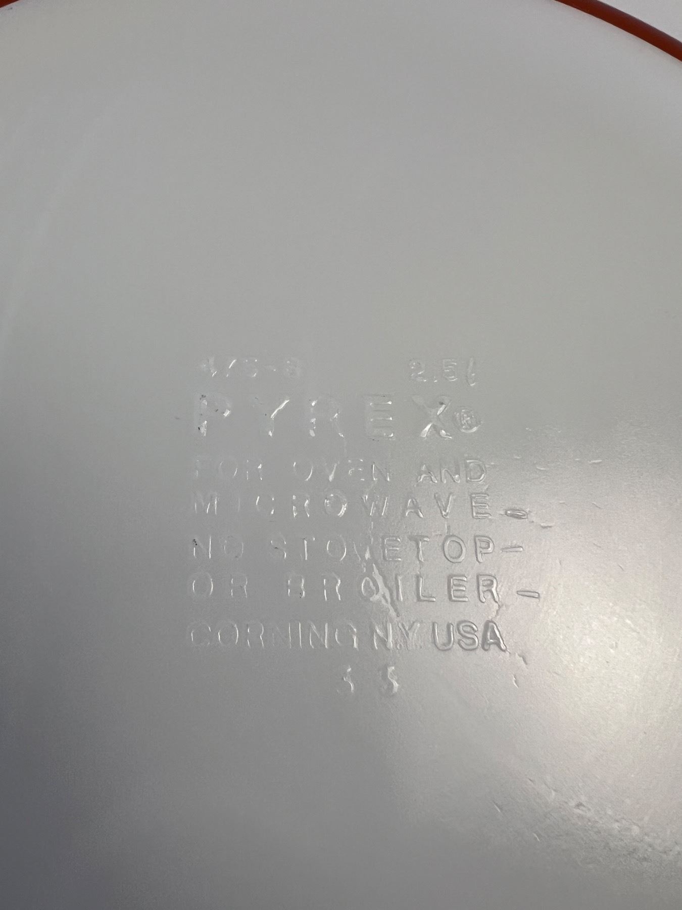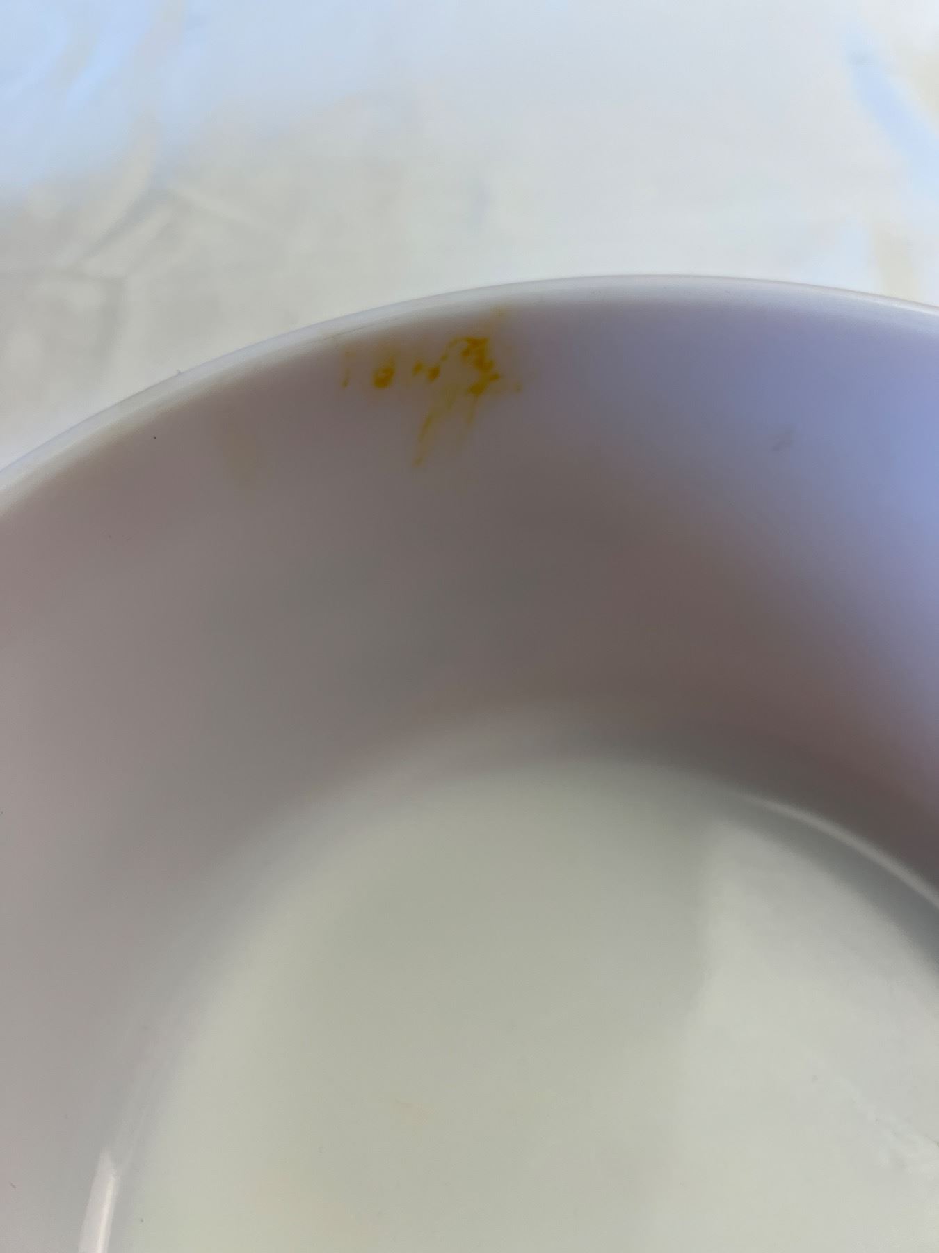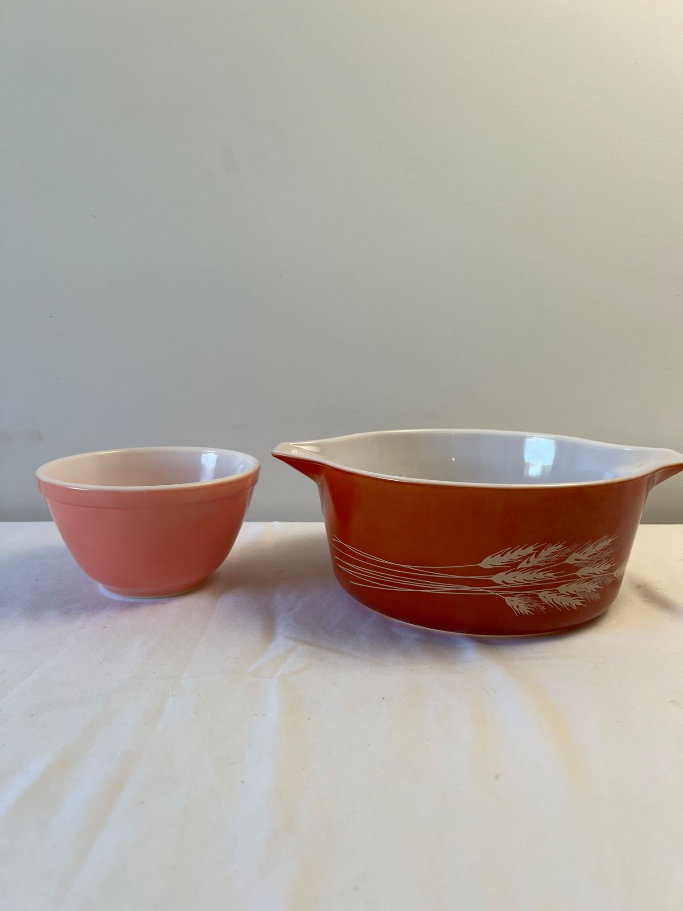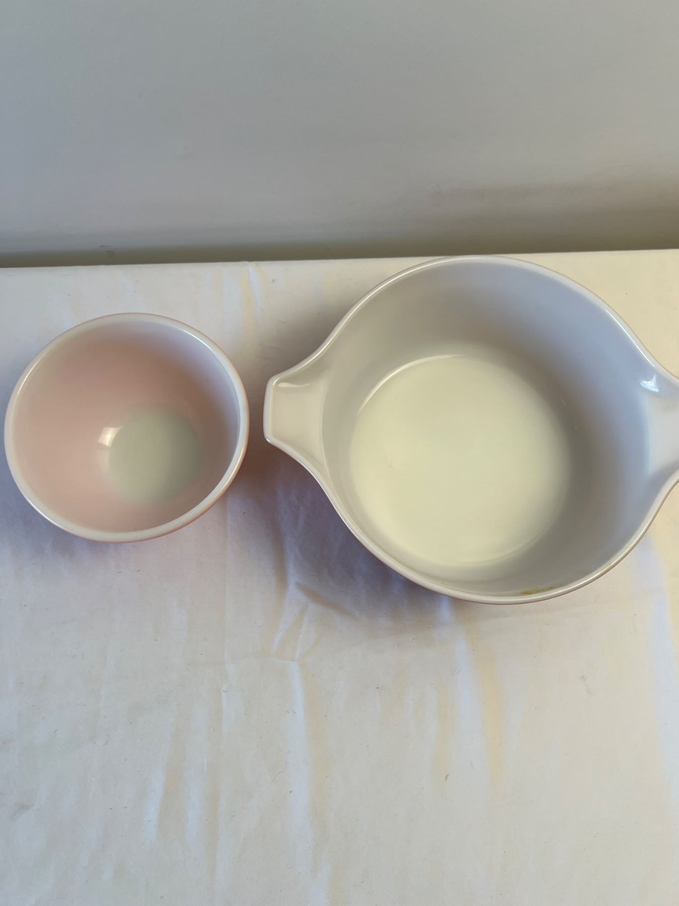 Large dish is patterned in the "Autumn Harvest" style used between 1979-1986. Measures 9" in diameter. Stain on inner rim of large dish.