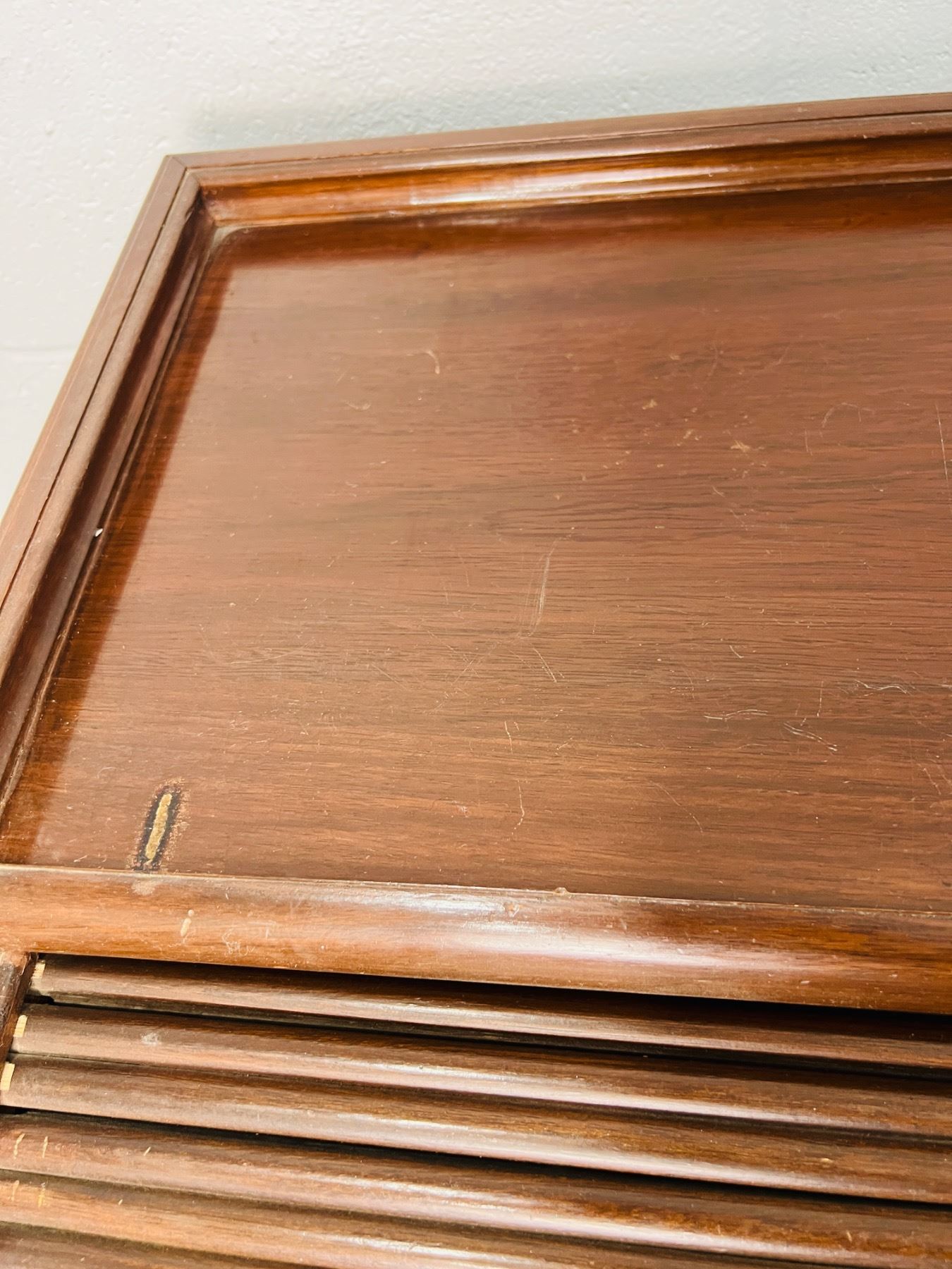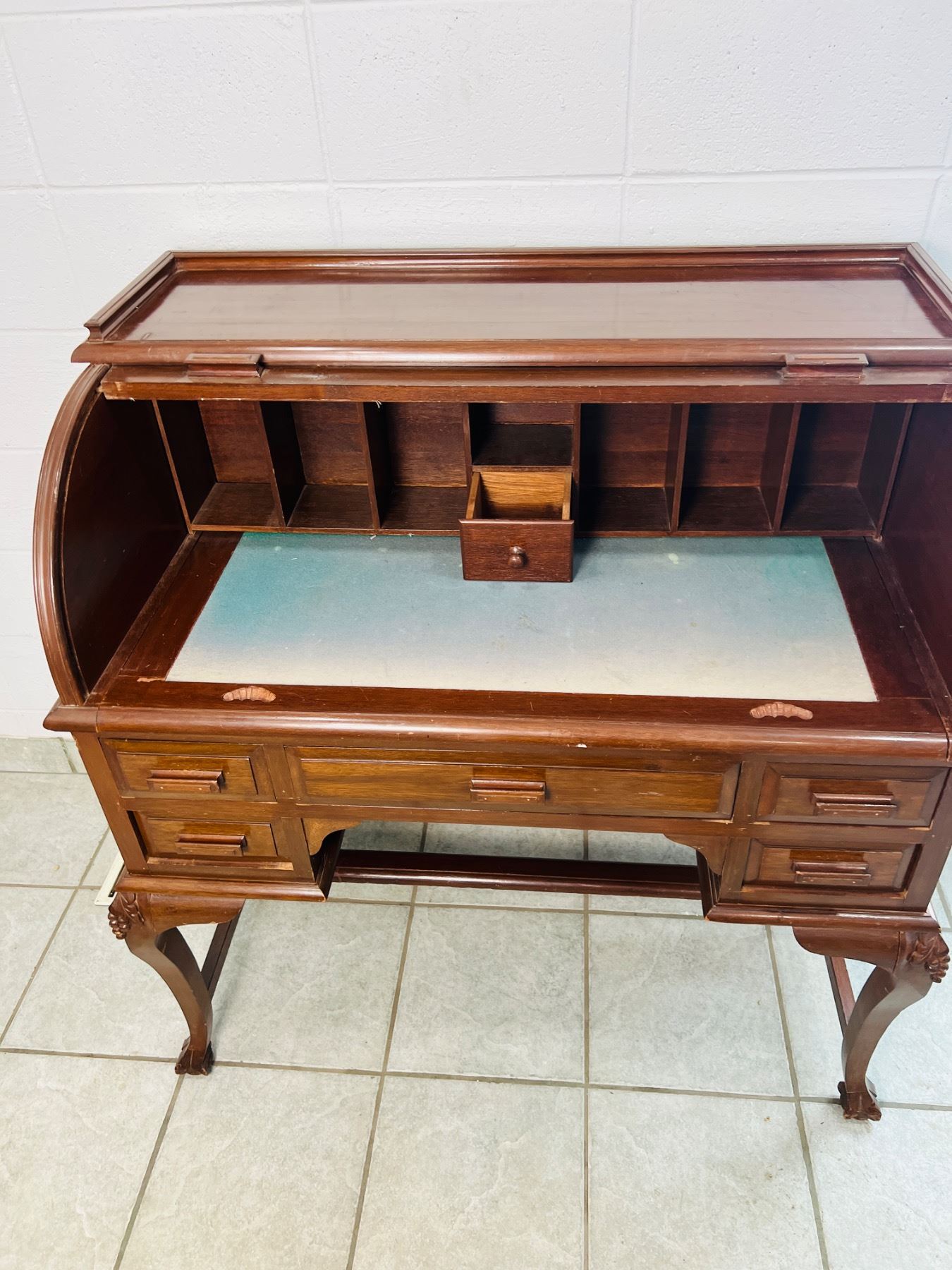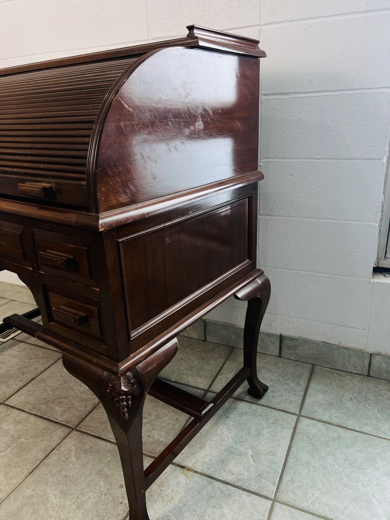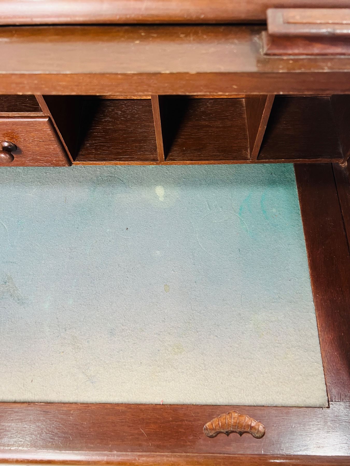 Has scuff marks and scratches, the felt on the desktop has some discolouration, one piece,