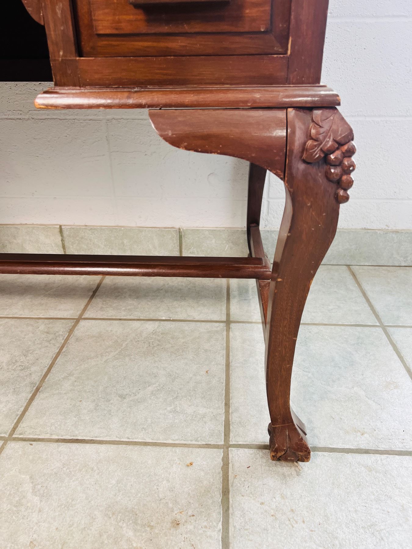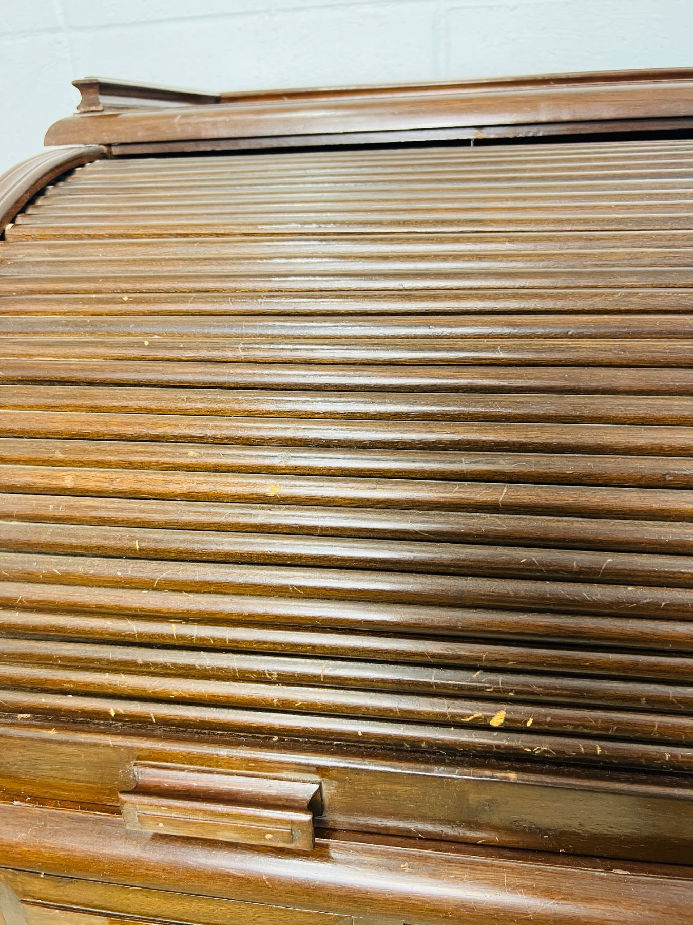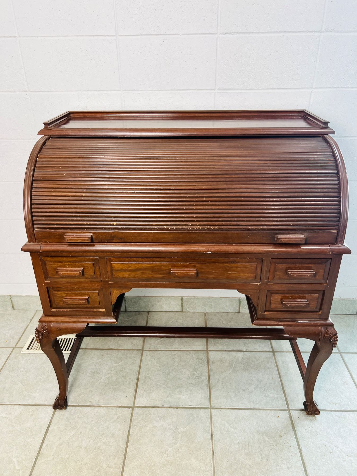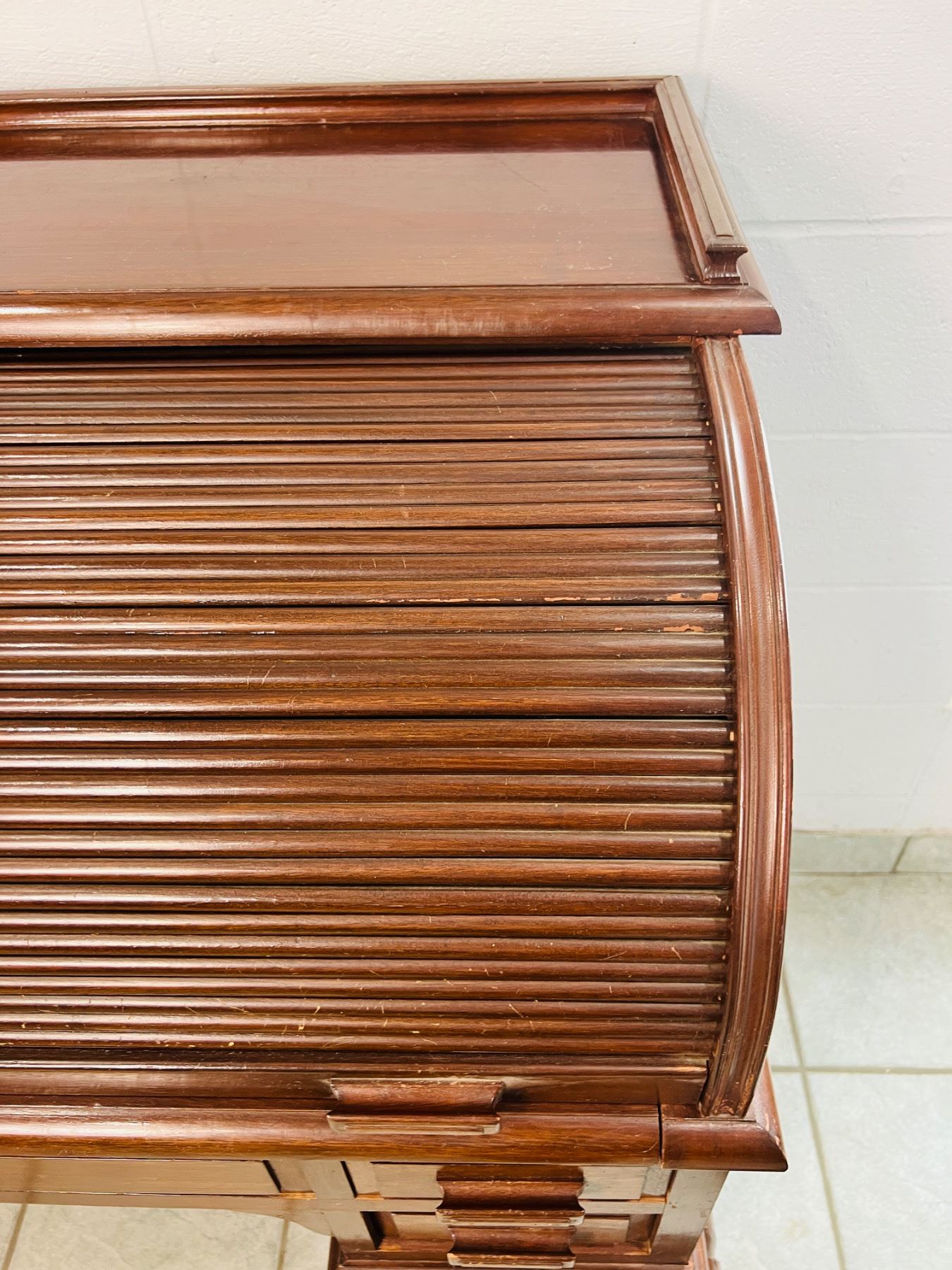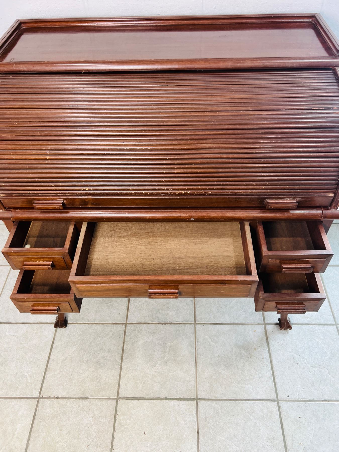 Has scuff marks and scratches, the felt on the desktop has some discolouration, one piece,
