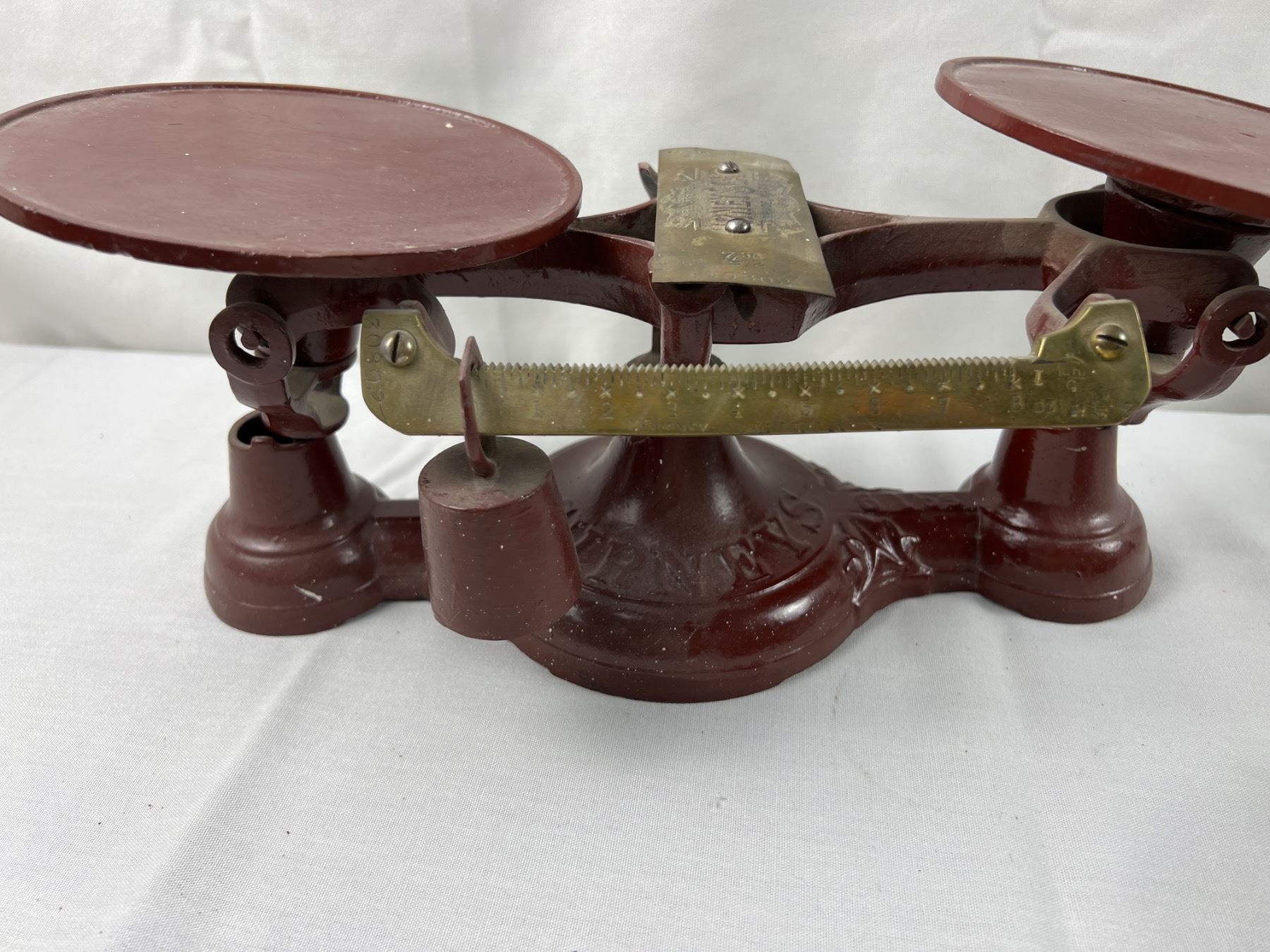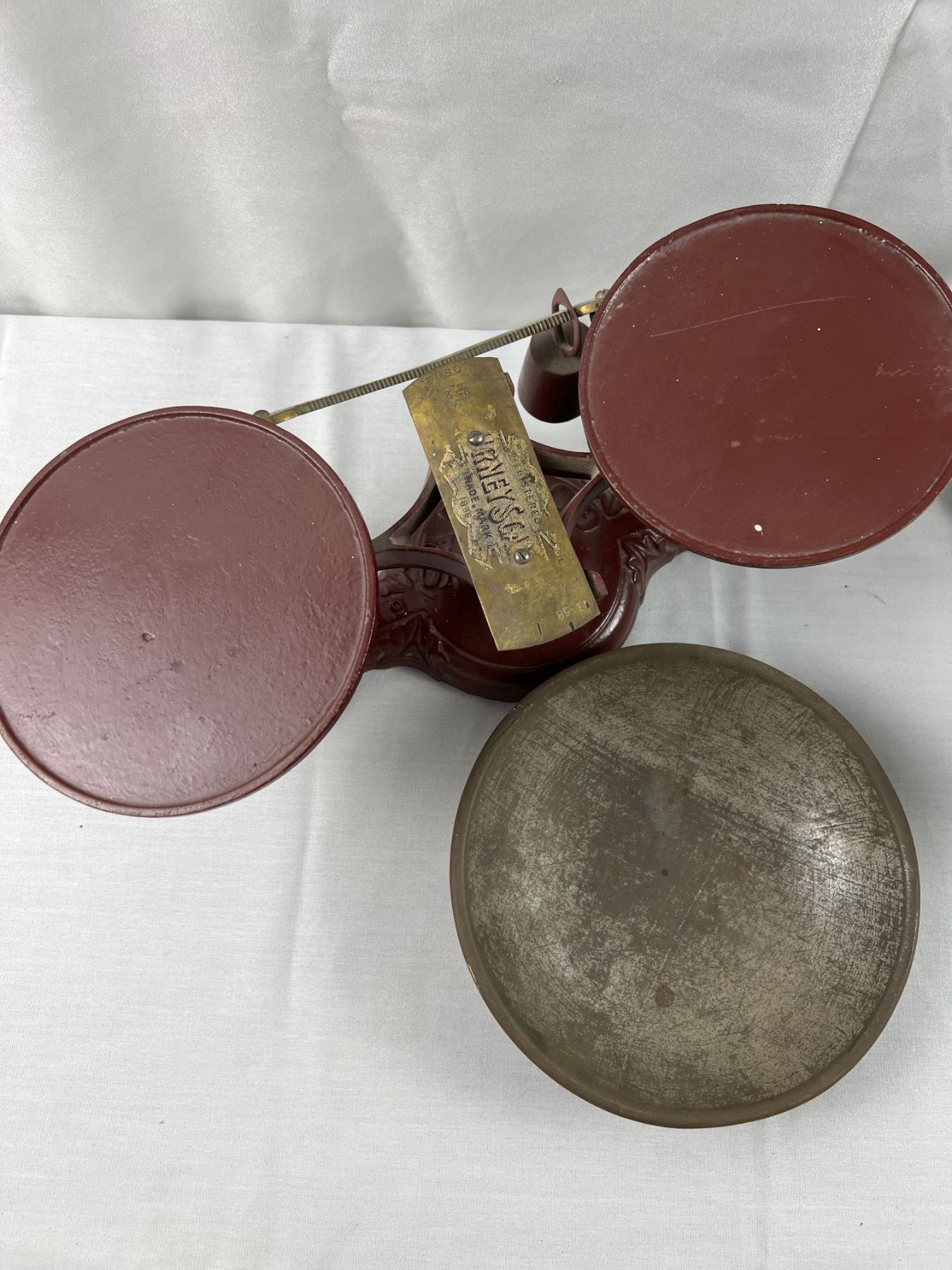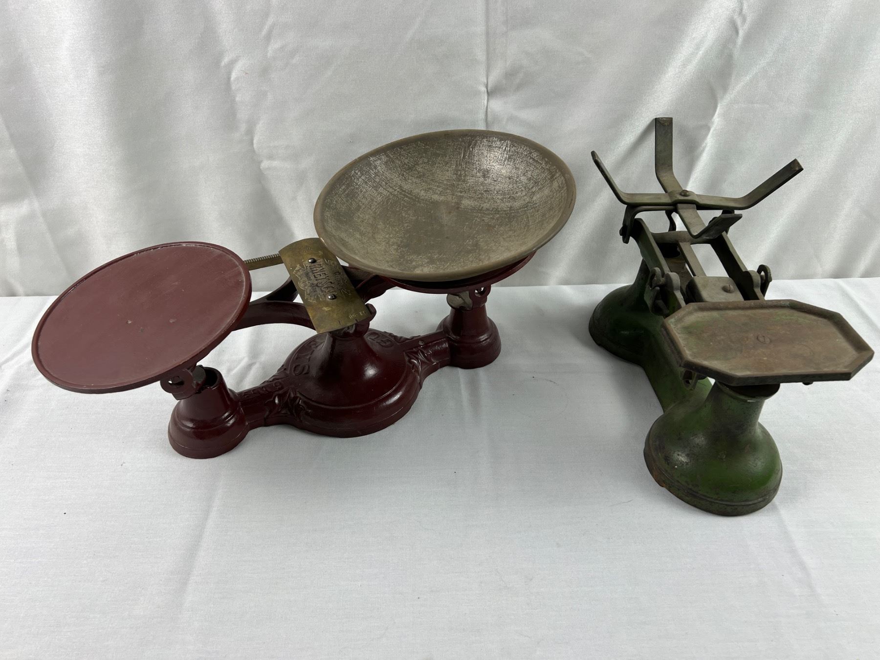 Includes one "Gurney's Scale" No. 30802 (16"L x 6"W x 6"H), the green scale is missing both of the trays, the red scale is missing one tray,