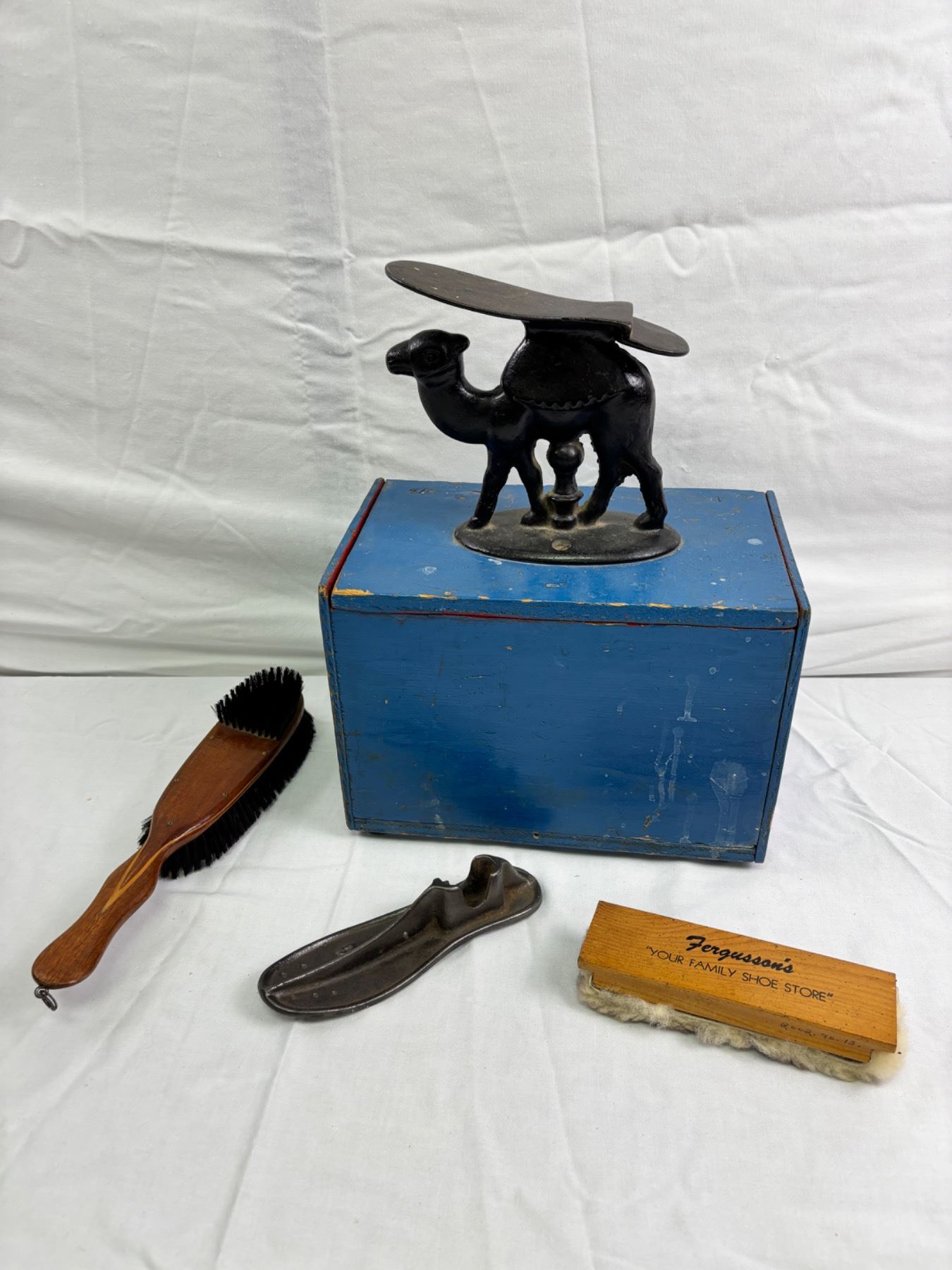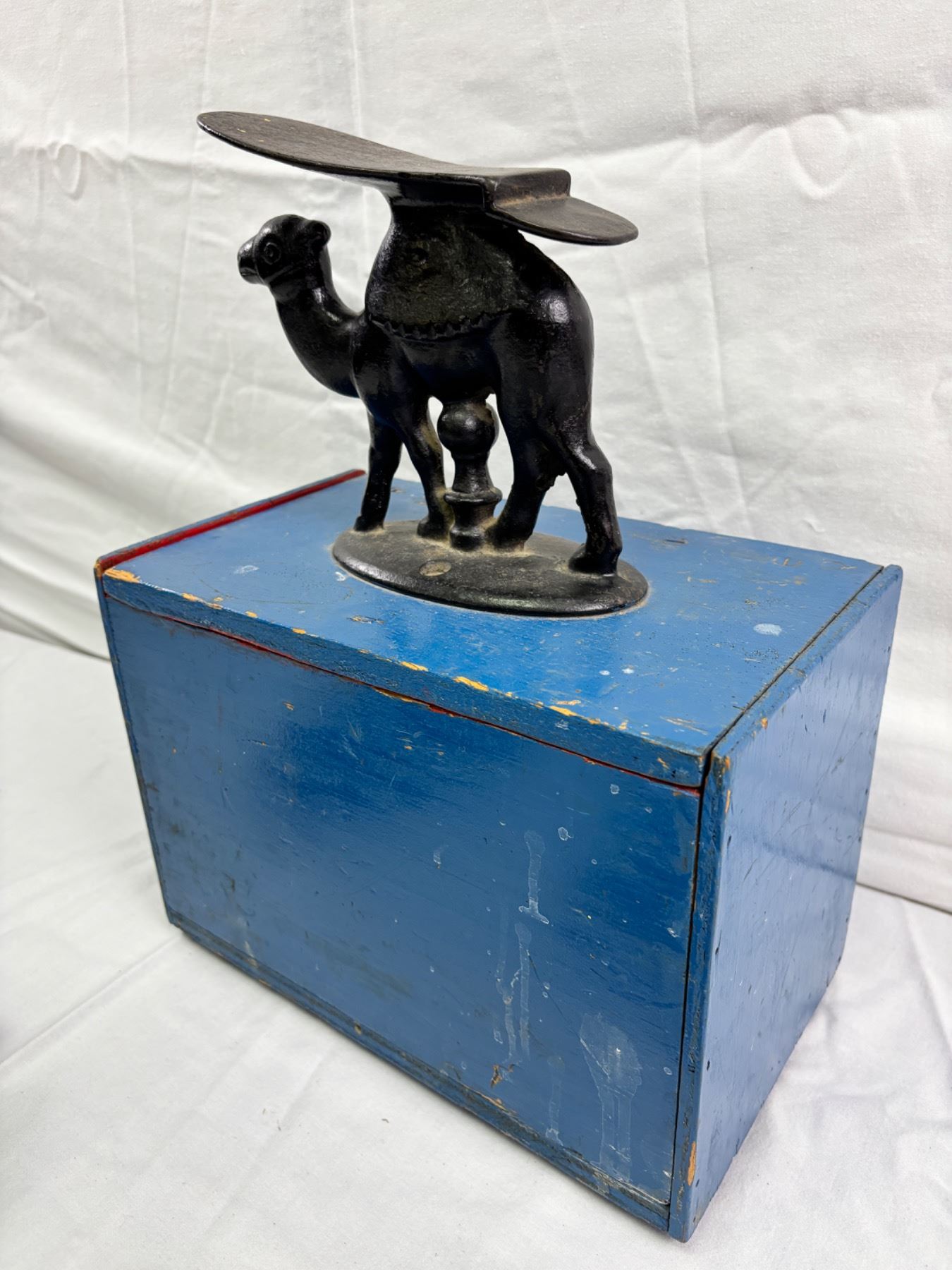 Wooden box with cast iron camel is 11.5"L x 7"W x 15"H
