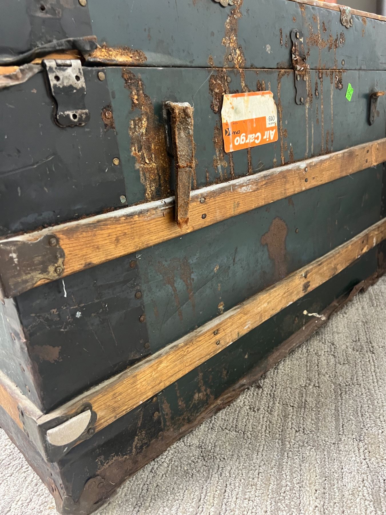 Measures 32" tall by 36" by 20". Heavy wear to exterior, hinge is not attached