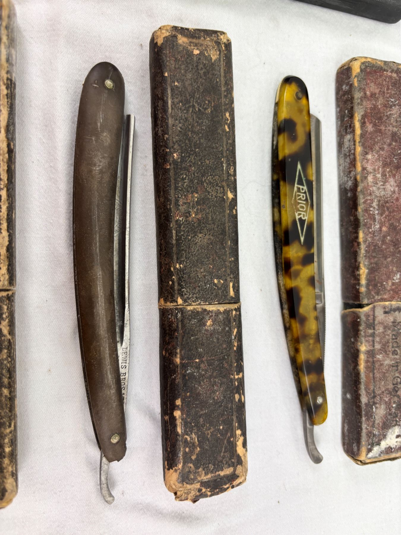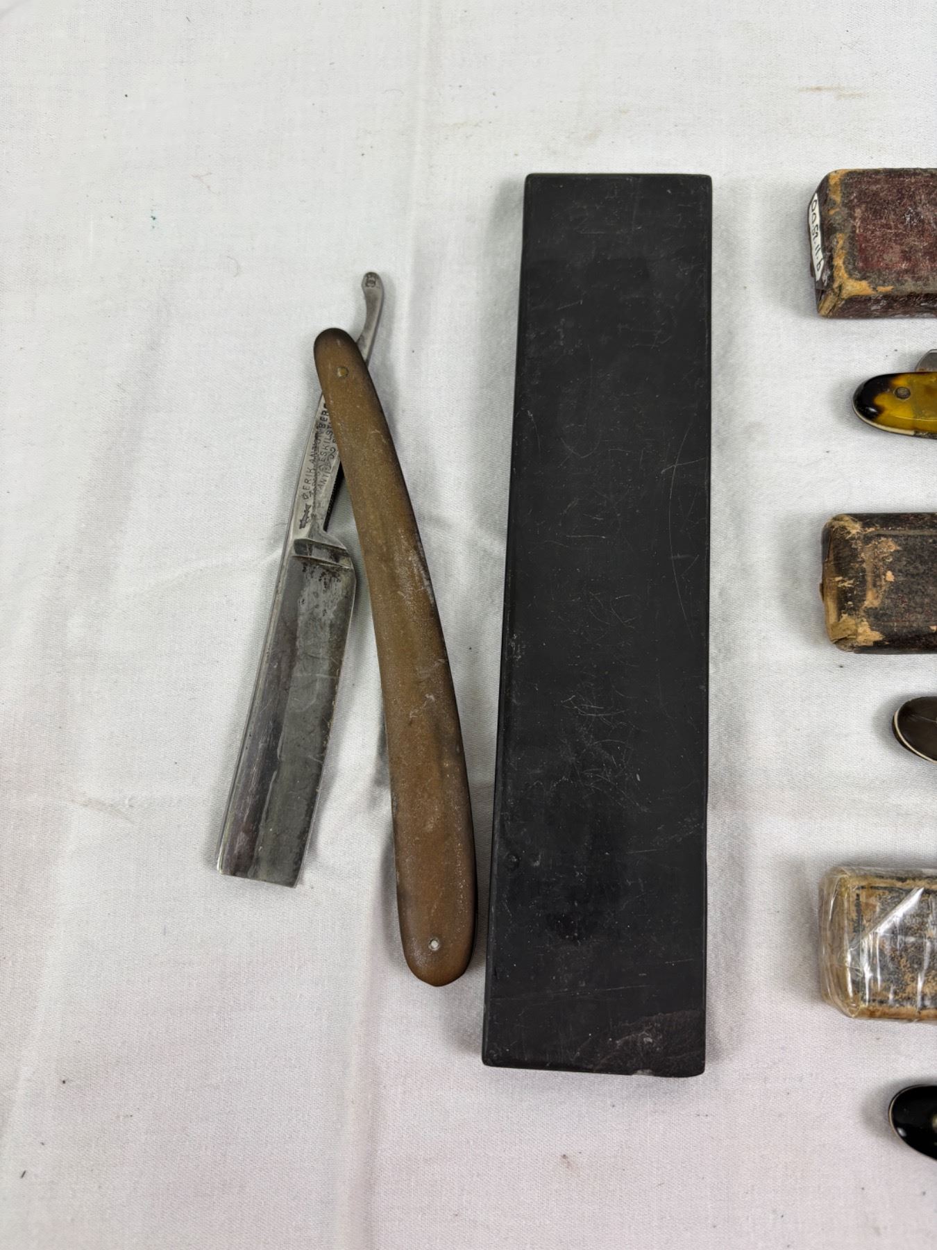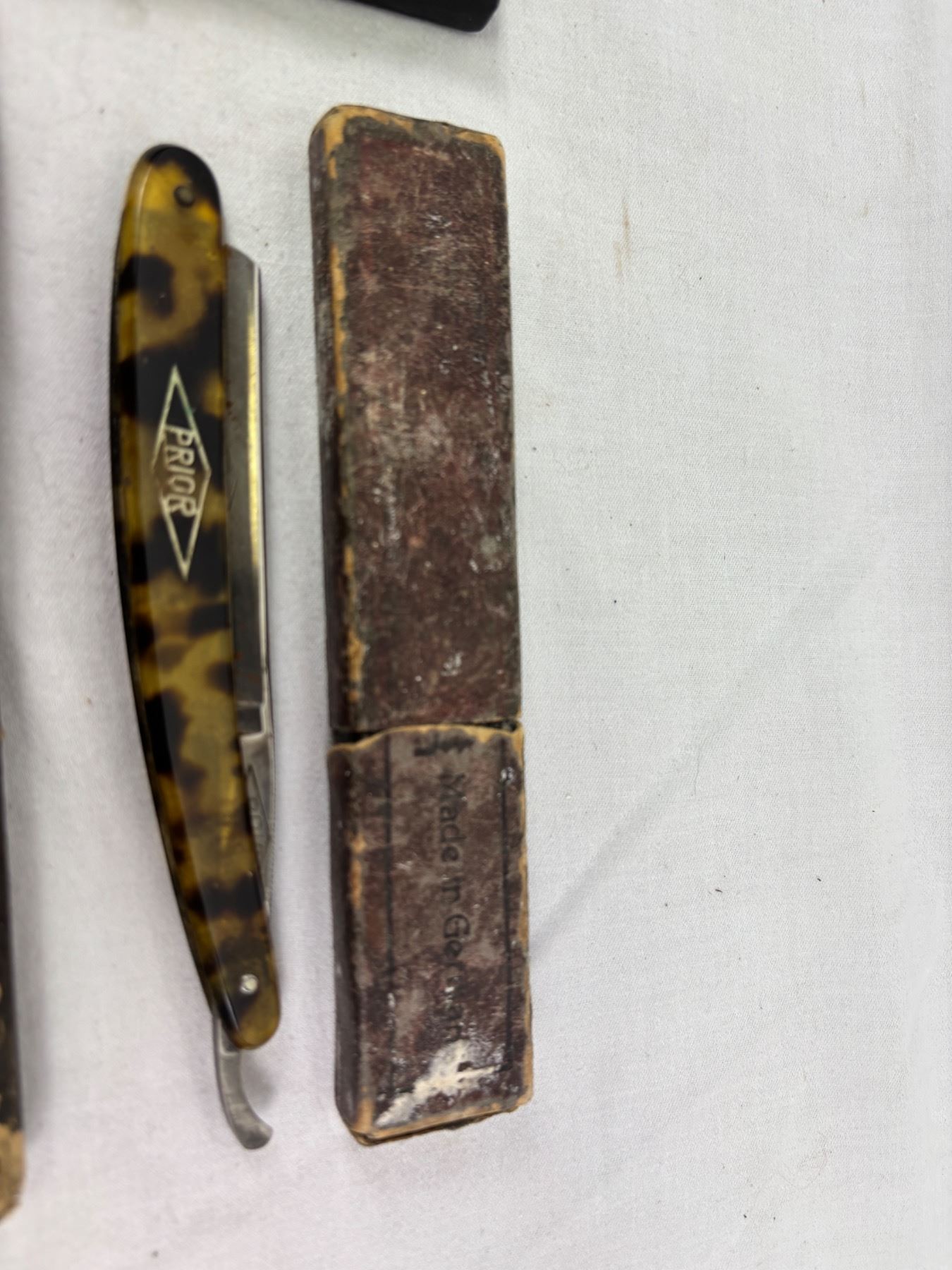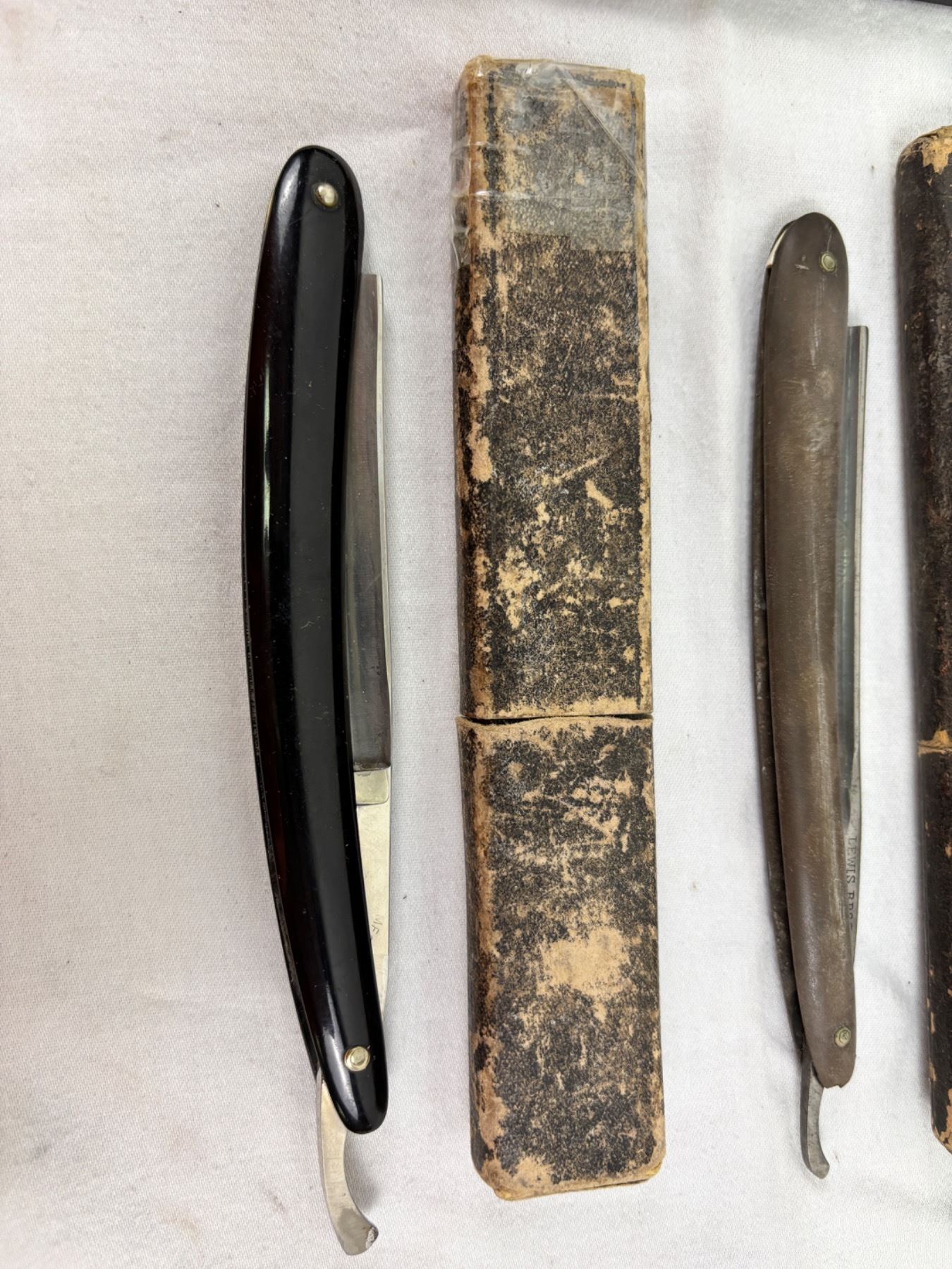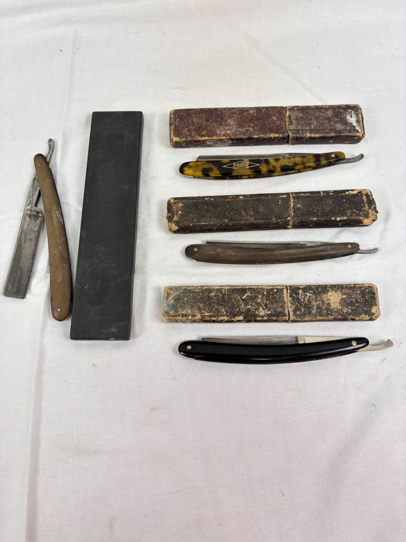 Includes 4 razors, 3 have the original boxes (damage and wear), 1 sharpening stone