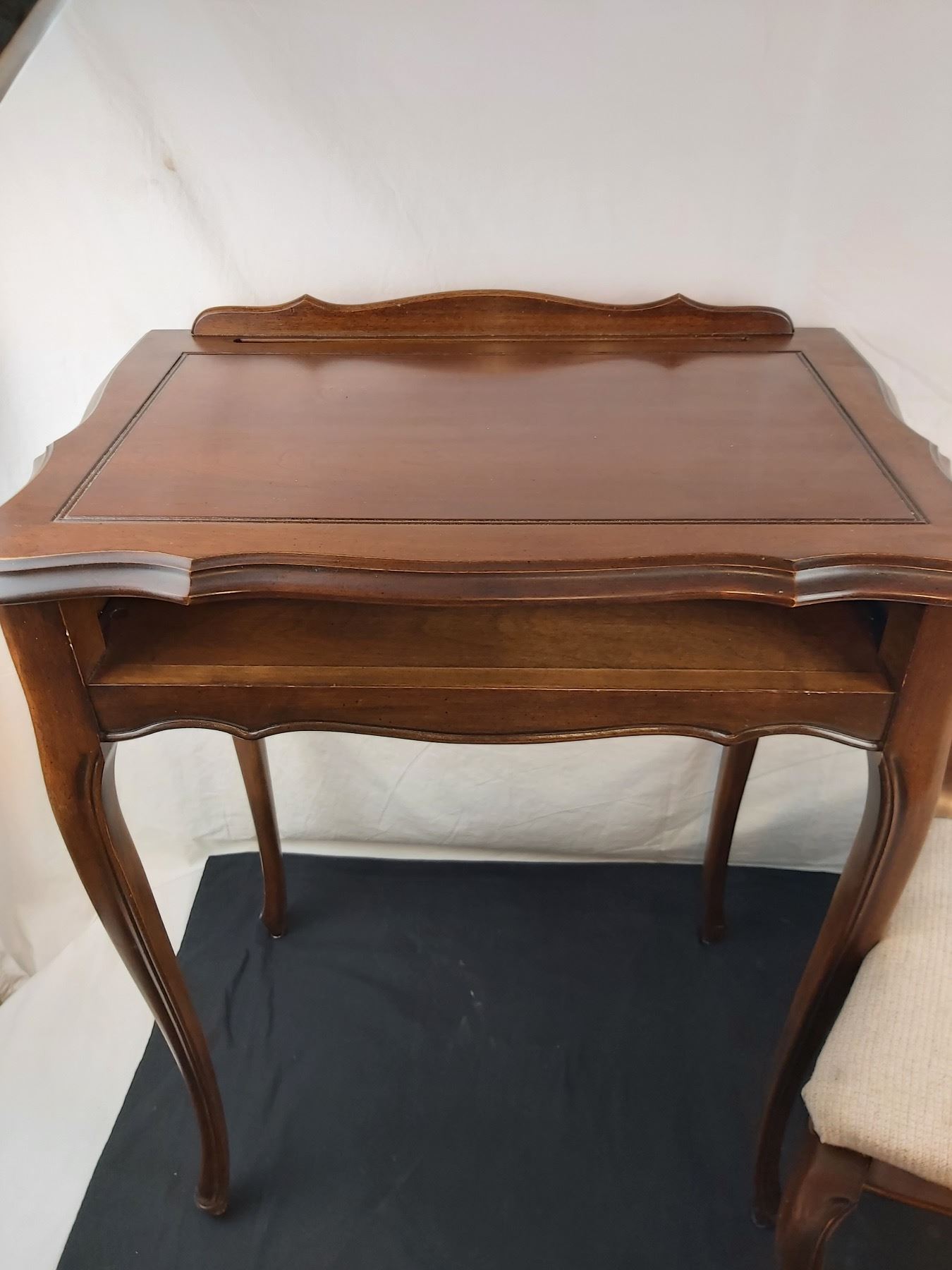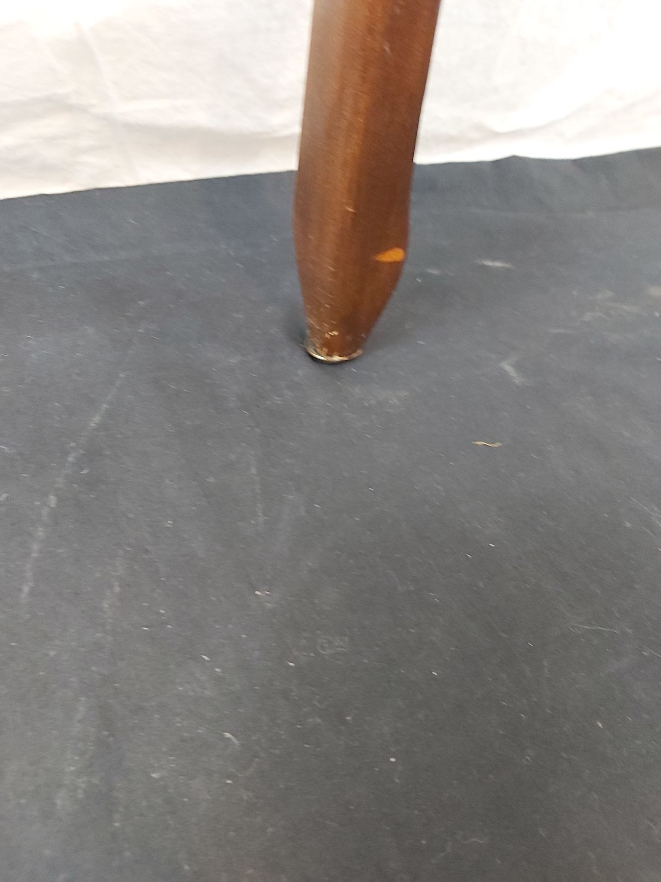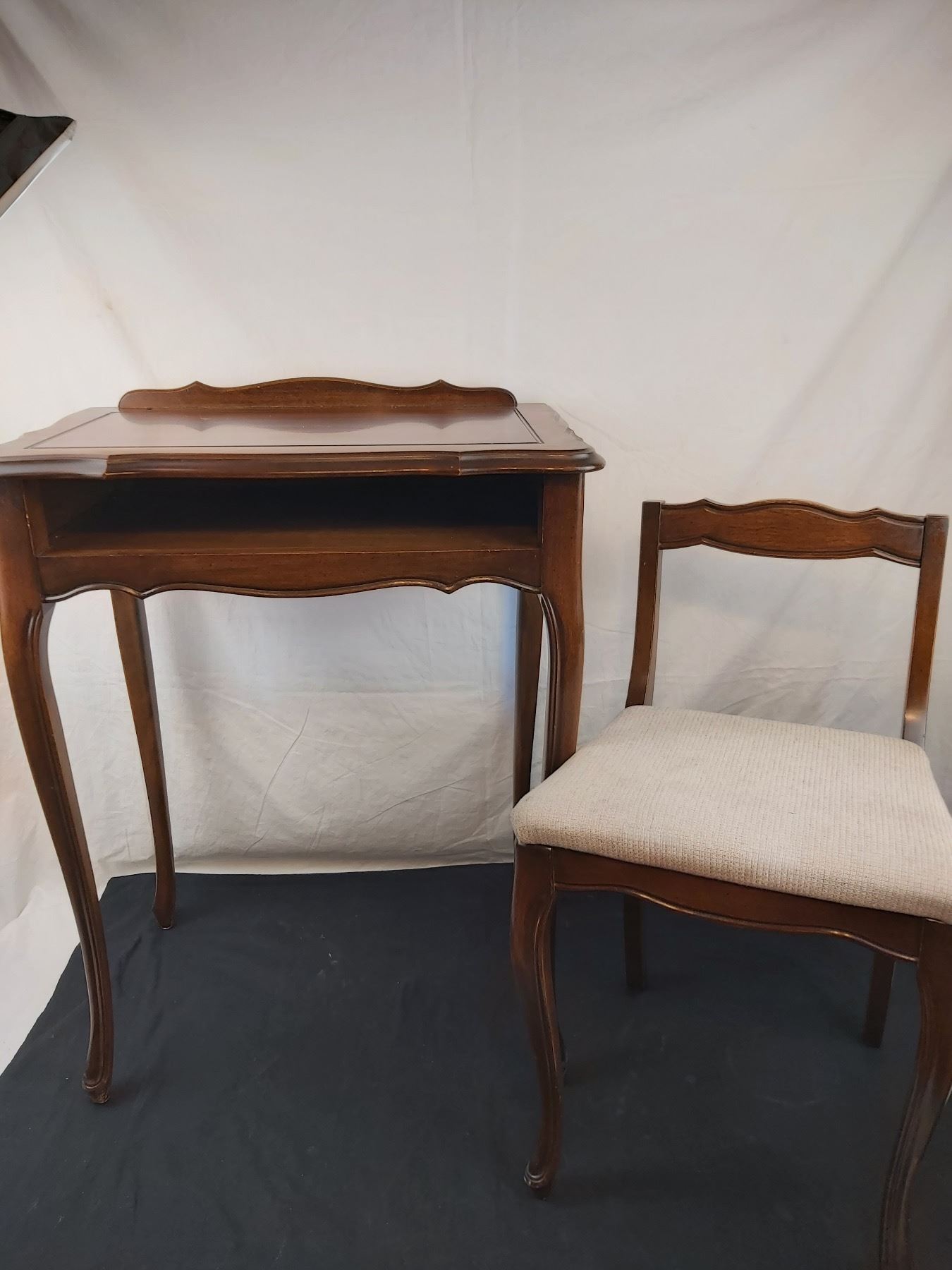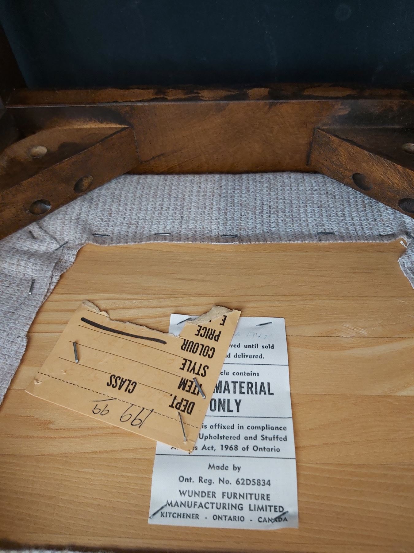 23 3/4"L x 15 3/4"W x 19.5"H, has some nicks and scratches on the legs, chair has some stains, Made by the Wunder Furniture Co.