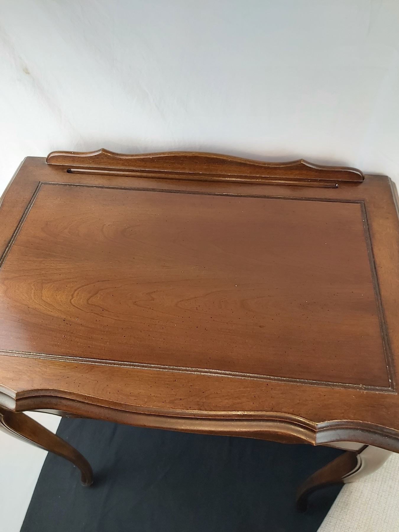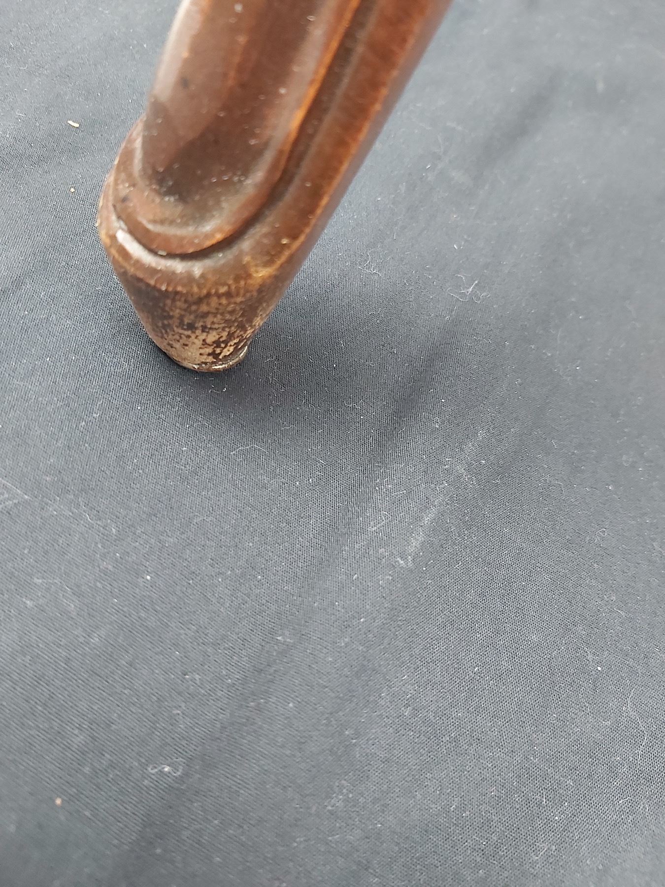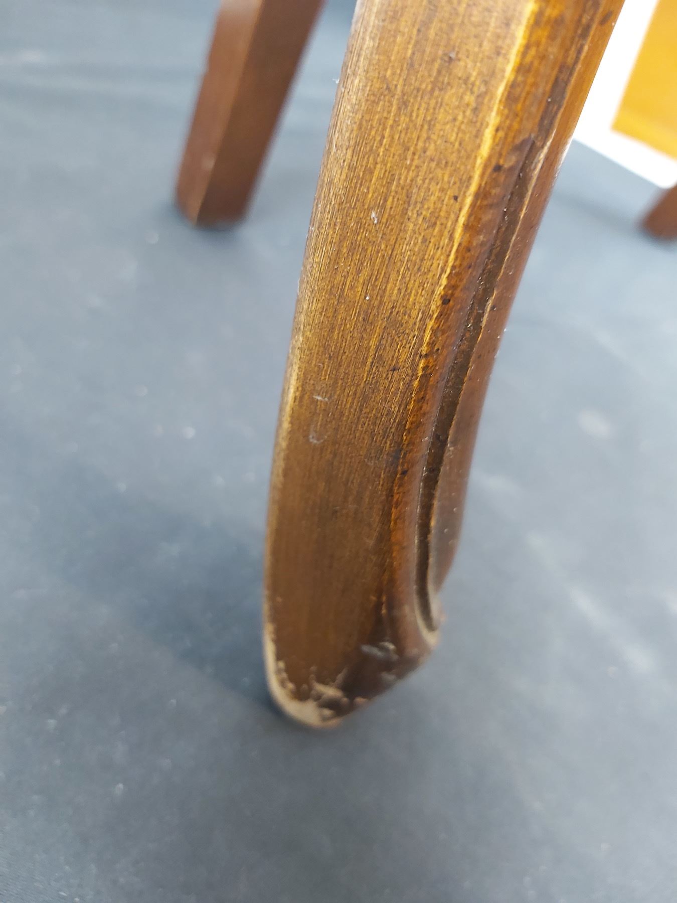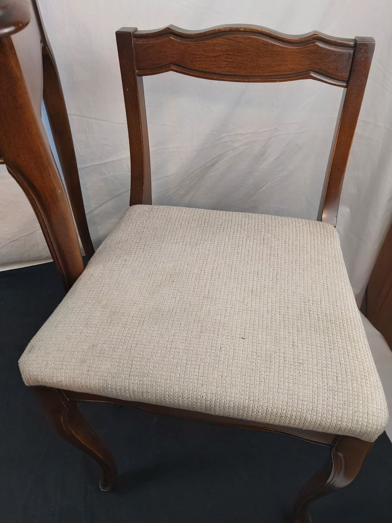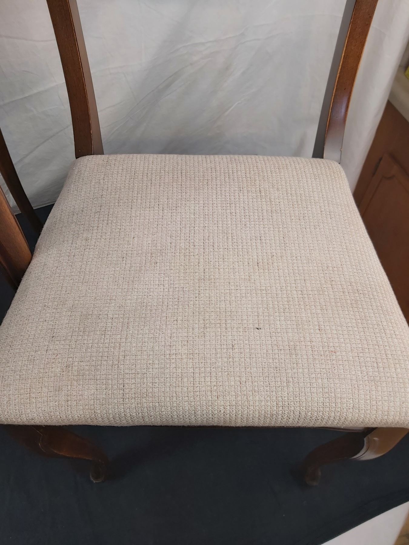 23 3/4"L x 15 3/4"W x 19.5"H, has some nicks and scratches on the legs, chair has some stains, Made by the Wunder Furniture Co.