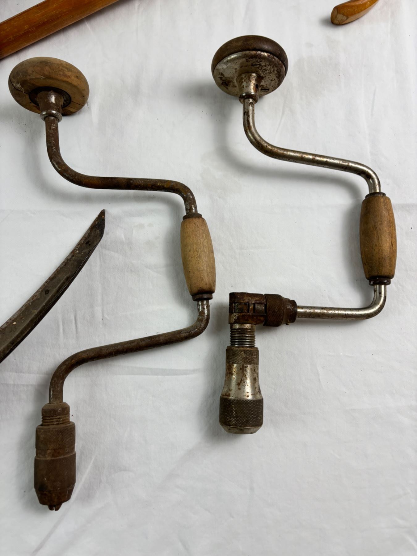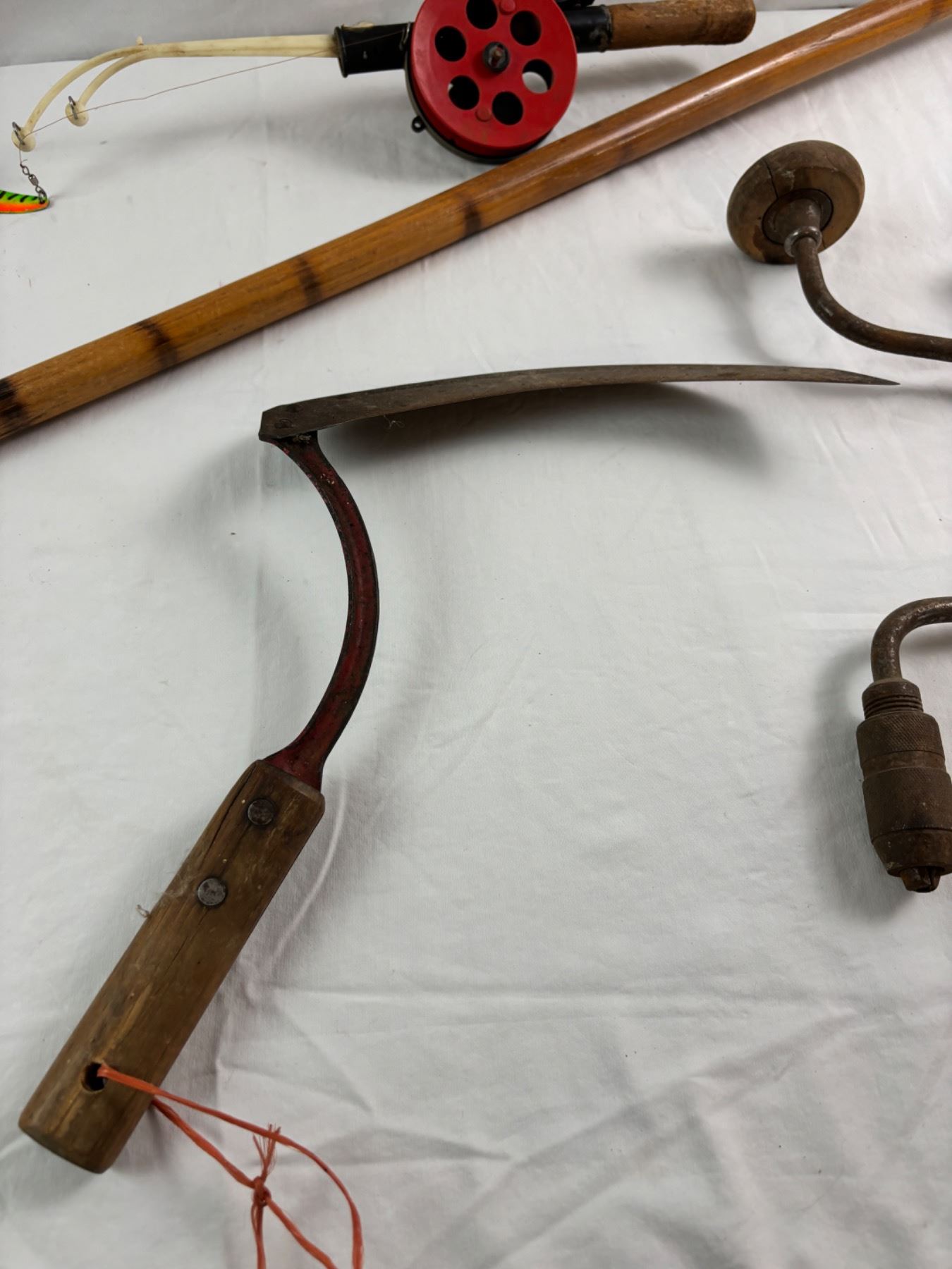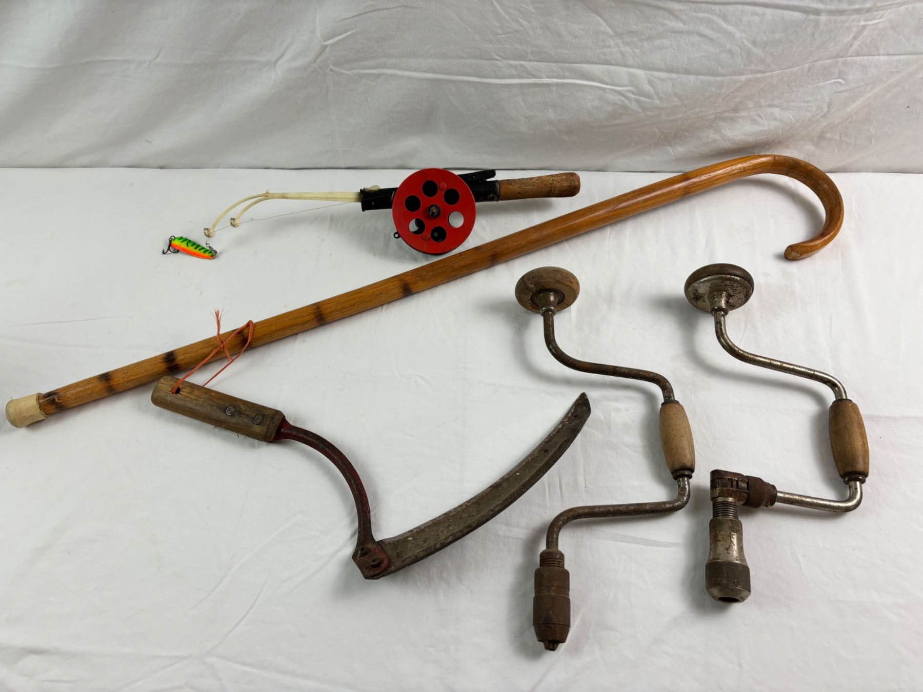 Includes 2 hand drills, fishing rod, wooden cane (38"L)