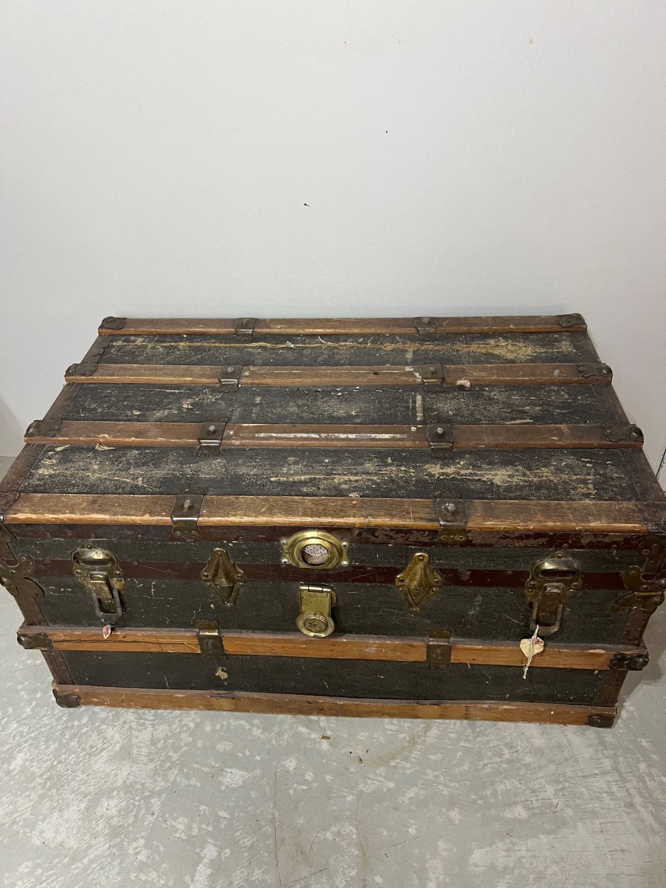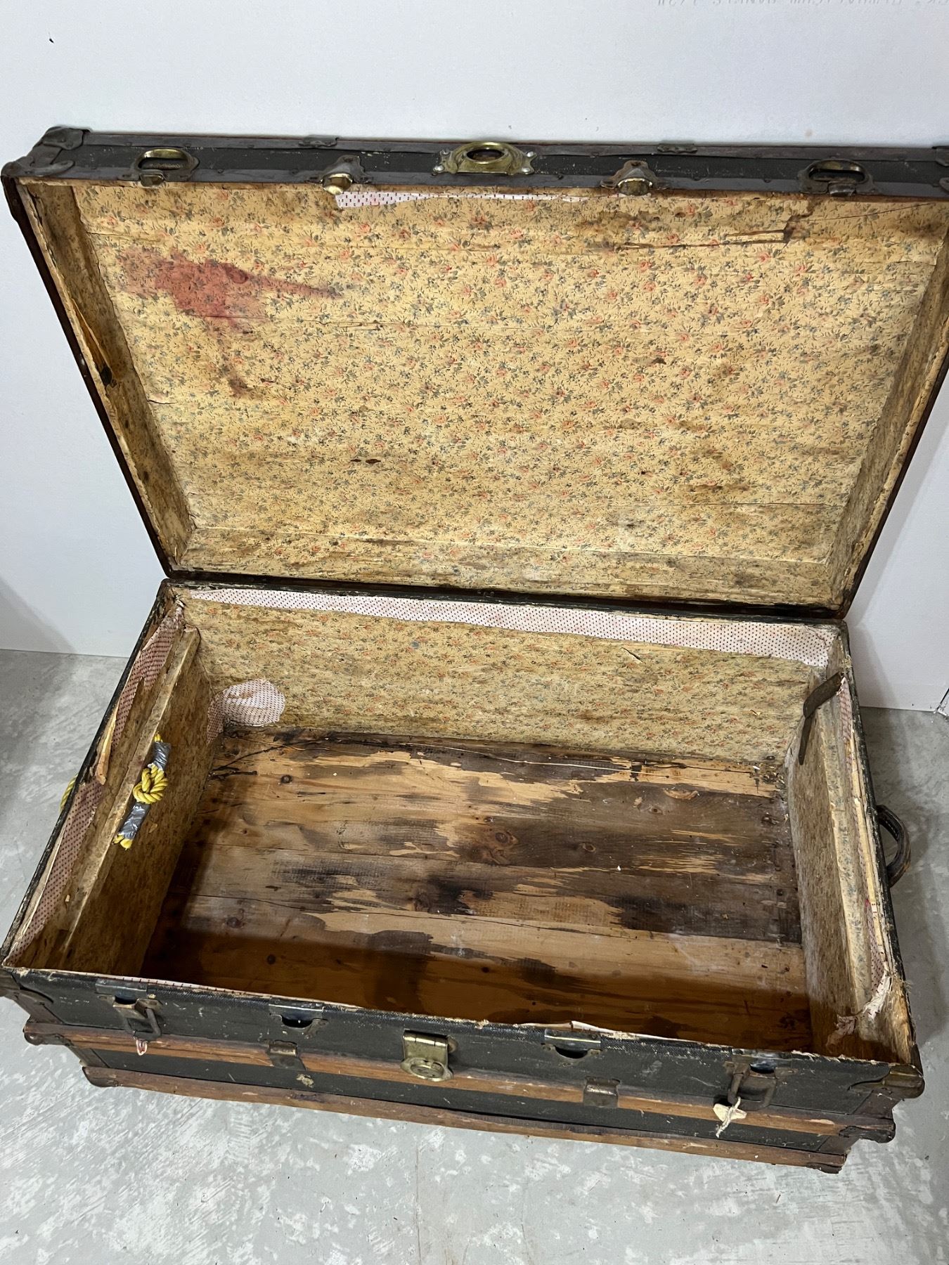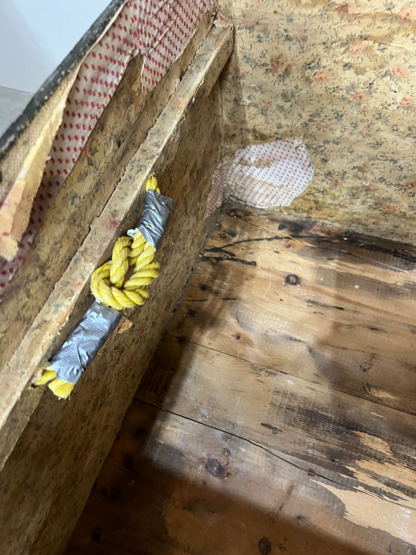 One of the handles is broken and replaced with rope. Wear and tear to wood and interior paper. 37" by 22" and height of 18"