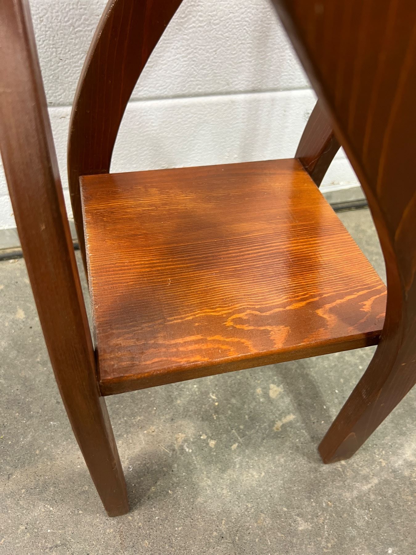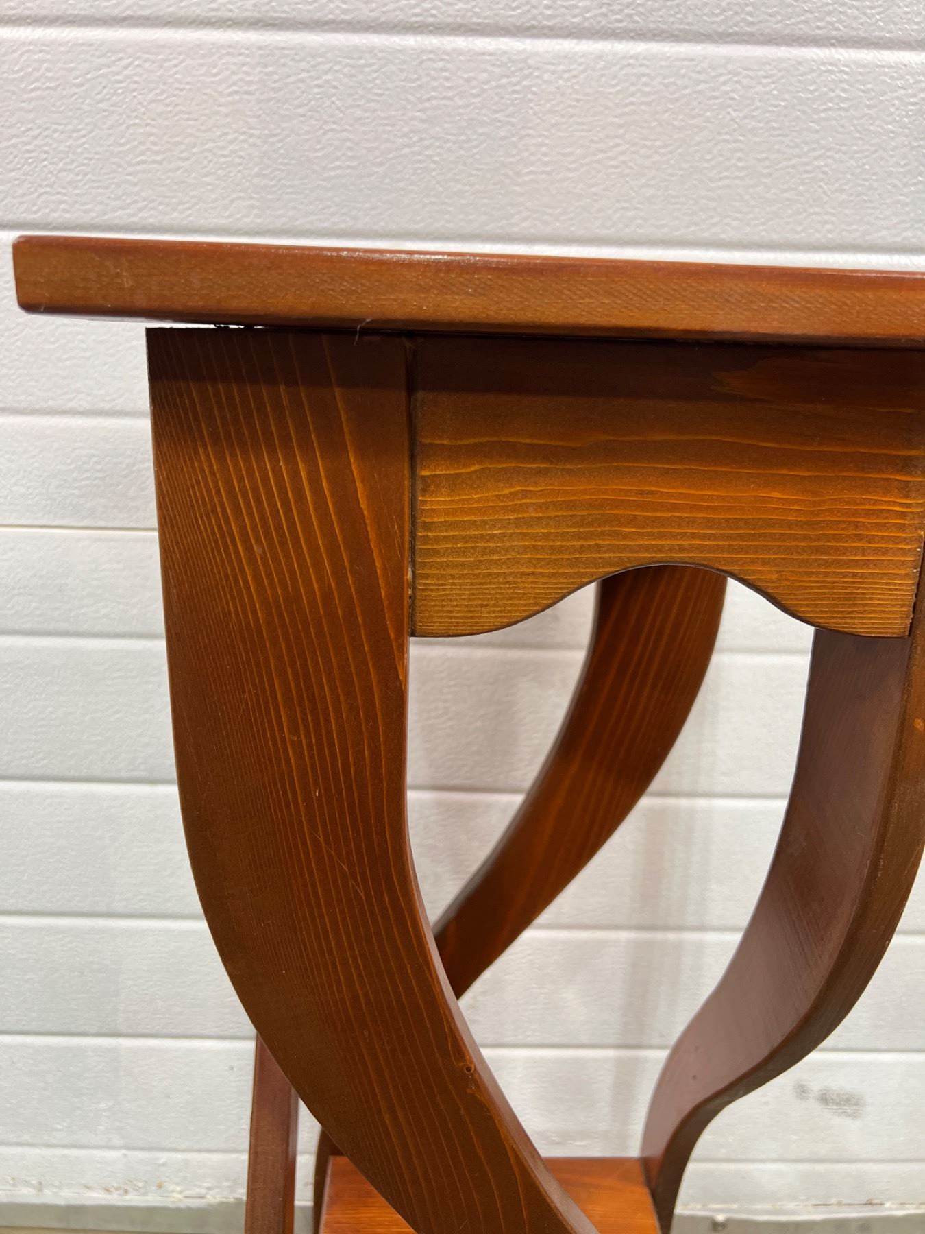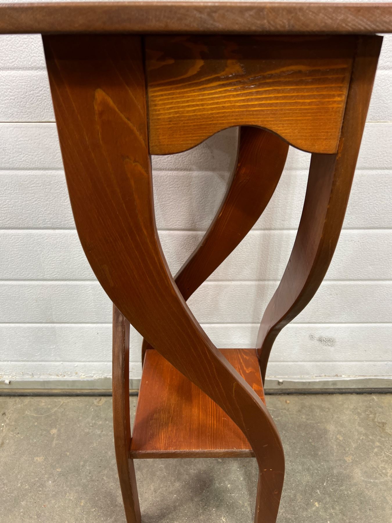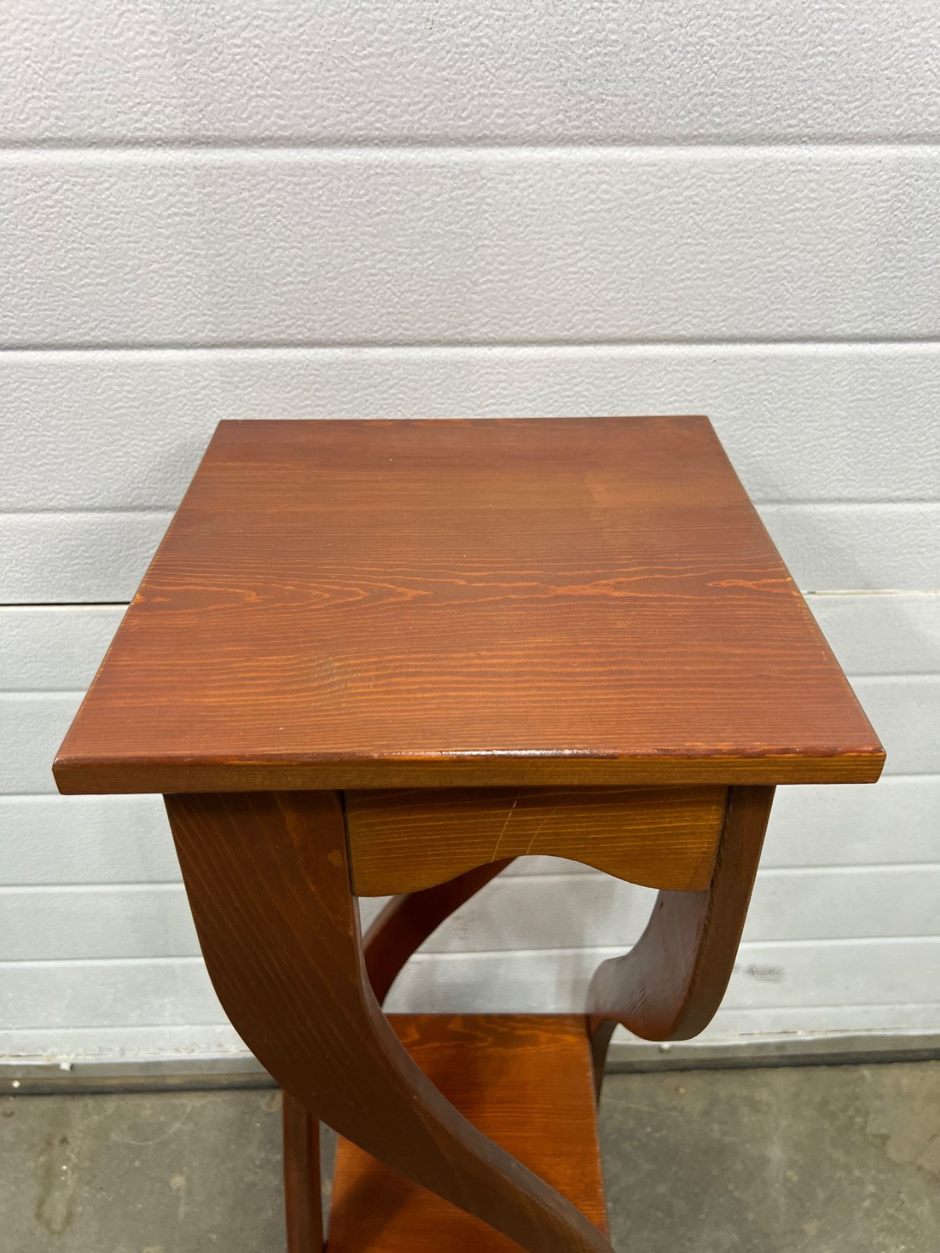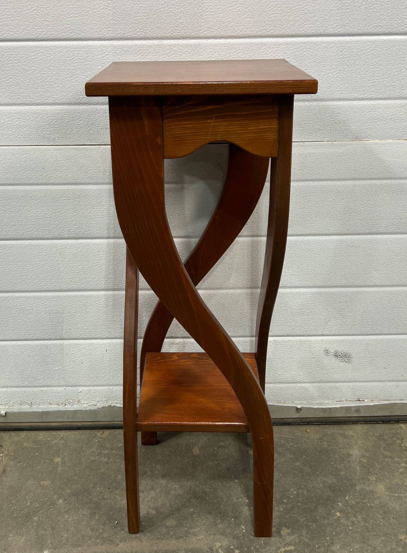 Measures 31"H and large table top is 12" by 12". Top panel has come slightly off its base but does not wobble. Scratch on side support.