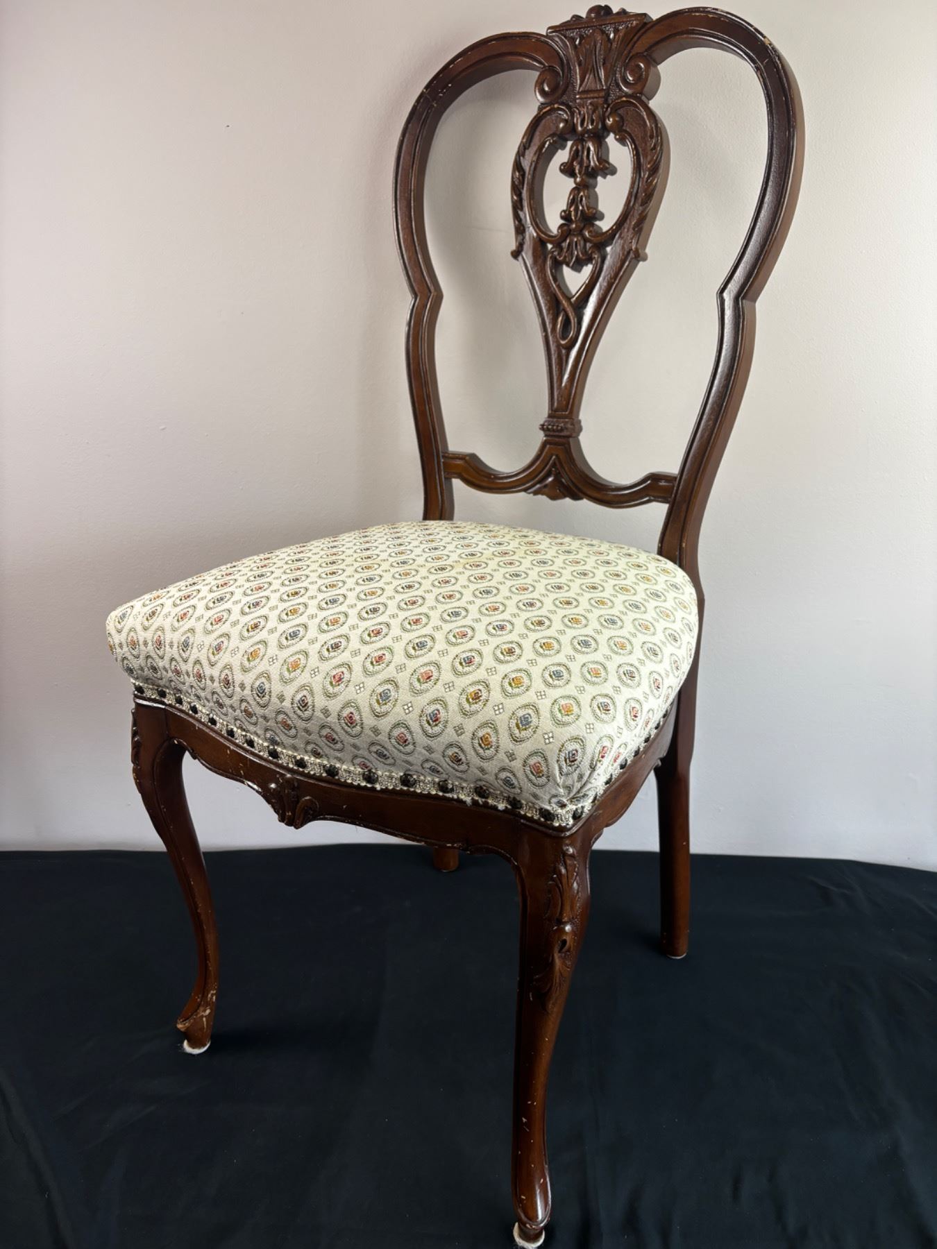 Stain/discolouration to main cushion of seat. Wood has been damaged and worn around chair. Approximately 18" long by 18" wide and 38" tall.