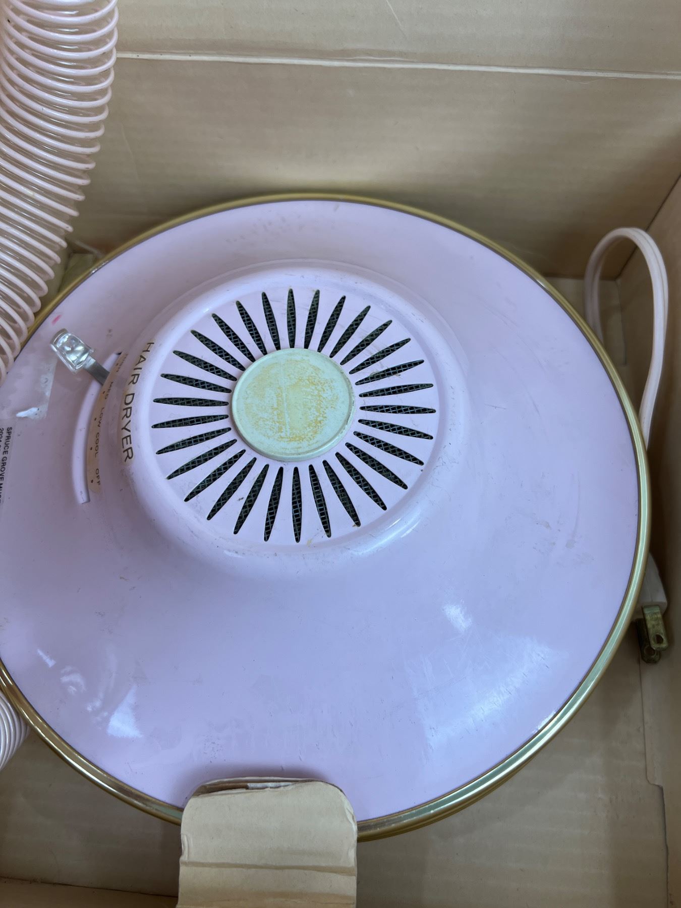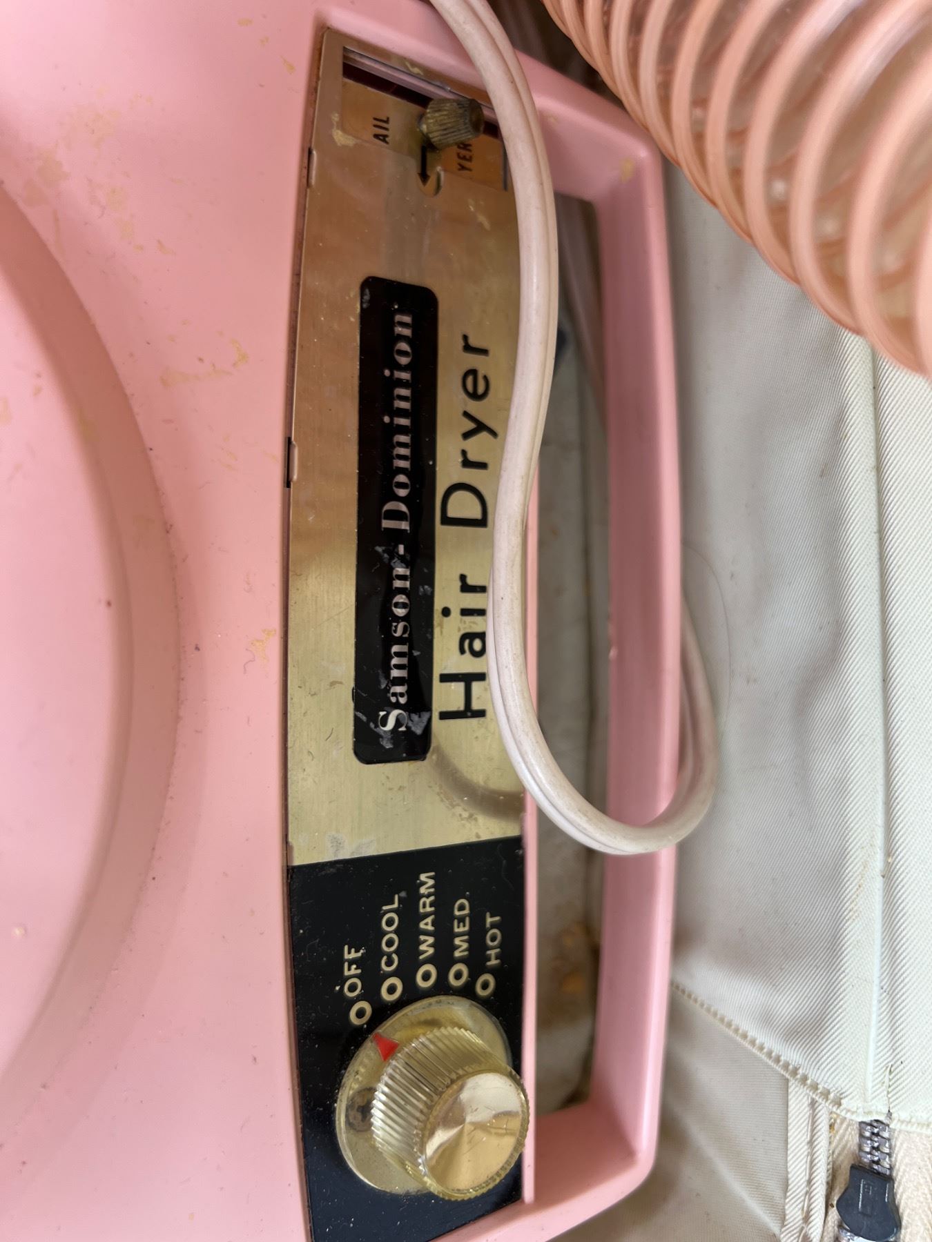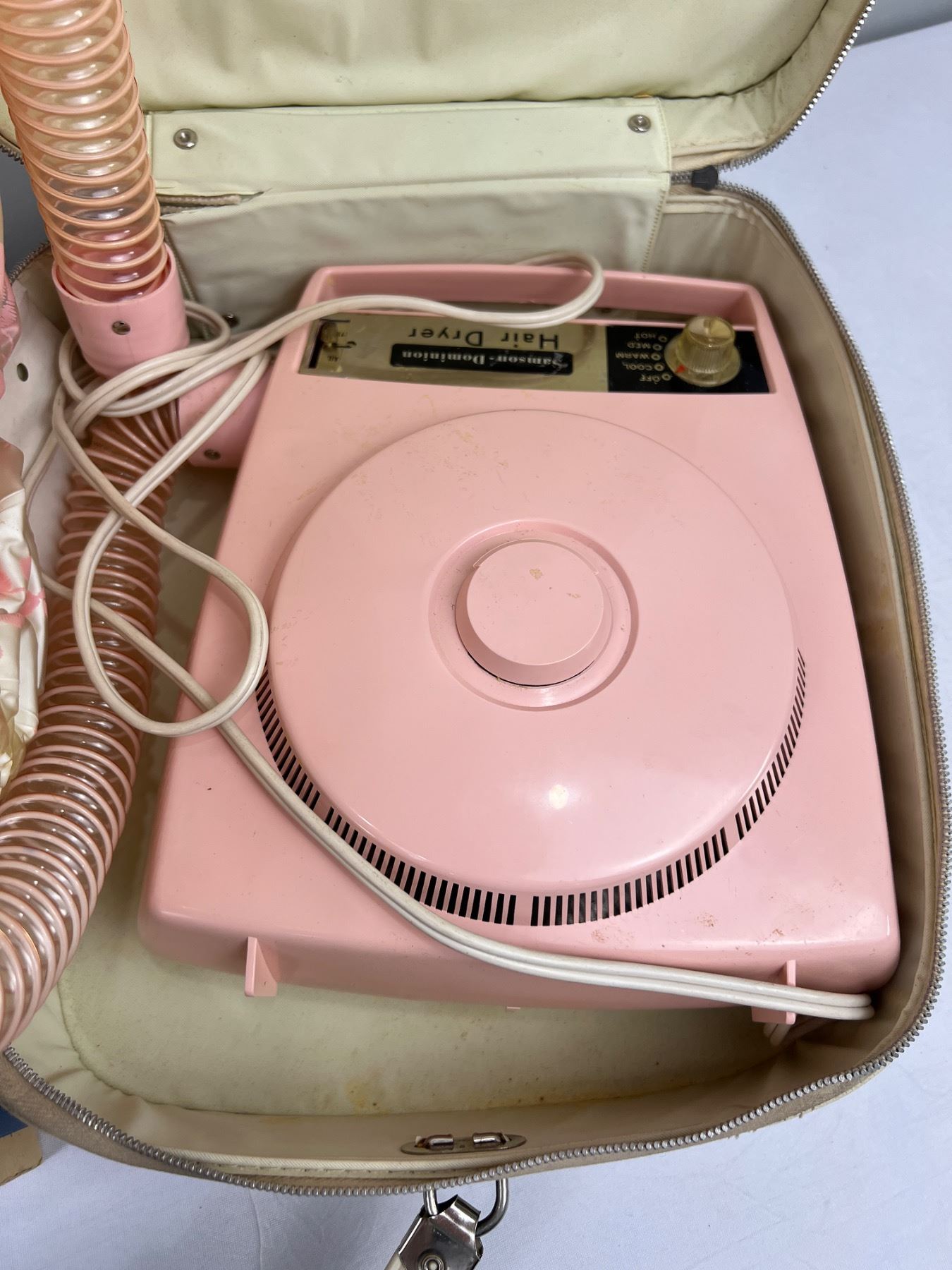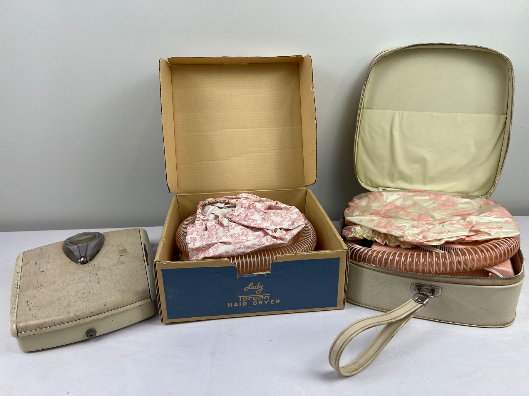 Includes a bathroom scale, Samson-Dominion Hair Dryer and a Lady Toucan Hair Dryer (both power on), the white storage case has a broken zipper