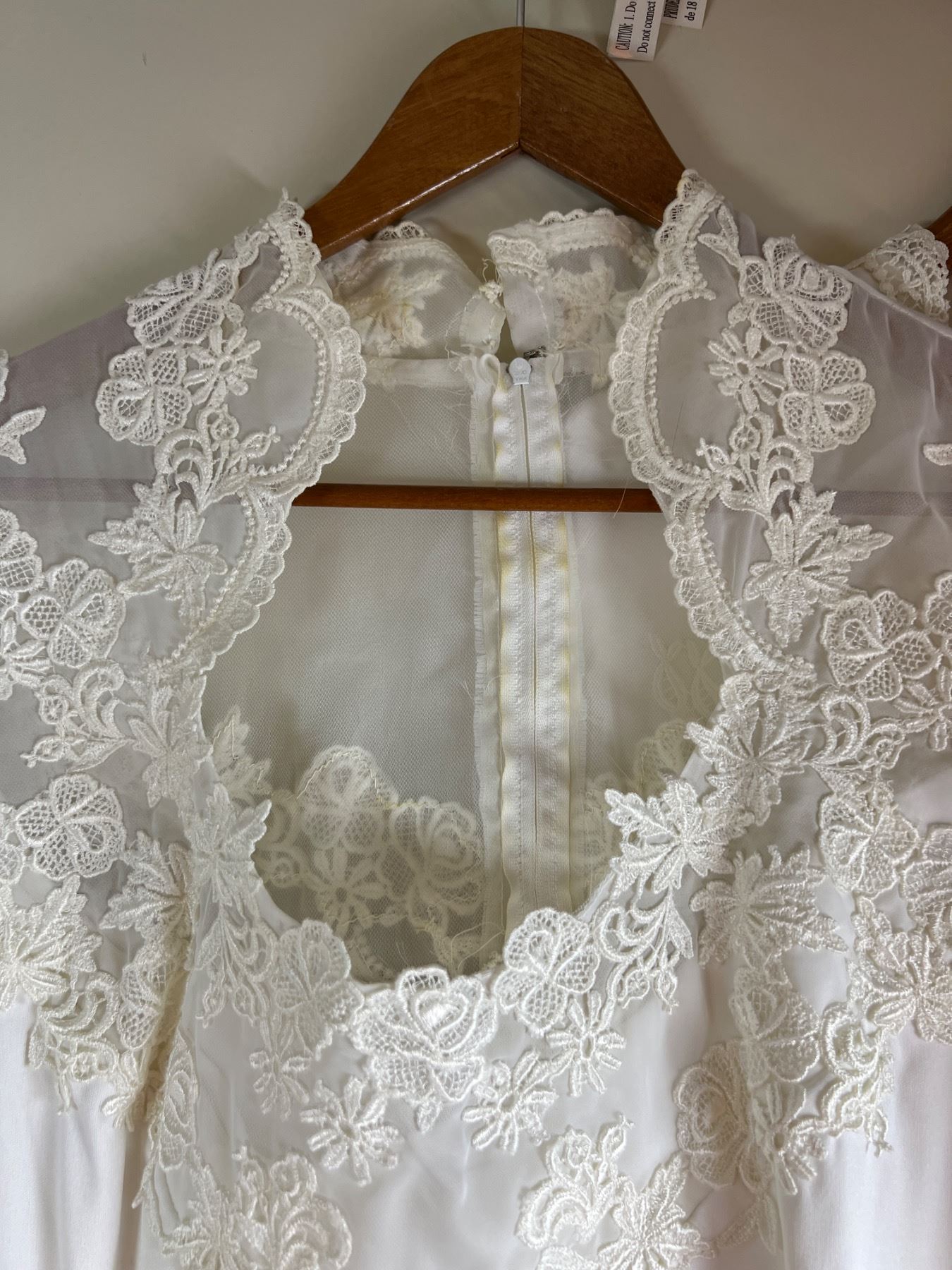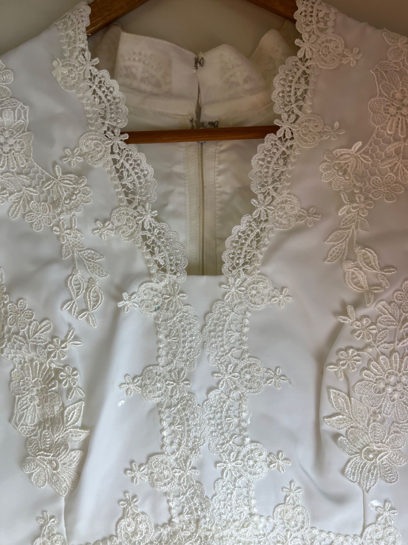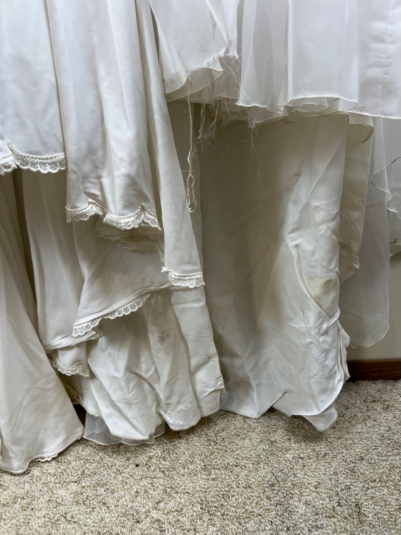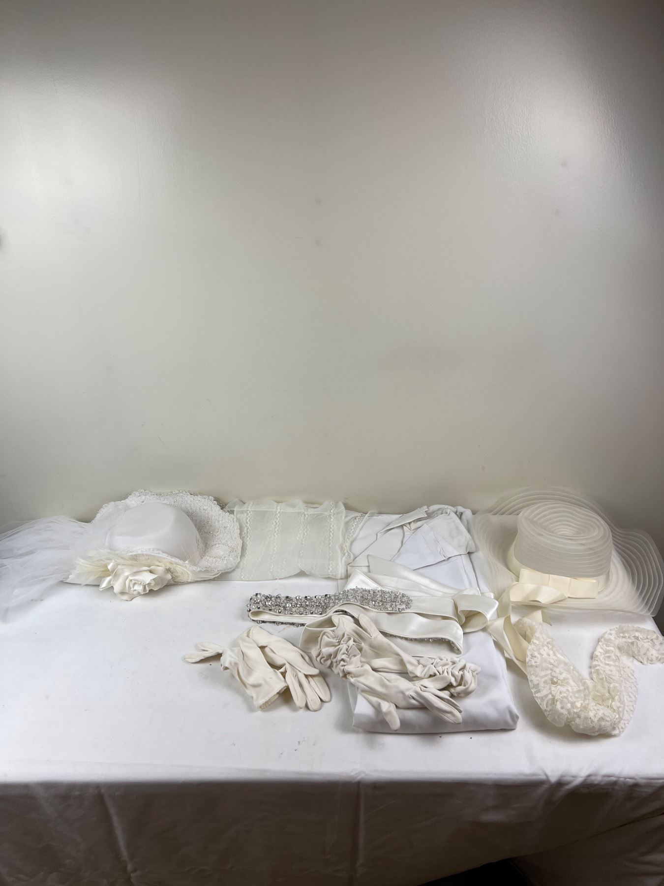 Includes two wedding gowns (approximate size 10) some stains and wear, two white hats, gloves, and more