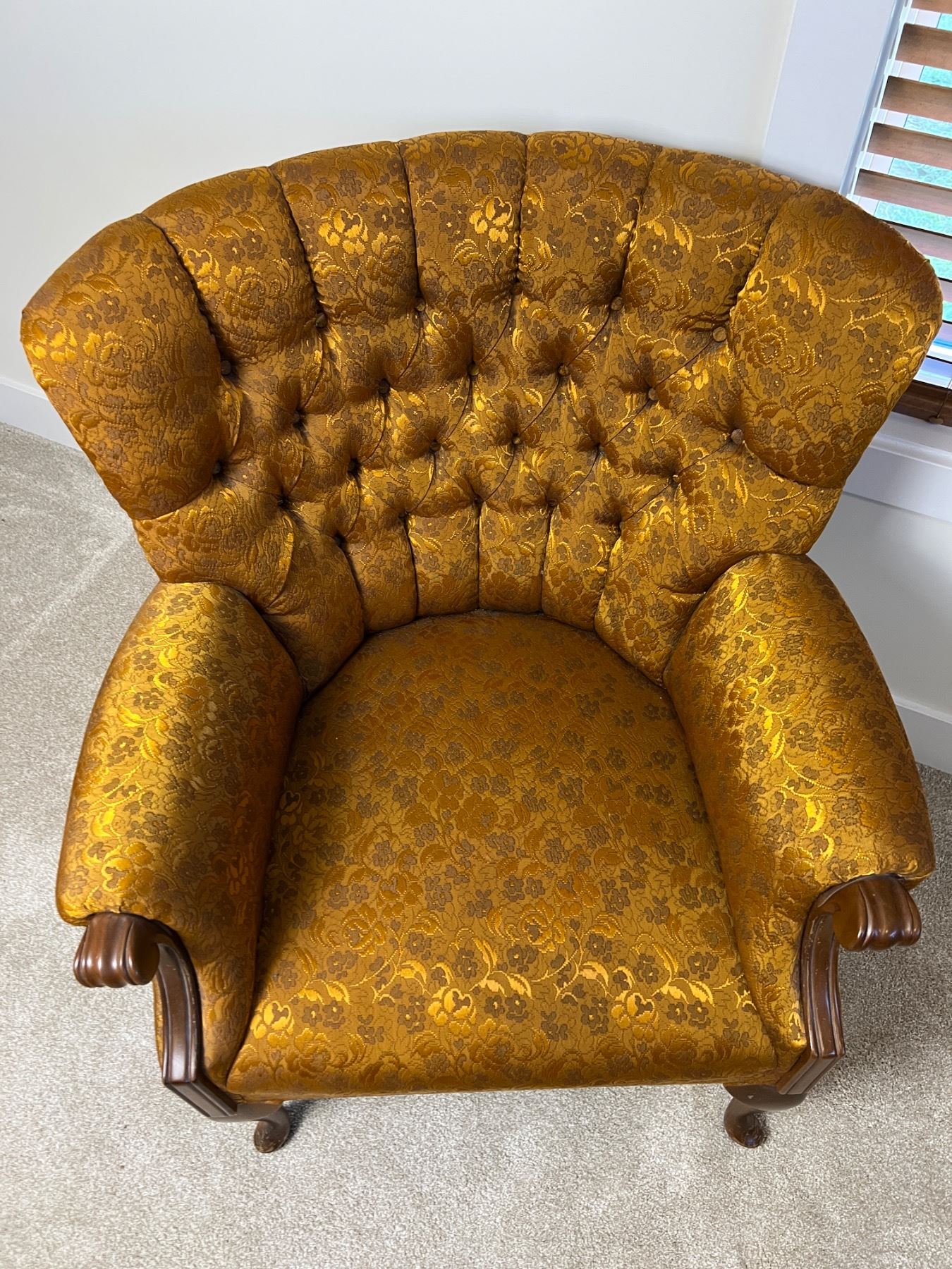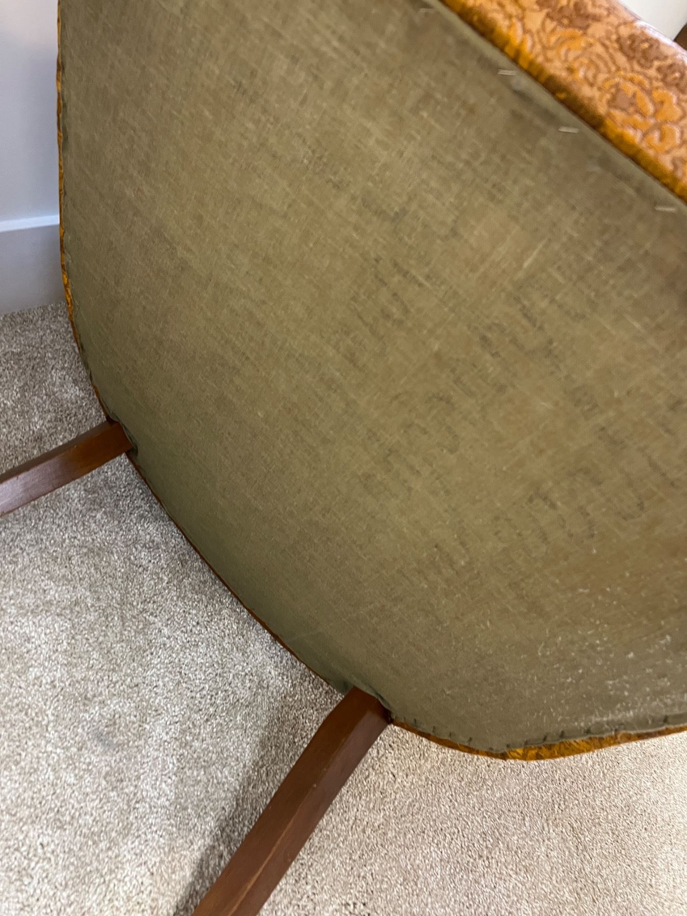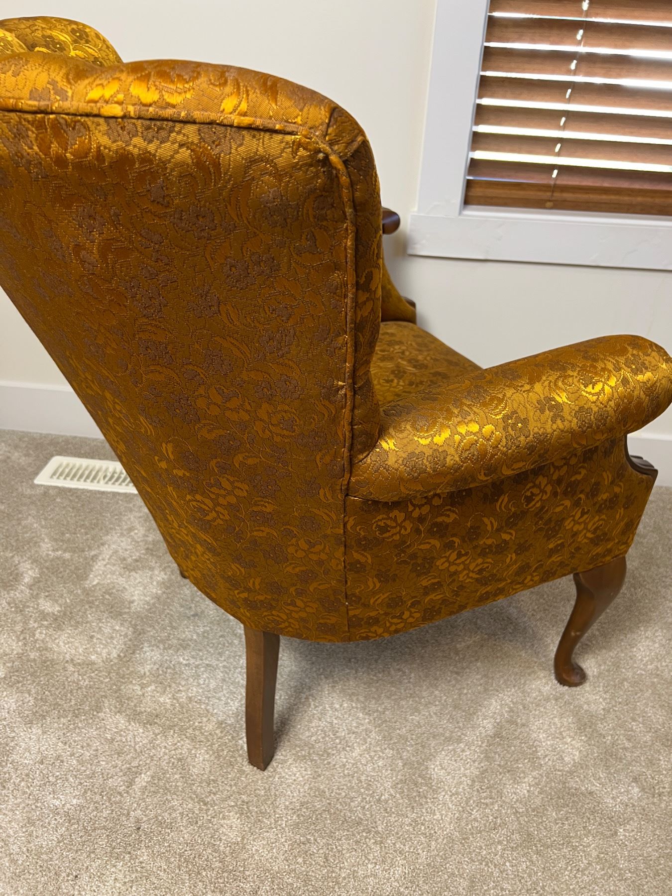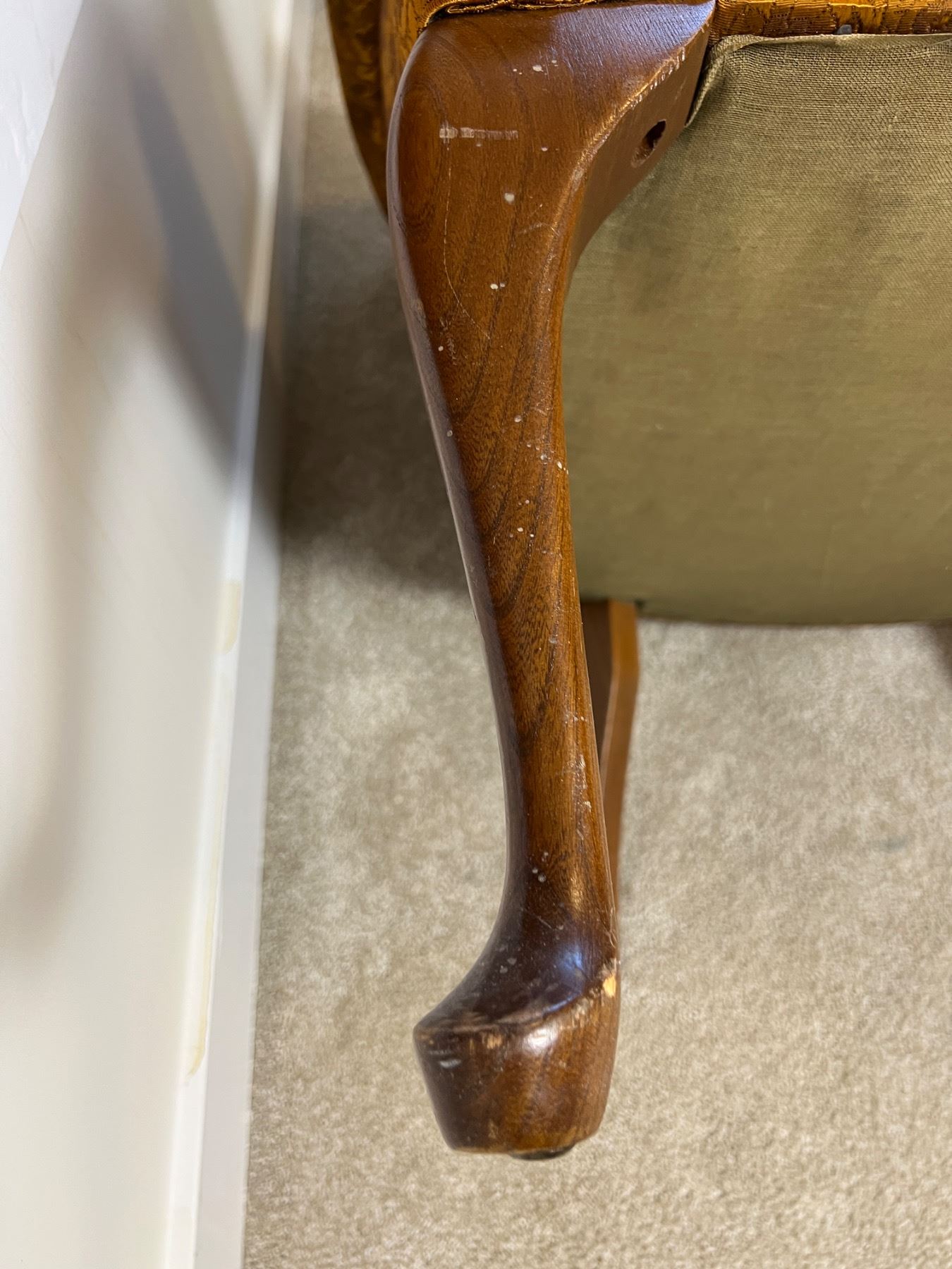 Foam is in good condition, some scuffs and wear on the wooden chair legs, 30"L x 28"D x 34"H