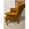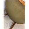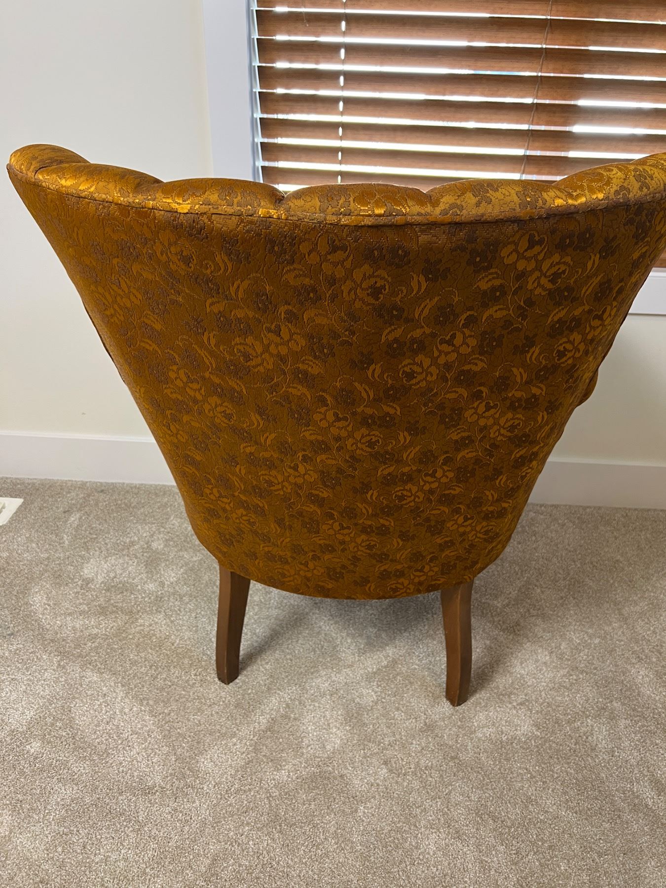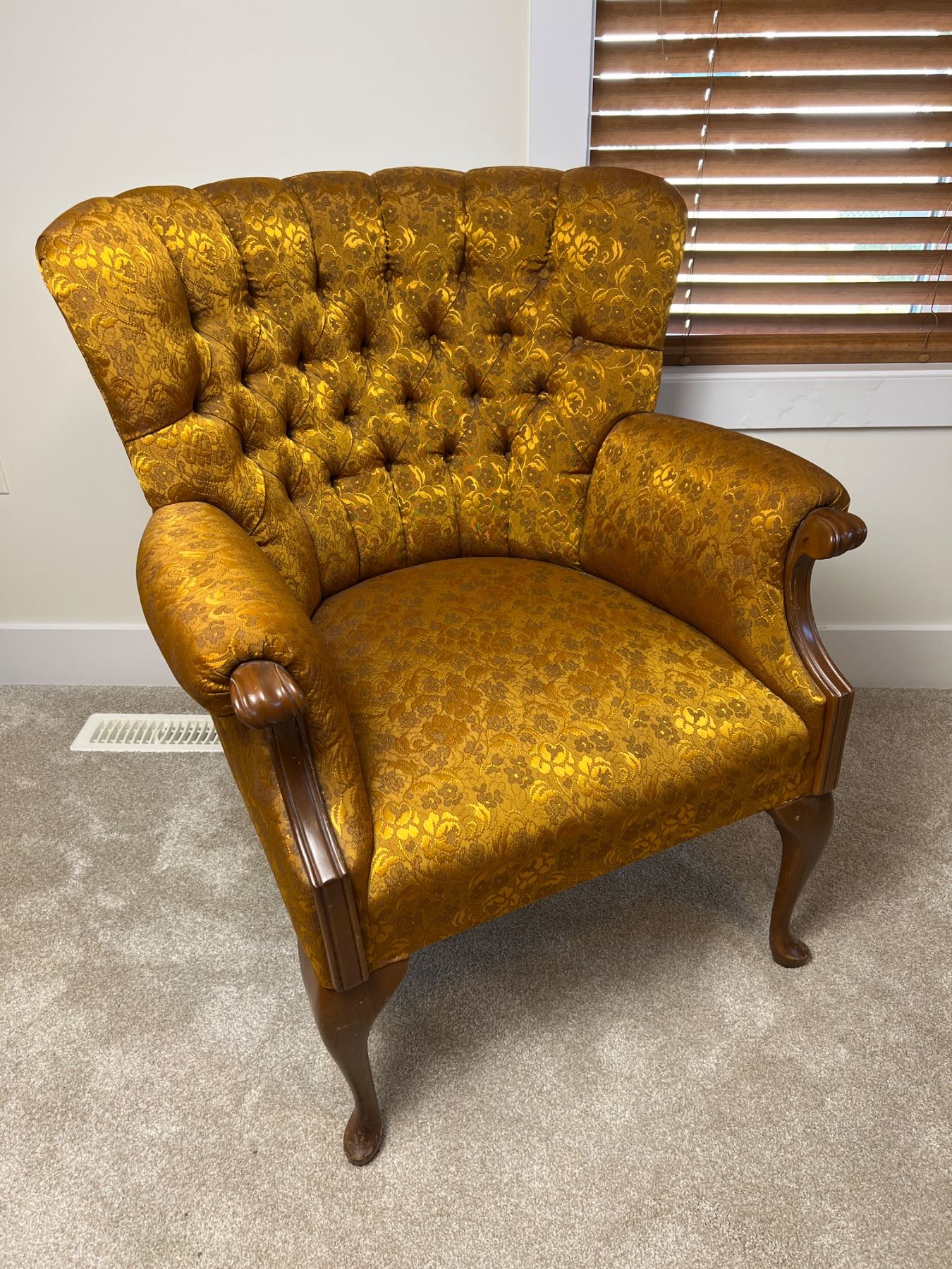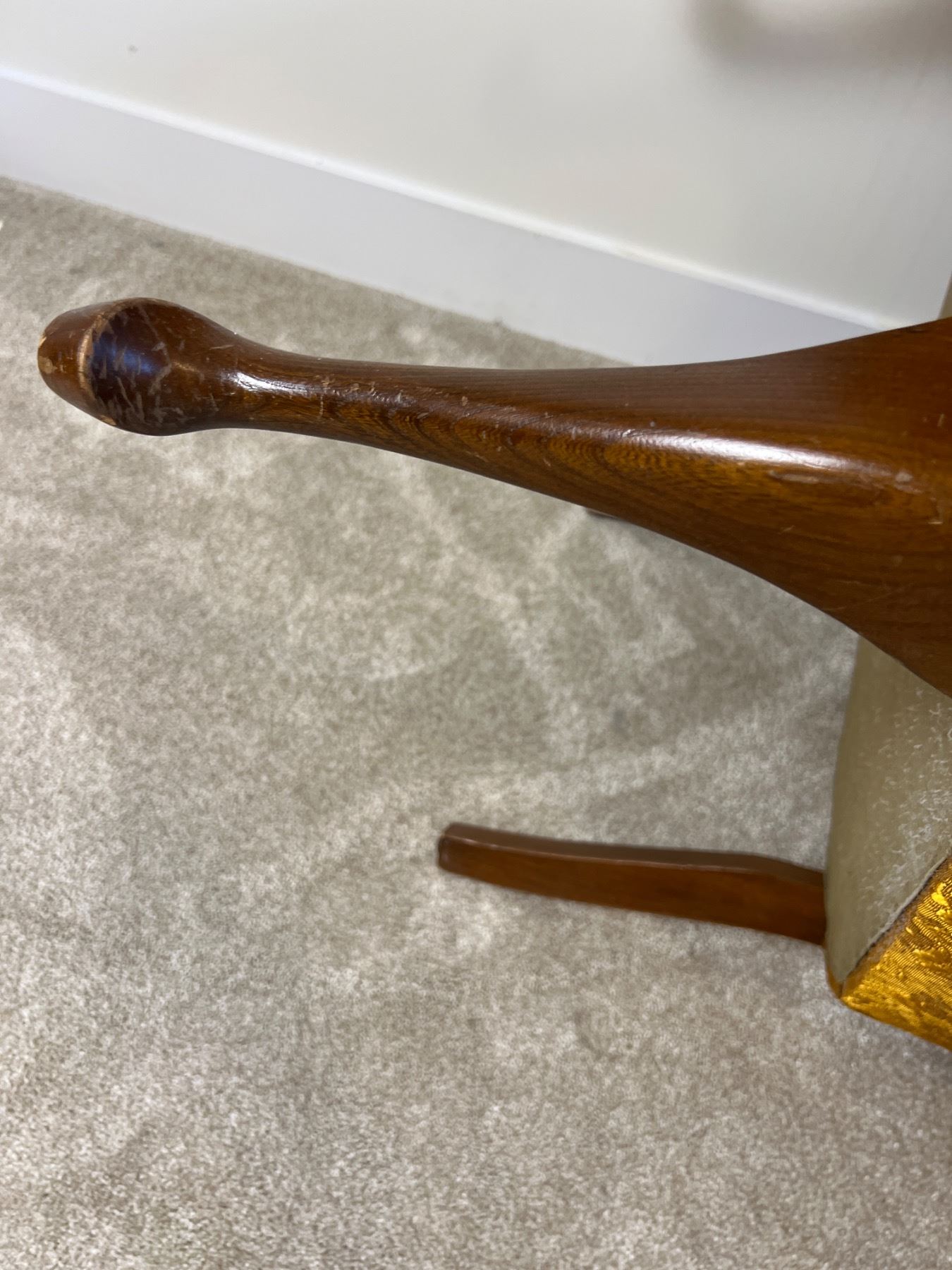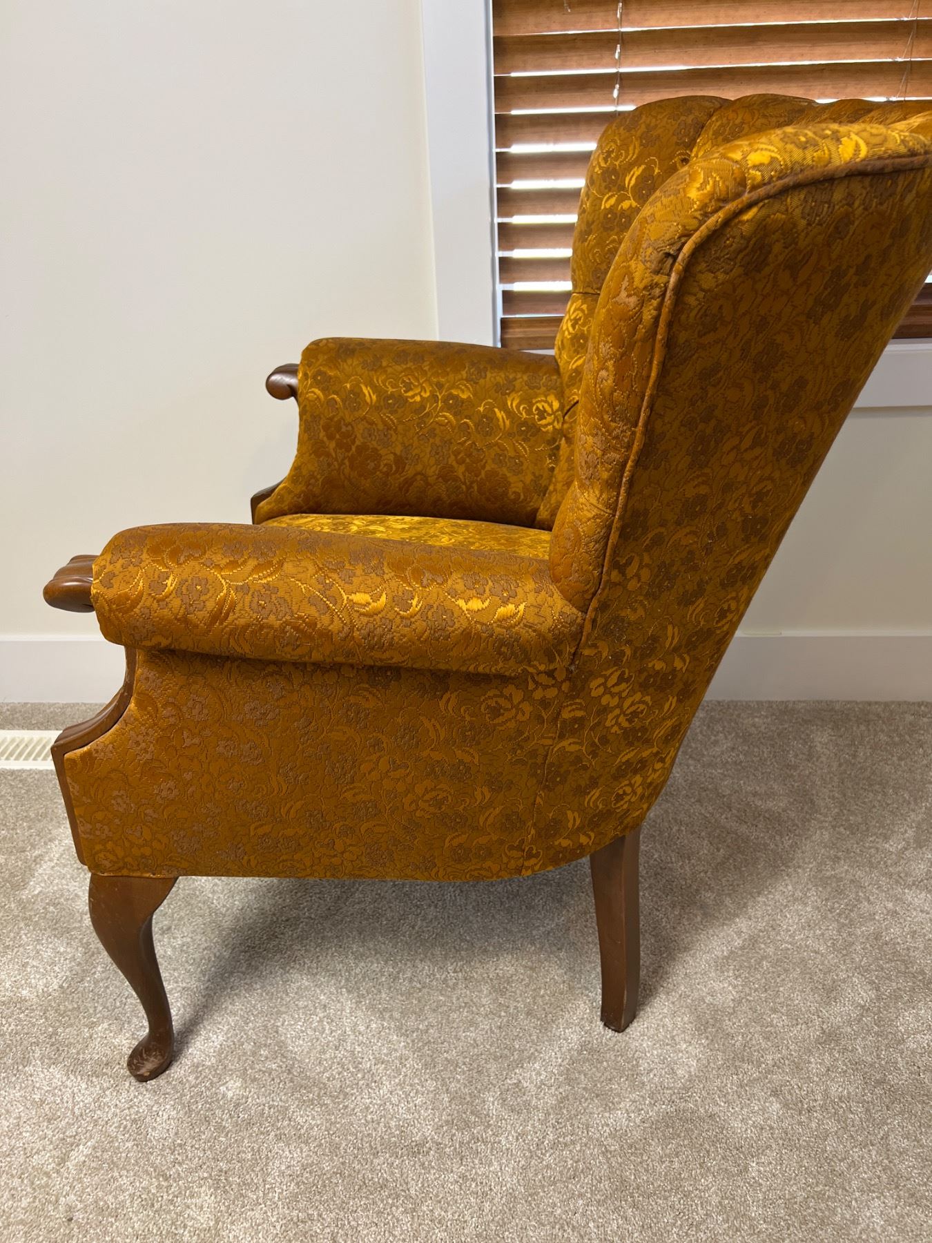 Foam is in good condition, some scuffs and wear on the wooden chair legs, 30"L x 28"D x 34"H
