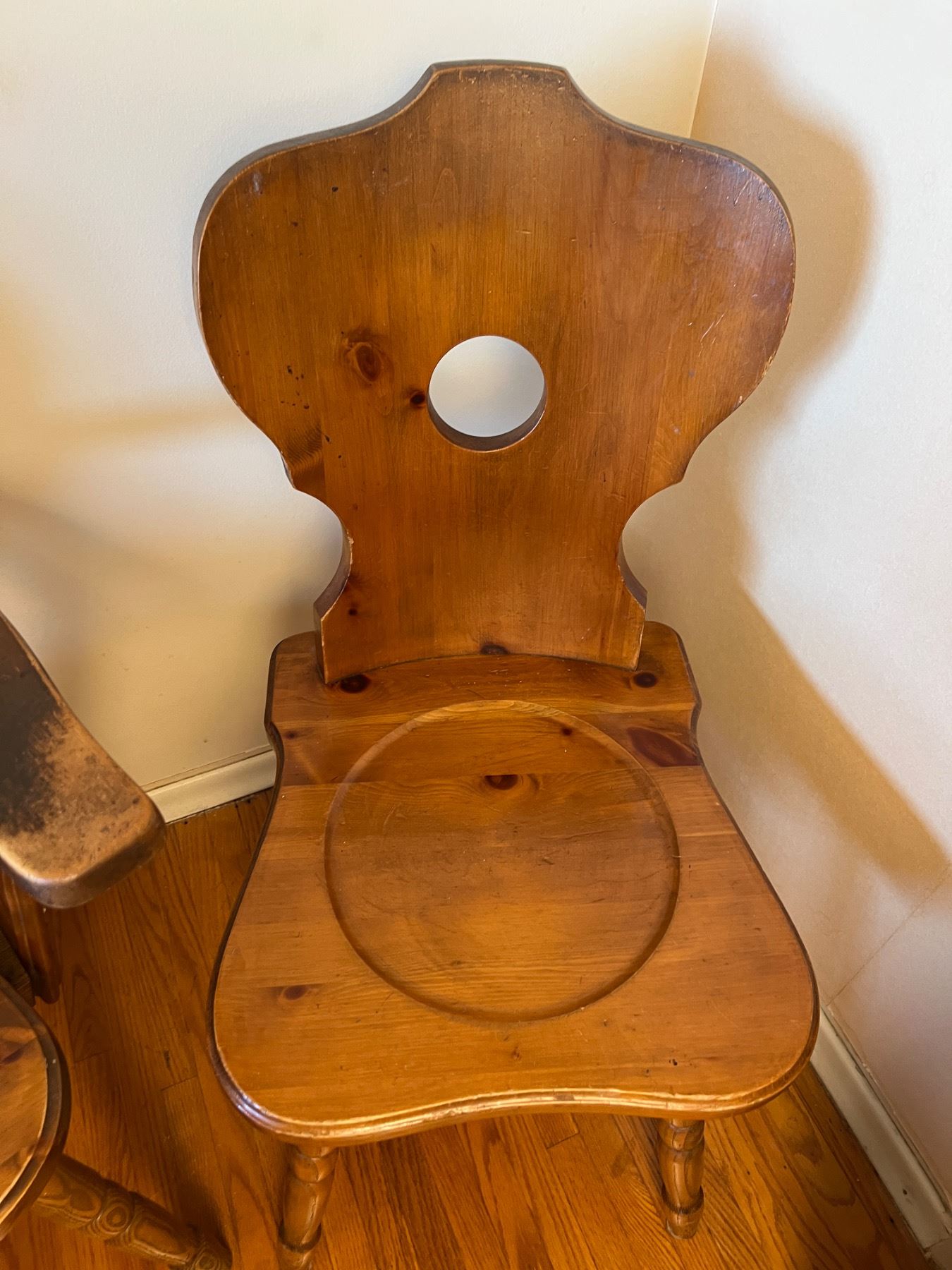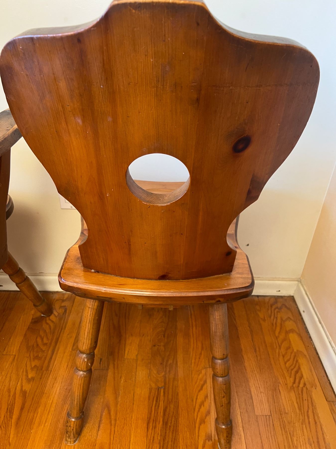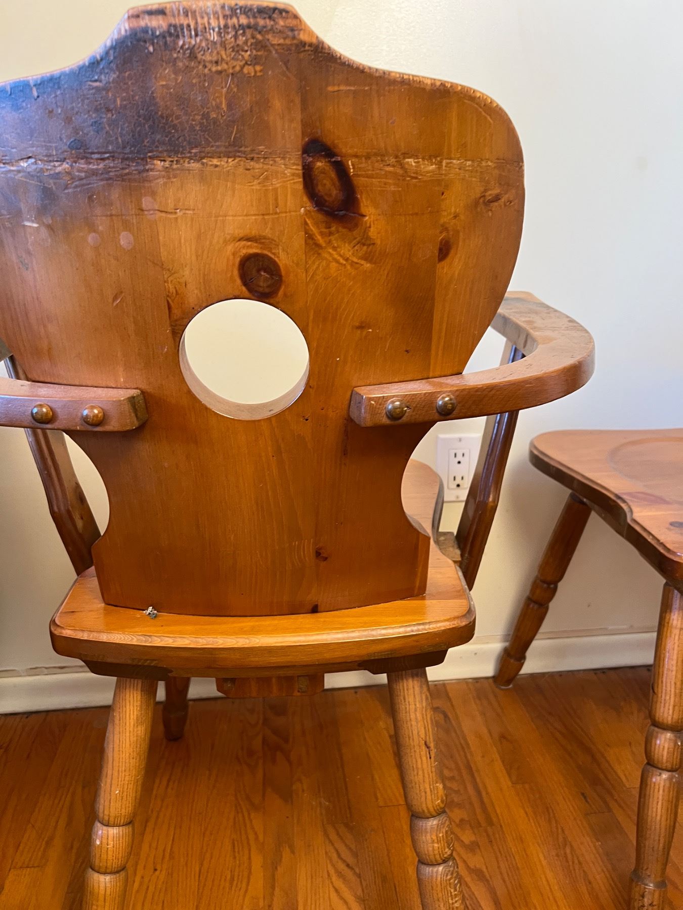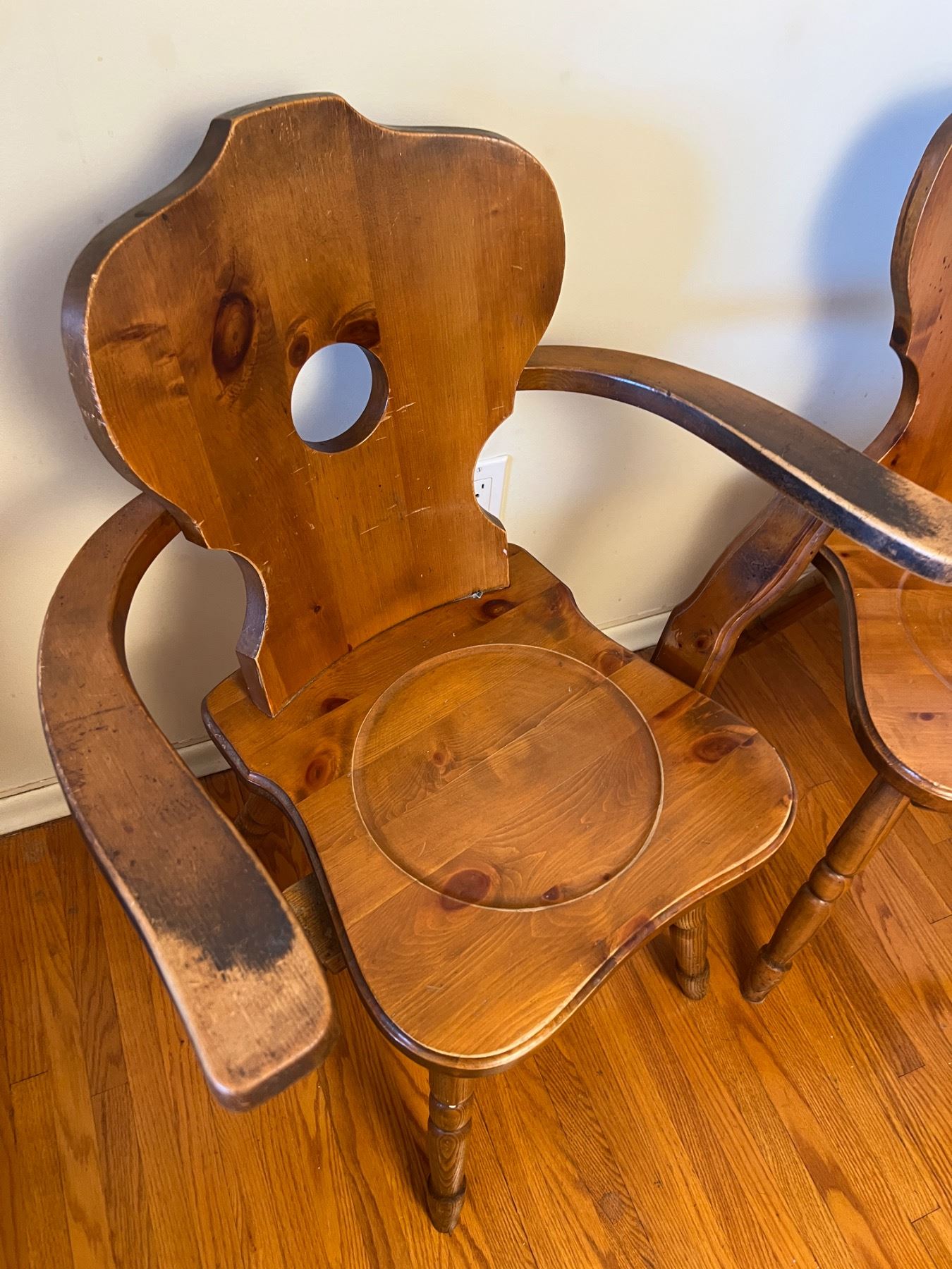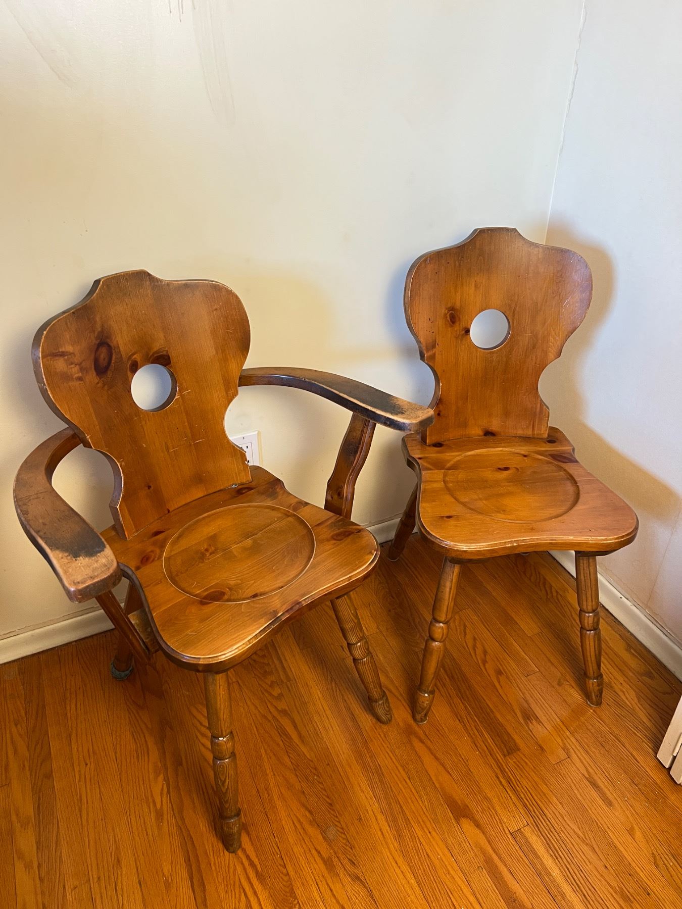Both chairs have some scuffs and wear, the armchair measures 24"L x 17"W x 33"H